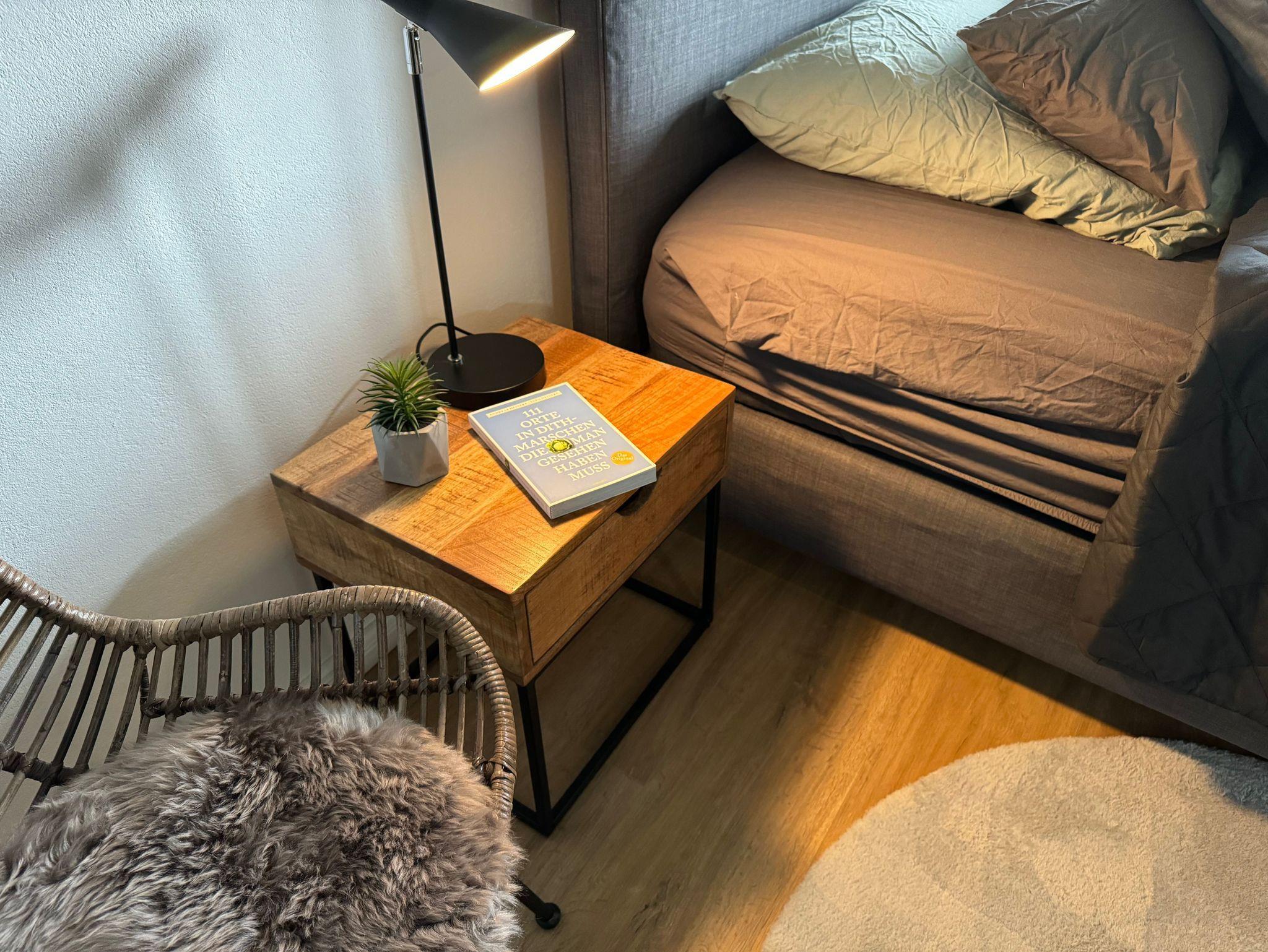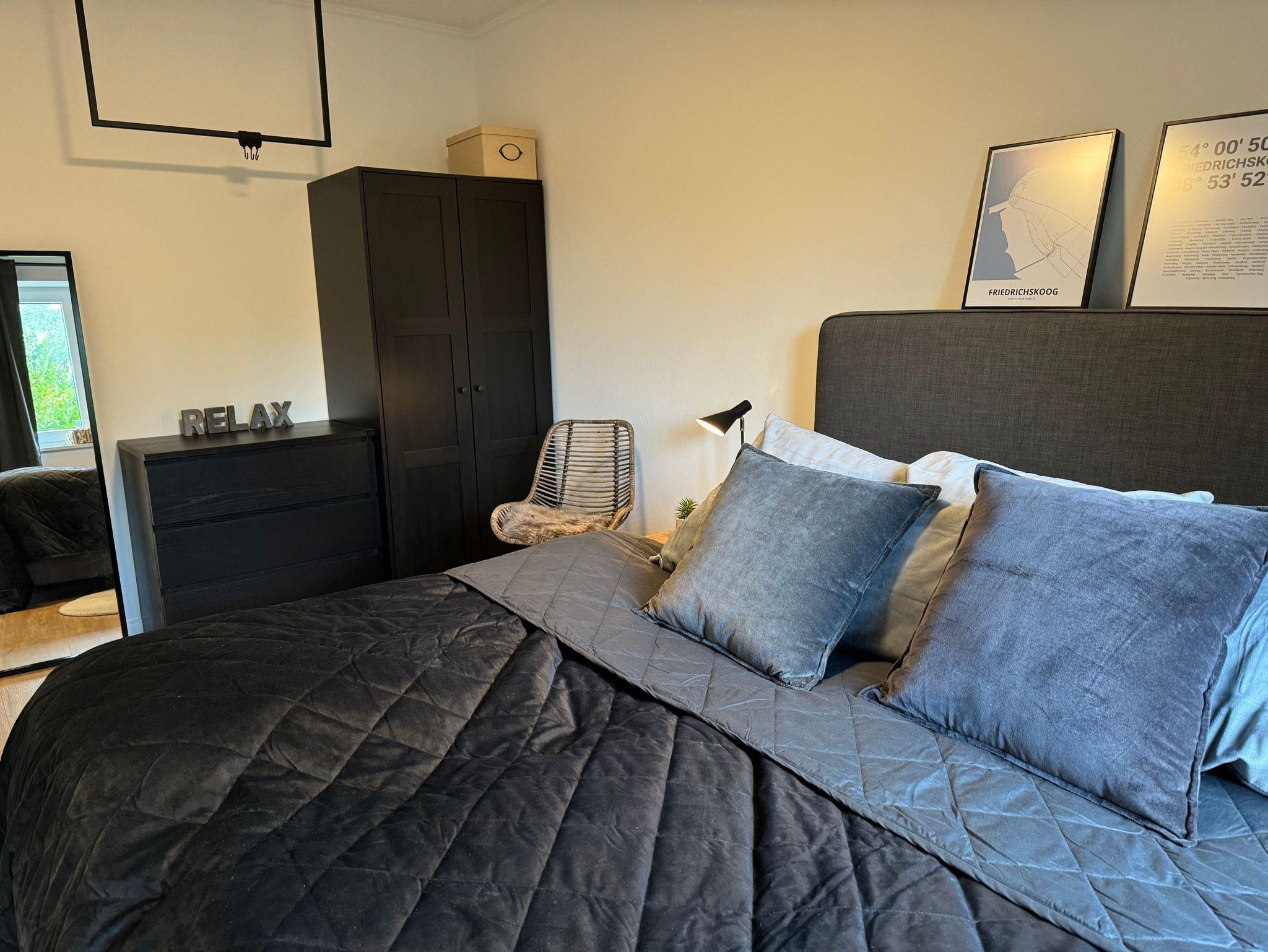 Das Schlafzimmer besticht durch sein behagliches Ambiente und bietet einen erholsamen Rückzugsort. Ausgestattet mit einem 1,80/2,00 Boxspringbett, einem geräumigen Kleiderschrank, einer Kommode und Kleiderständer, können Sie hier in Ruhe entspannen und die frische Seeluft in vollen Zügen genießen.
