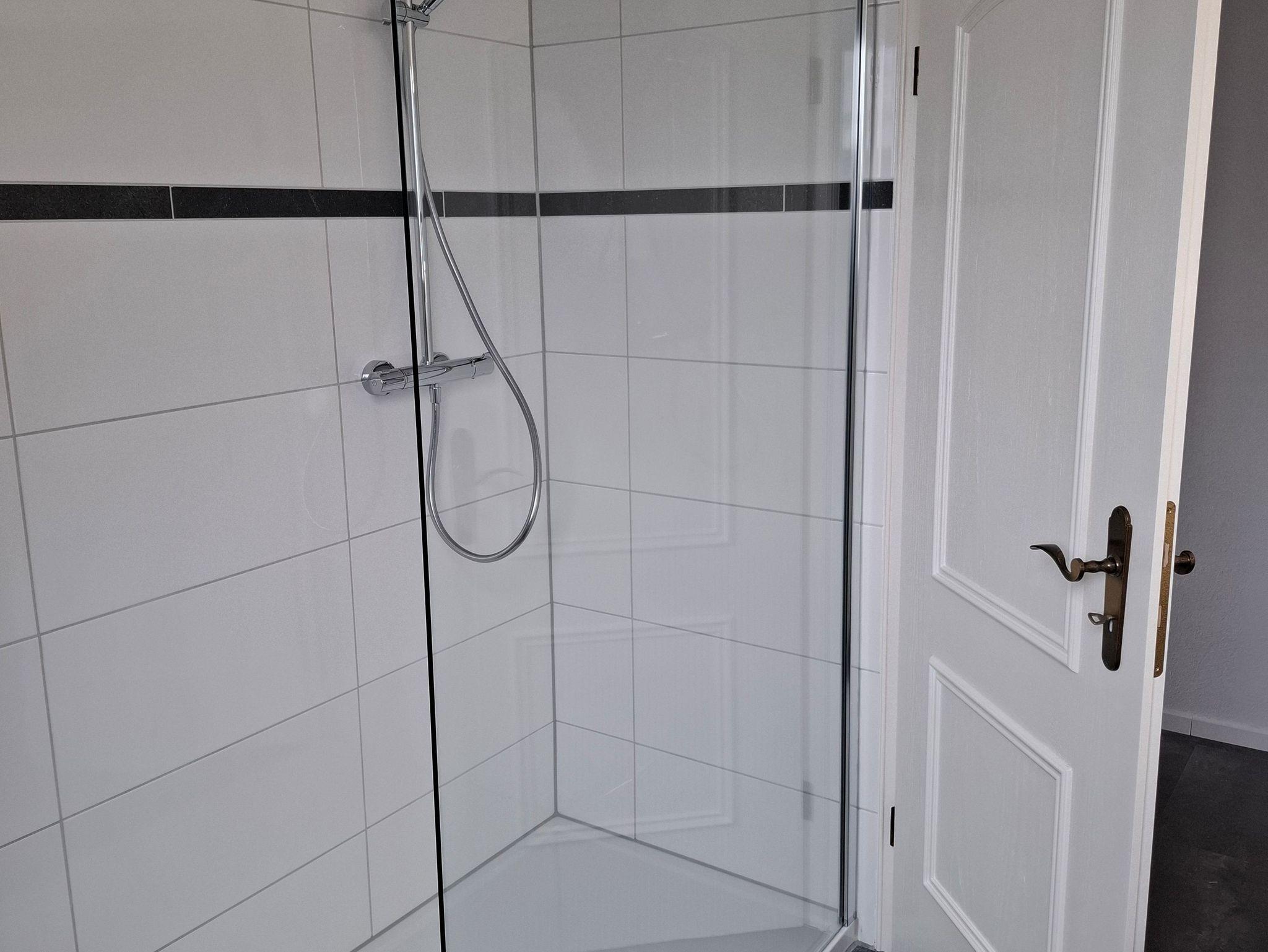 Modernes Duschbad mit bodentiefer Dusche, beleuchtetem Spiegel, Kosmetikspiegel, Fön, Fußbodenheizung und Waschmaschine