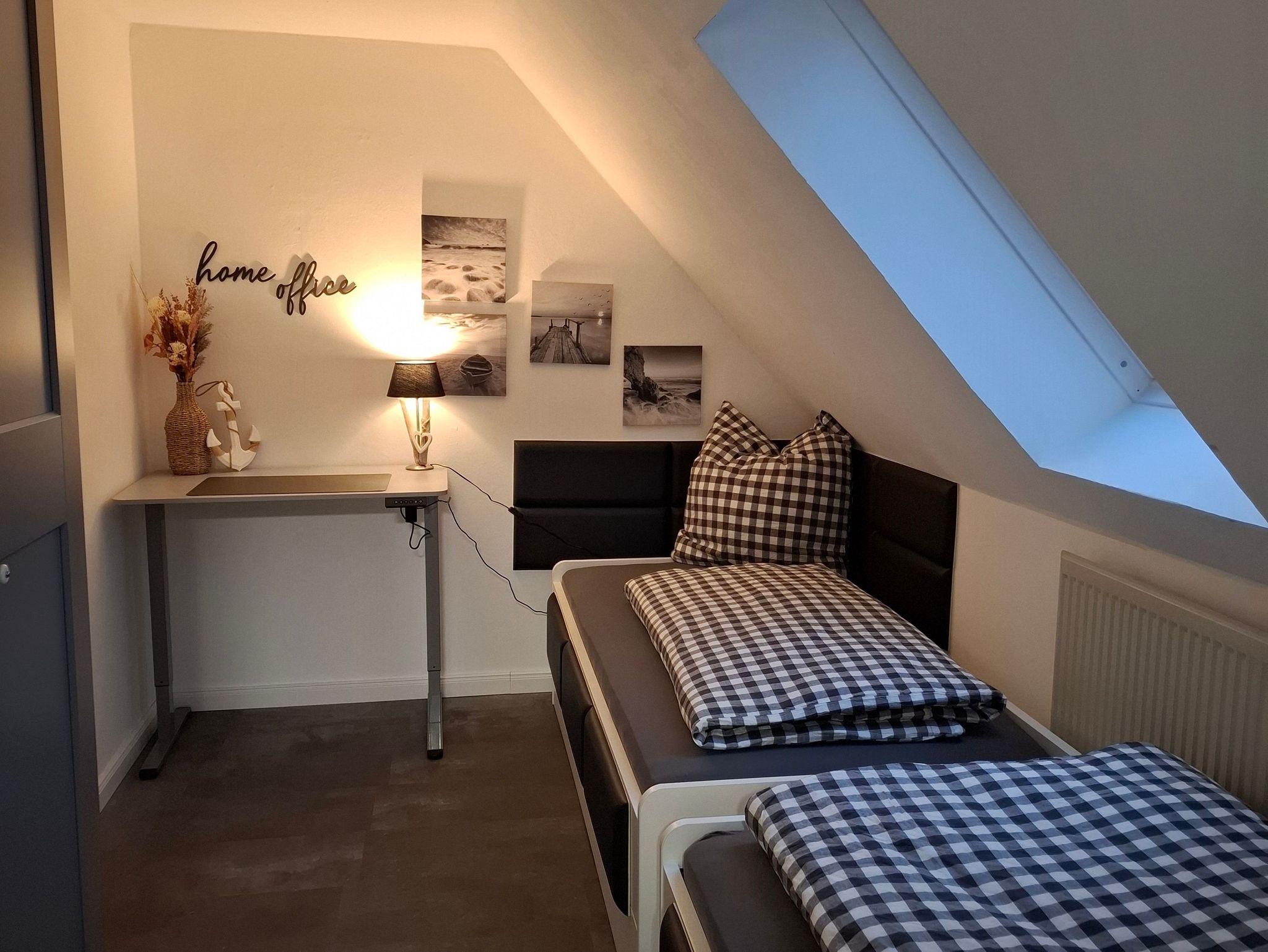 Schlaf-/Arbeitsraum: Zwei Einzelbetten sowie ein Workation-Bereich mit höhenverstellbarem Schreibtisch, ergonomischem Hocker, Bildschirm, Drucker und Lampe