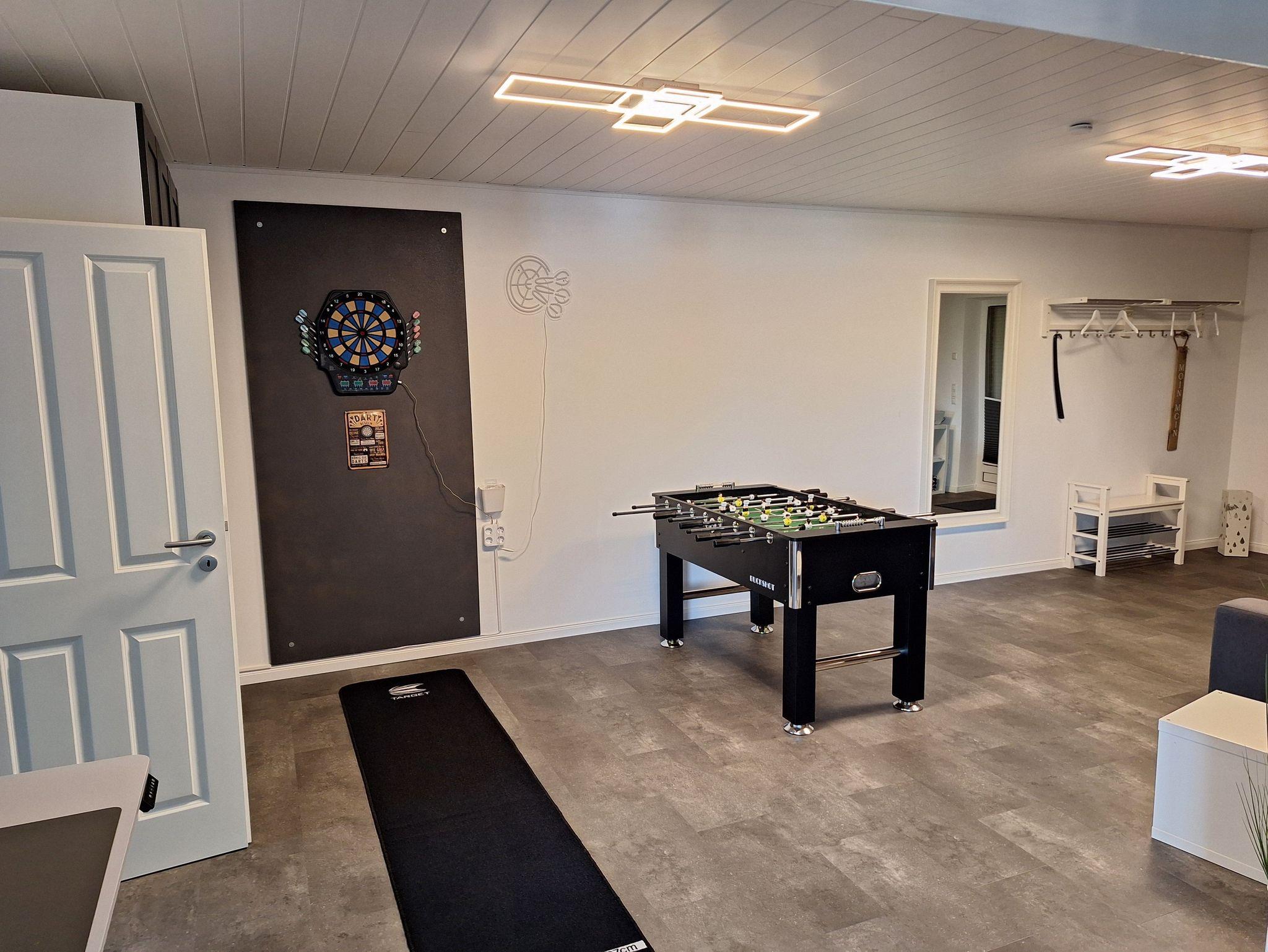 Freizeitraum mit hochwertiger Schlafcouch, Dartscheibe und Tischkicker