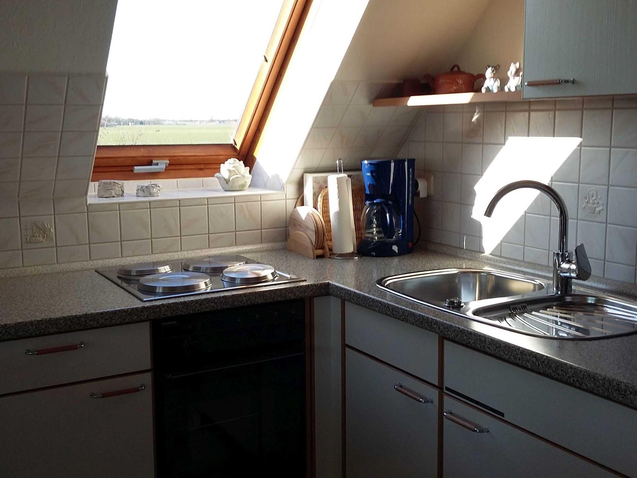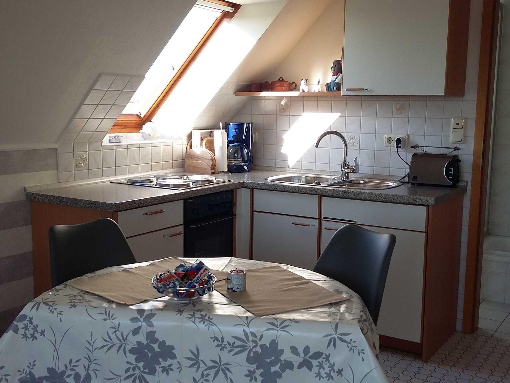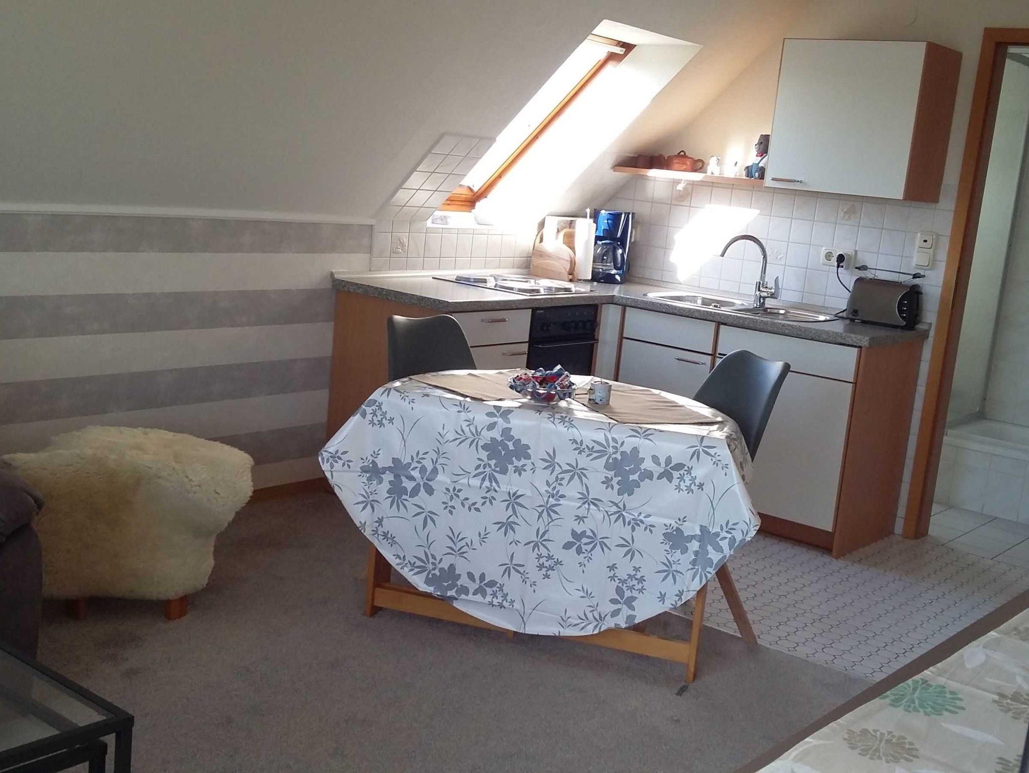 Zur Ausstattung der Wohnung gehören: SAT-TV, Elektroherd mit Backofen, Kühlschrank mit Tiefkühlfach, Kaffeemaschine, Toaster, Wasser- und Eierkocher, Geschirrtücher, Zentralheizung. Wlan-Internet kostenlos.