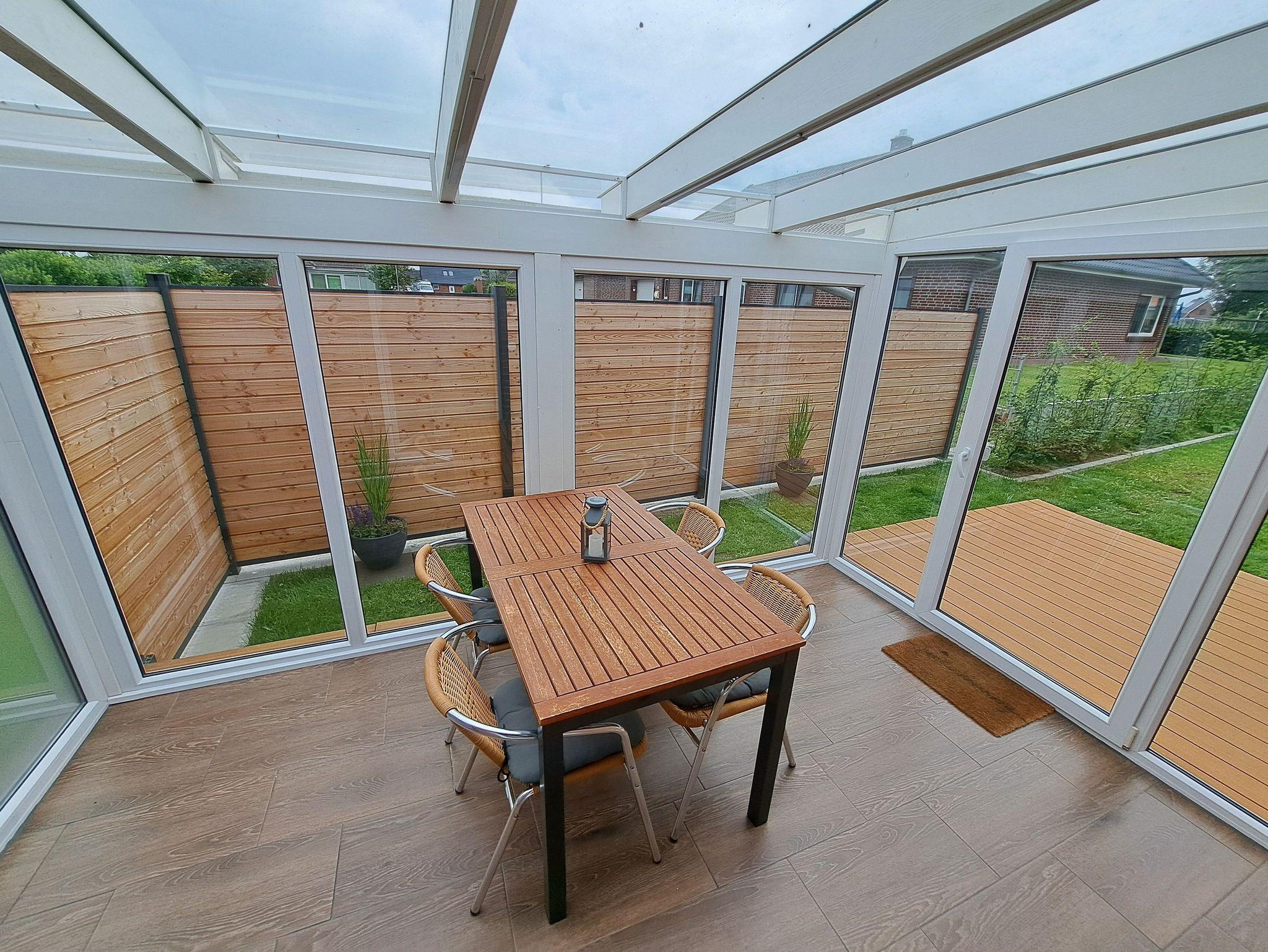 • Terrasse in Süd- Ostausrichtung Wintergarten, möbliert mit weiterer Essgruppe