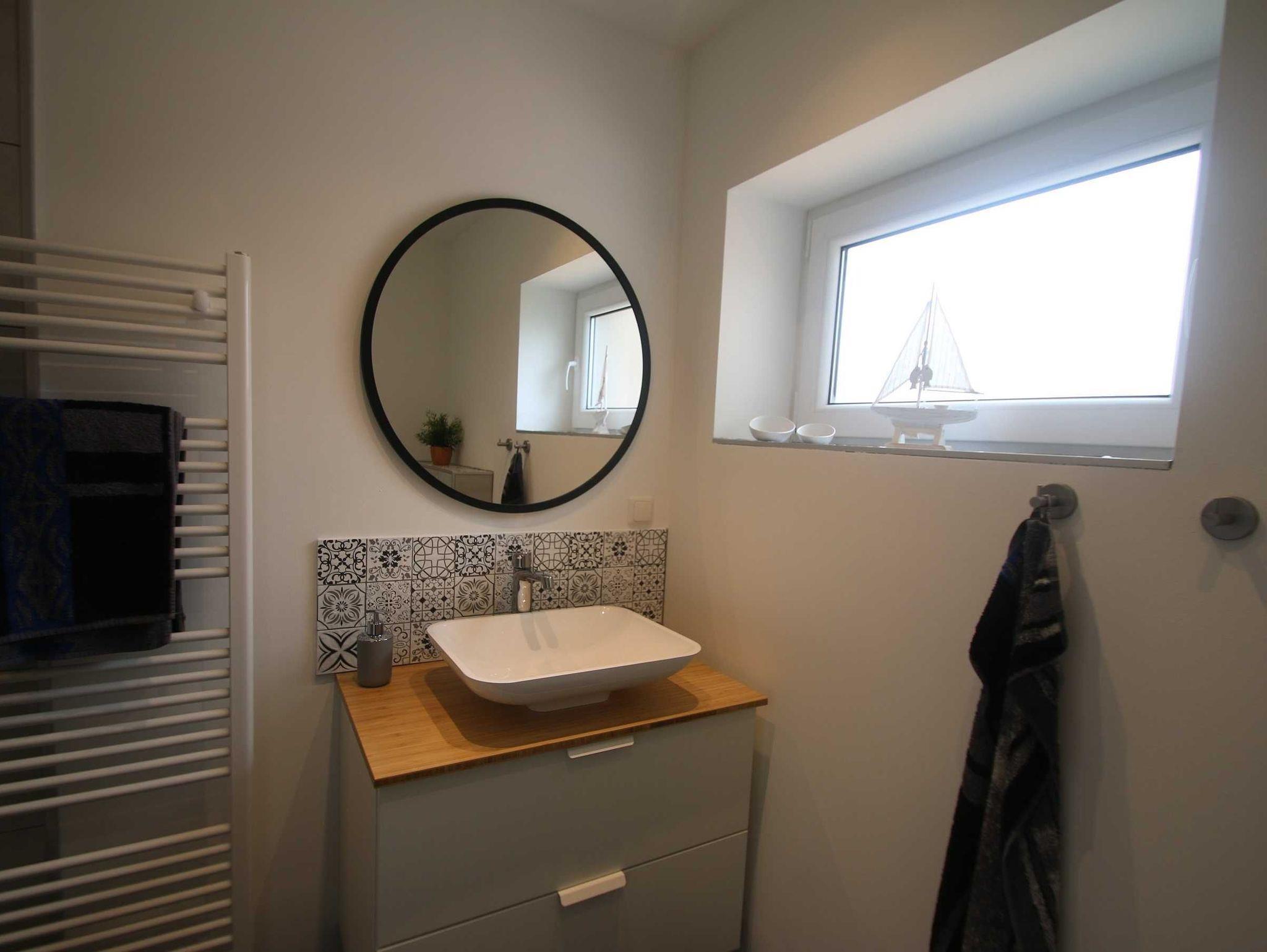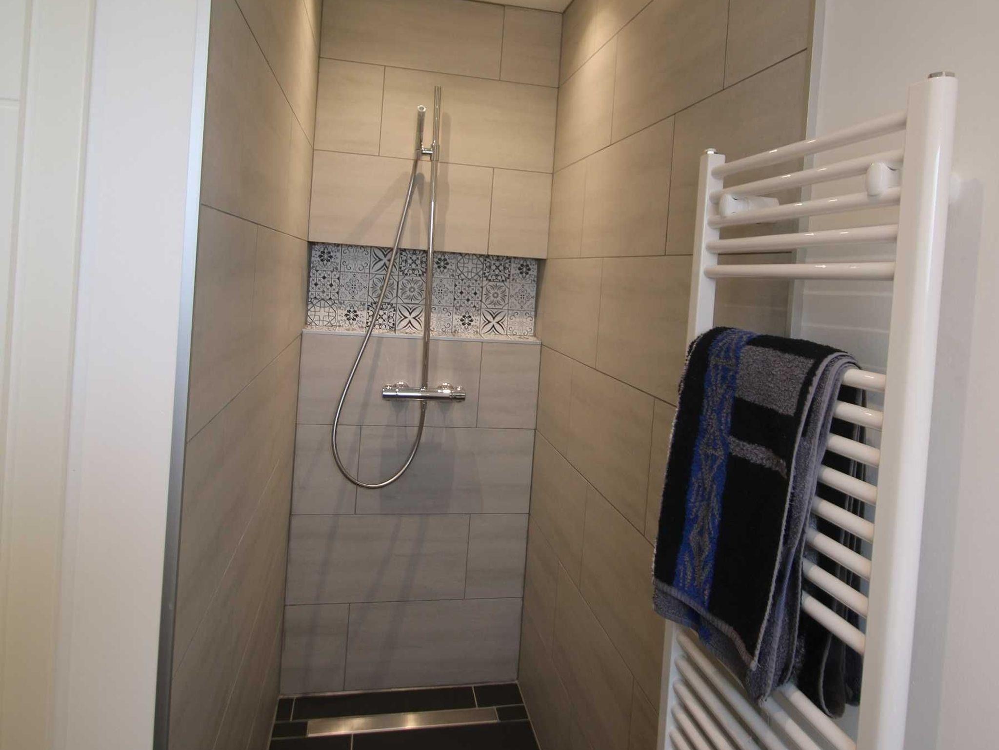 • Duschbad mit ebenerdiger Dusche, Waschtisch, Handtuchheizkörper und WC