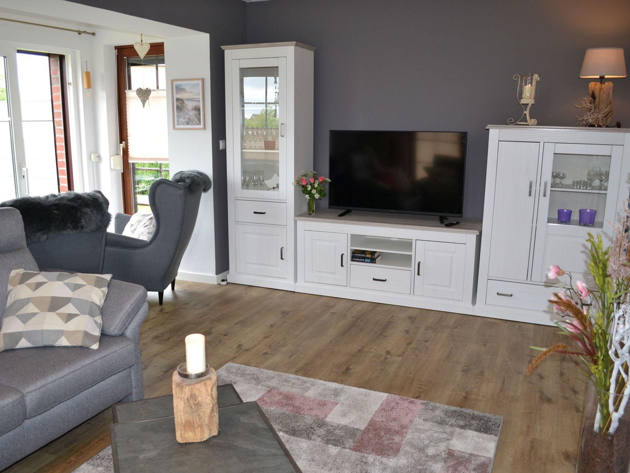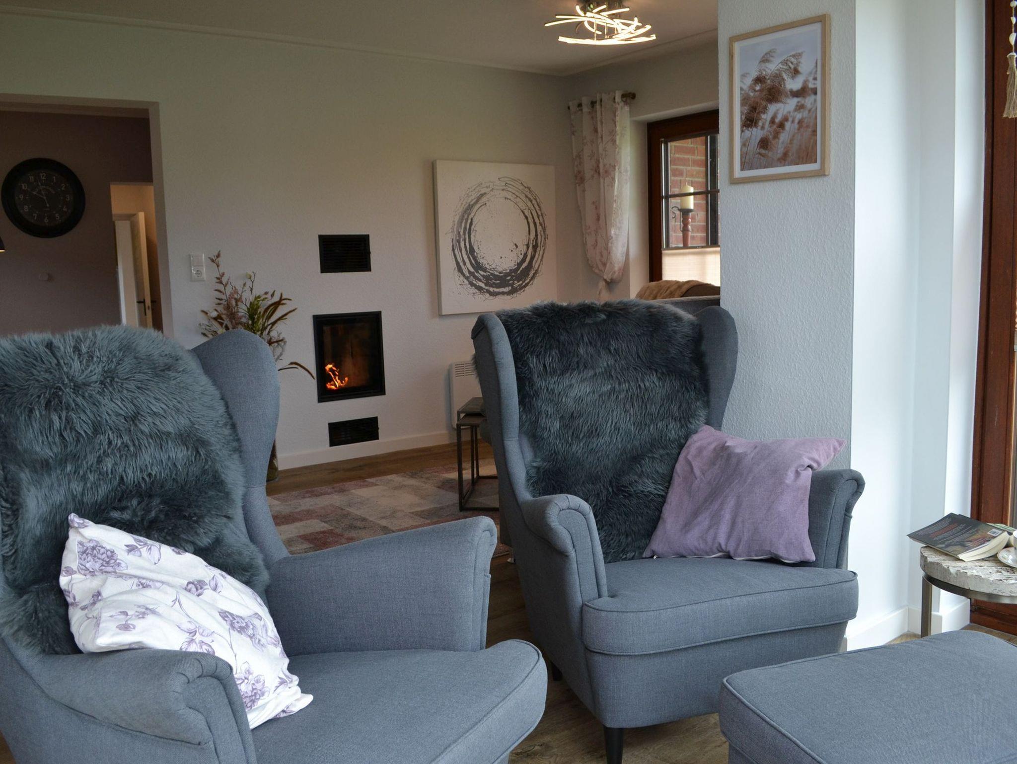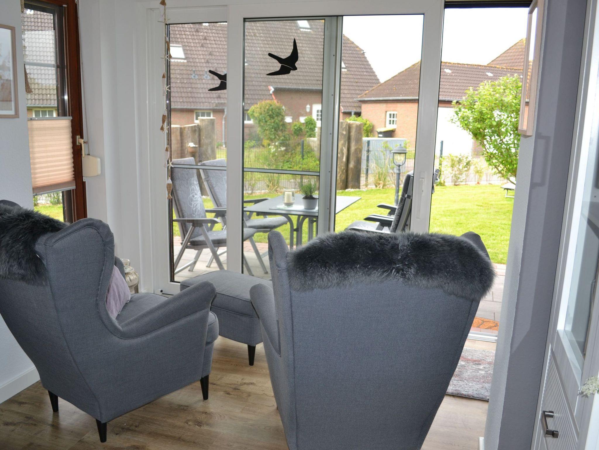 Ferienhaus Nordseeruhe bietet gemütlichen Wohnbereich, moderne Küche, Wintergarten und eingezäunten Garten mit Strandkorb an der Nordseeküste.