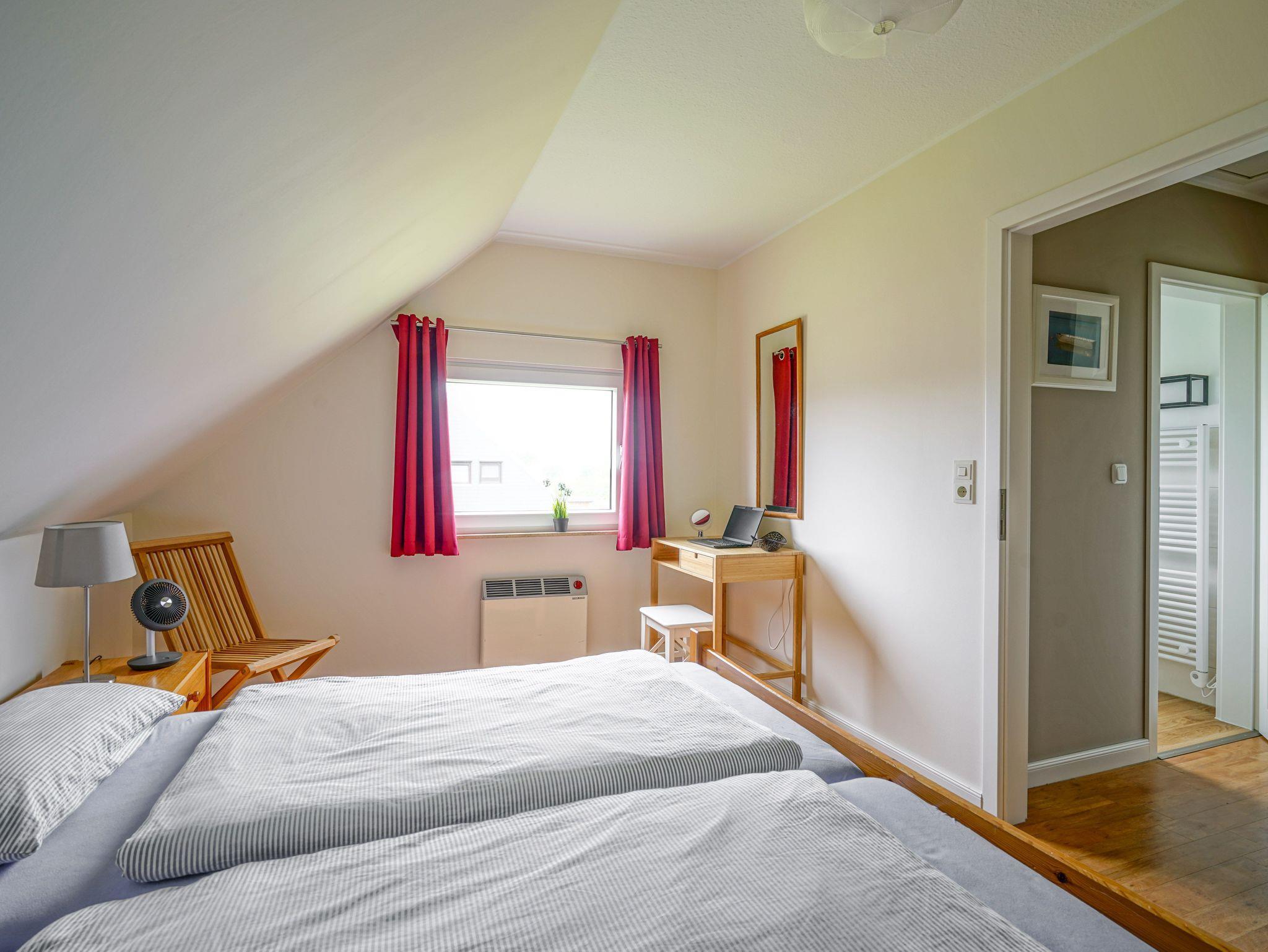 Wendeltreppe ins Dachgeschoss mit einem großem Schlafzimmer mit Doppelbett und Kleinkindbett, geräumigem Schrank und Arbeitsmöglichkeit, einem kleineren Schlafzimmer mit zwei Einzelbetten und Kleiderschrank sowie einem modernen Duschbad mit Regendusche.