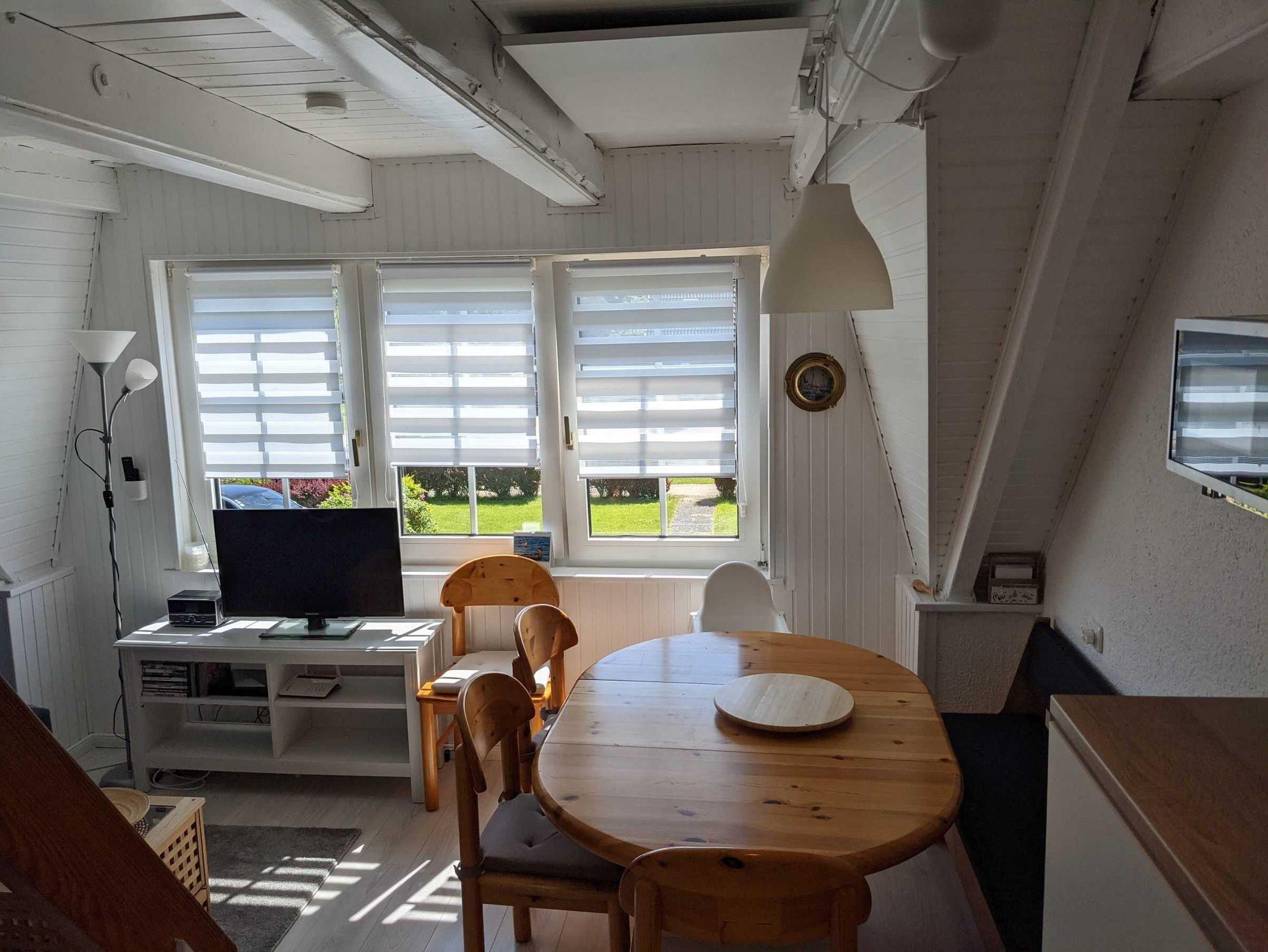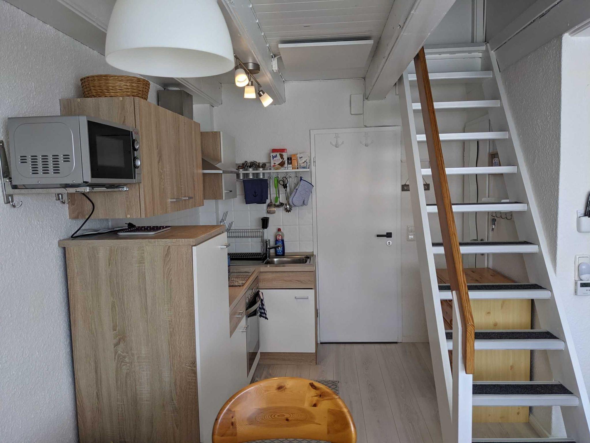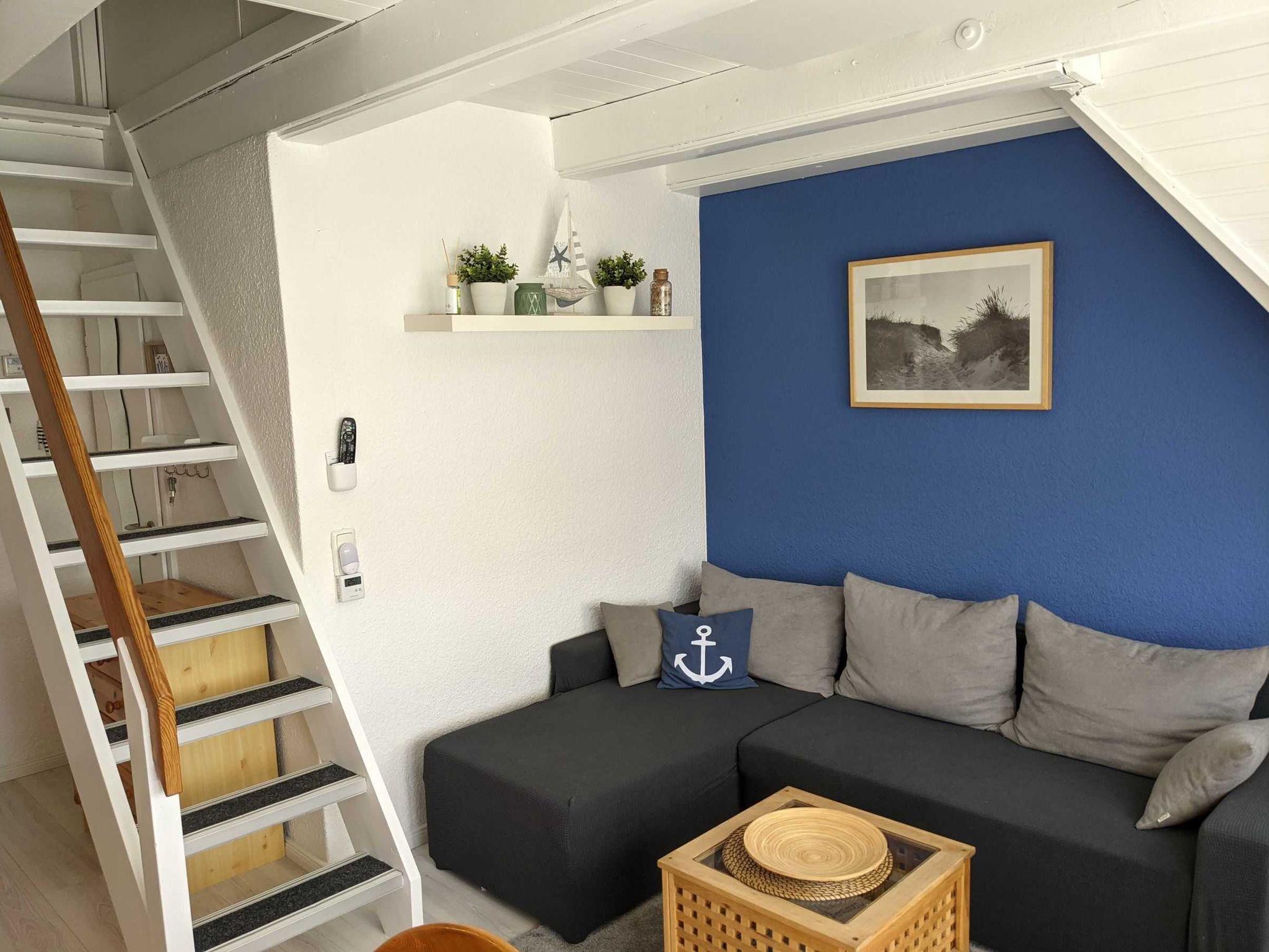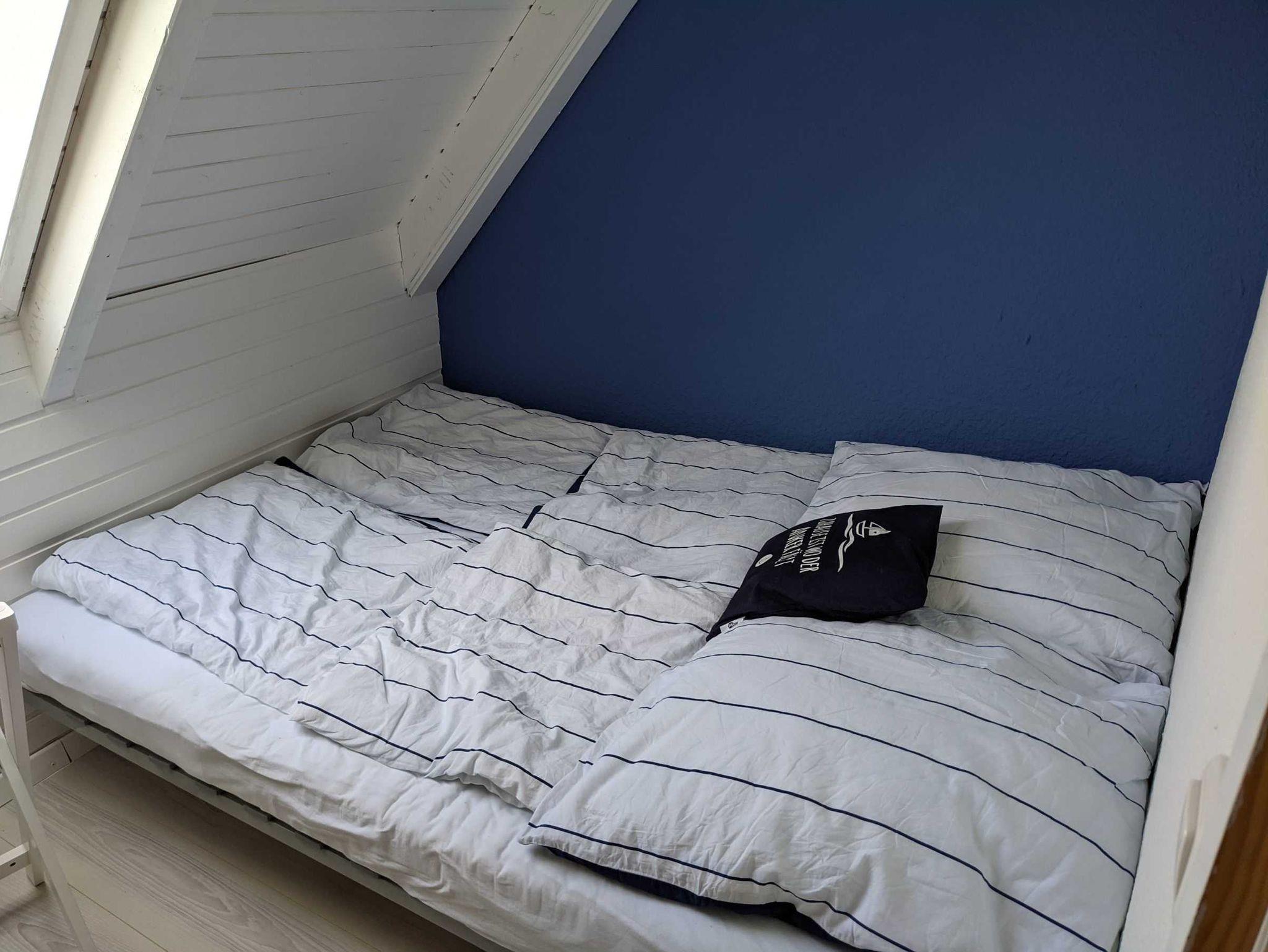 • Im Wohnzimmer führt eine steile Treppe hinauf in das ausgebaute Dachgeschoss. Hier befinden sich zwei Schlafbereiche - mit je einem Doppelbett (140 x 200 und 120 x 200) - die durch eine Wand voneinander getrennt sind. Eine Kommode sowie zwei Einbauschränke sorgen für genügend Stauraum.