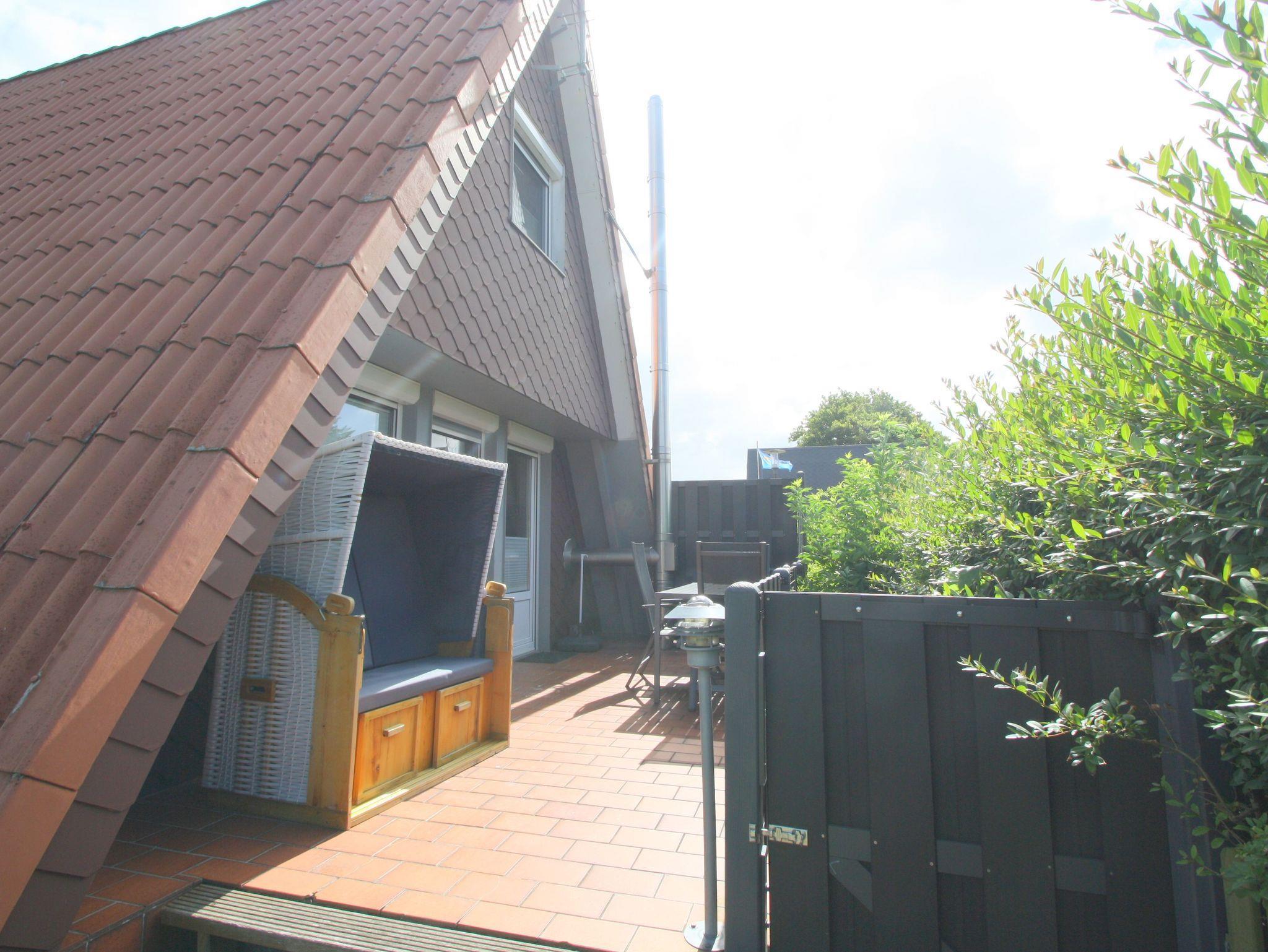 schöne Terrasse, Grillkamin, Gartenmöbel, Strandkorb,