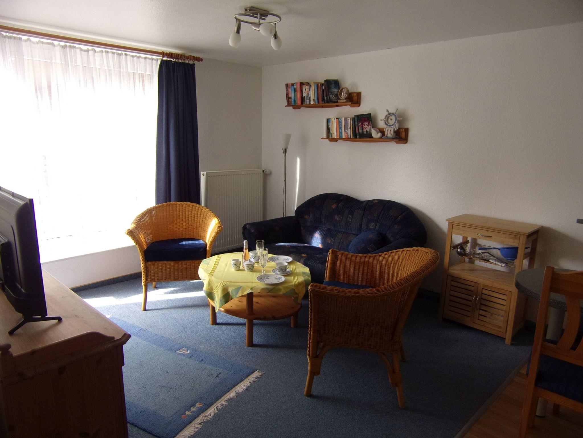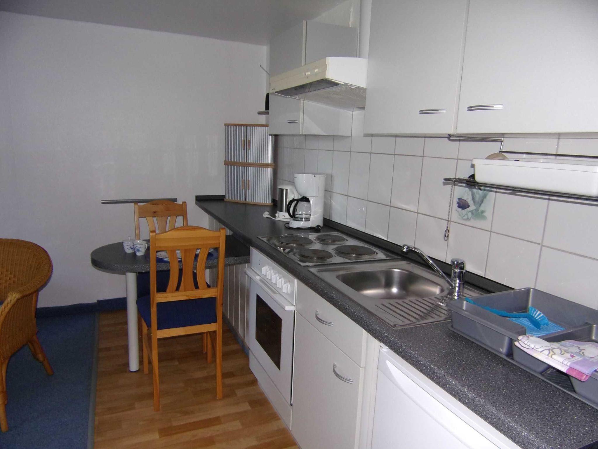 • Duschbad/WC, Kleine gemütlich eingerichtete Ferienwohnung im Erdgeschoß. Die Möblierung ist geschmackvoll in nordischer Kiefer und im maritimen Blau gehalten. Die Wohnung ist mit Teppichboden ausgelegt.