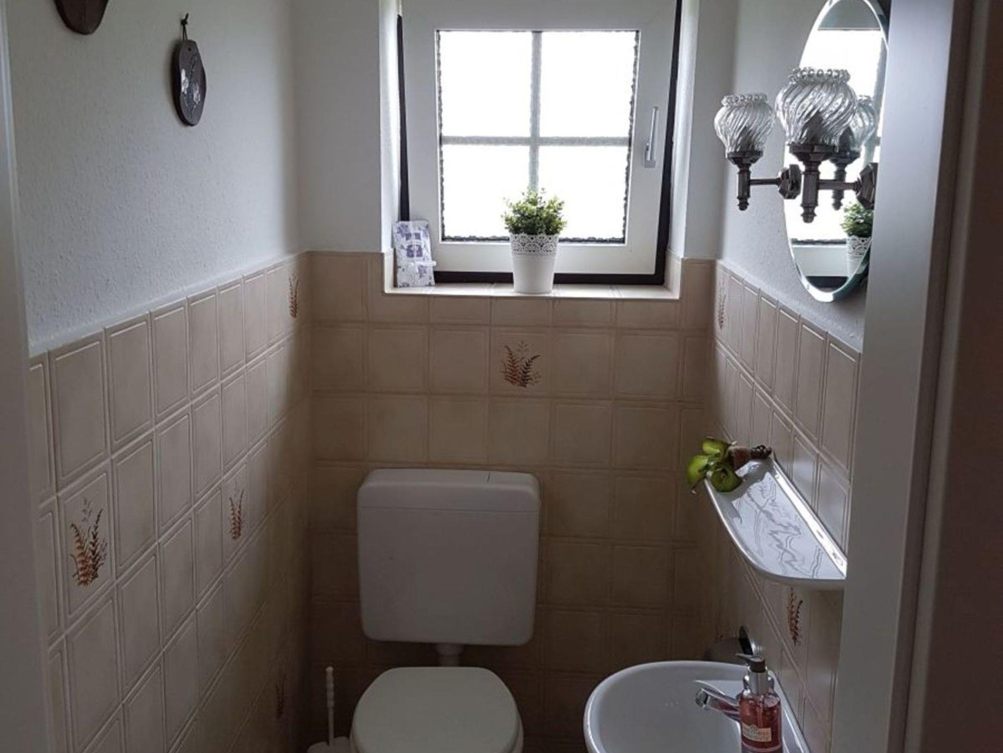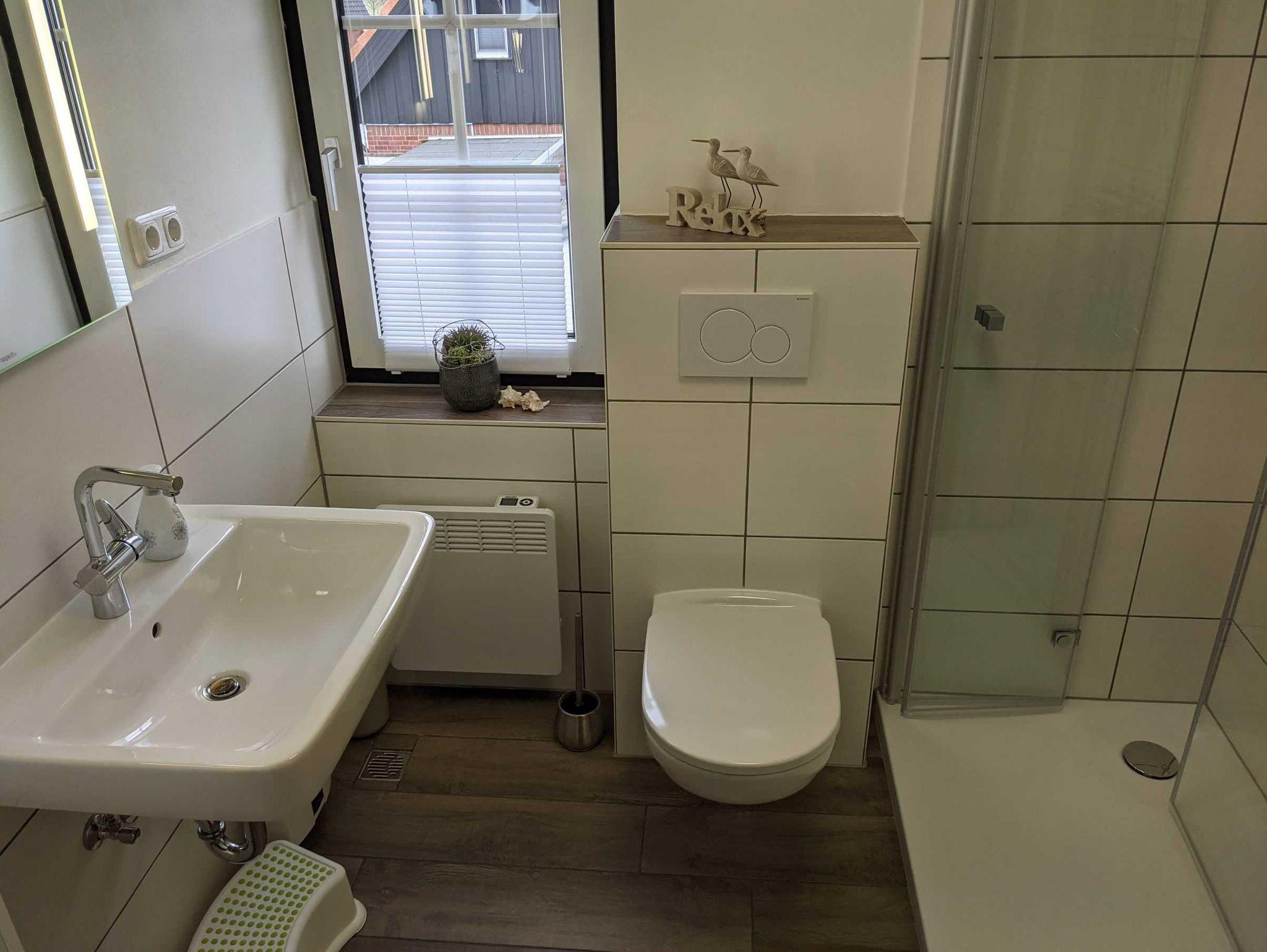 Im Erdgeschoss befindet sich ein WC mit Waschbecken, ein Abstellraum mit Waschmaschine, die Terrasse mit Gartenmöbeln, Spiel-/Liegewiese, Strandkorb, 2 Fahrräder, Gartengrill runden die Ausstattung ab.