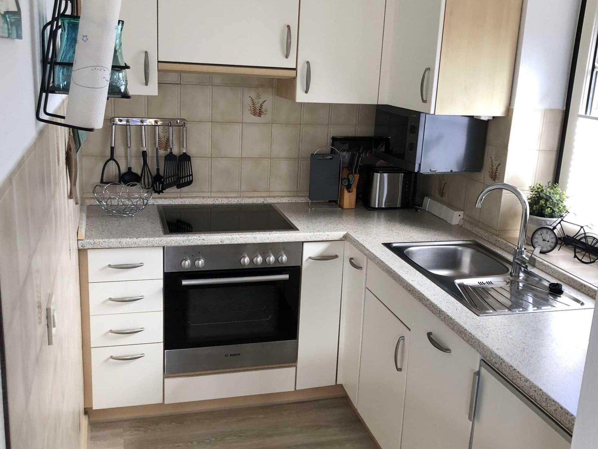Die komplett eingerichtete Küche mit Kühlschrank, 4 Platten-Kochfeld und Backofen, Geschirrspüler, Mikrowelle und diverse Elektrokleingeräte läßt keine Wünsche offen.