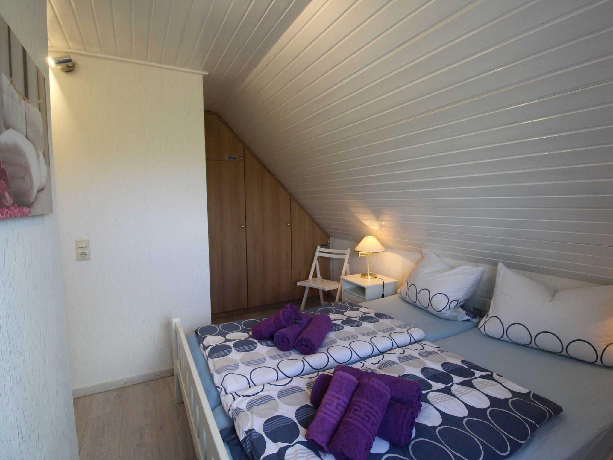 • 1 Schlafraum mit 2 getrennten Betten (1. Stock, Laminatboden)