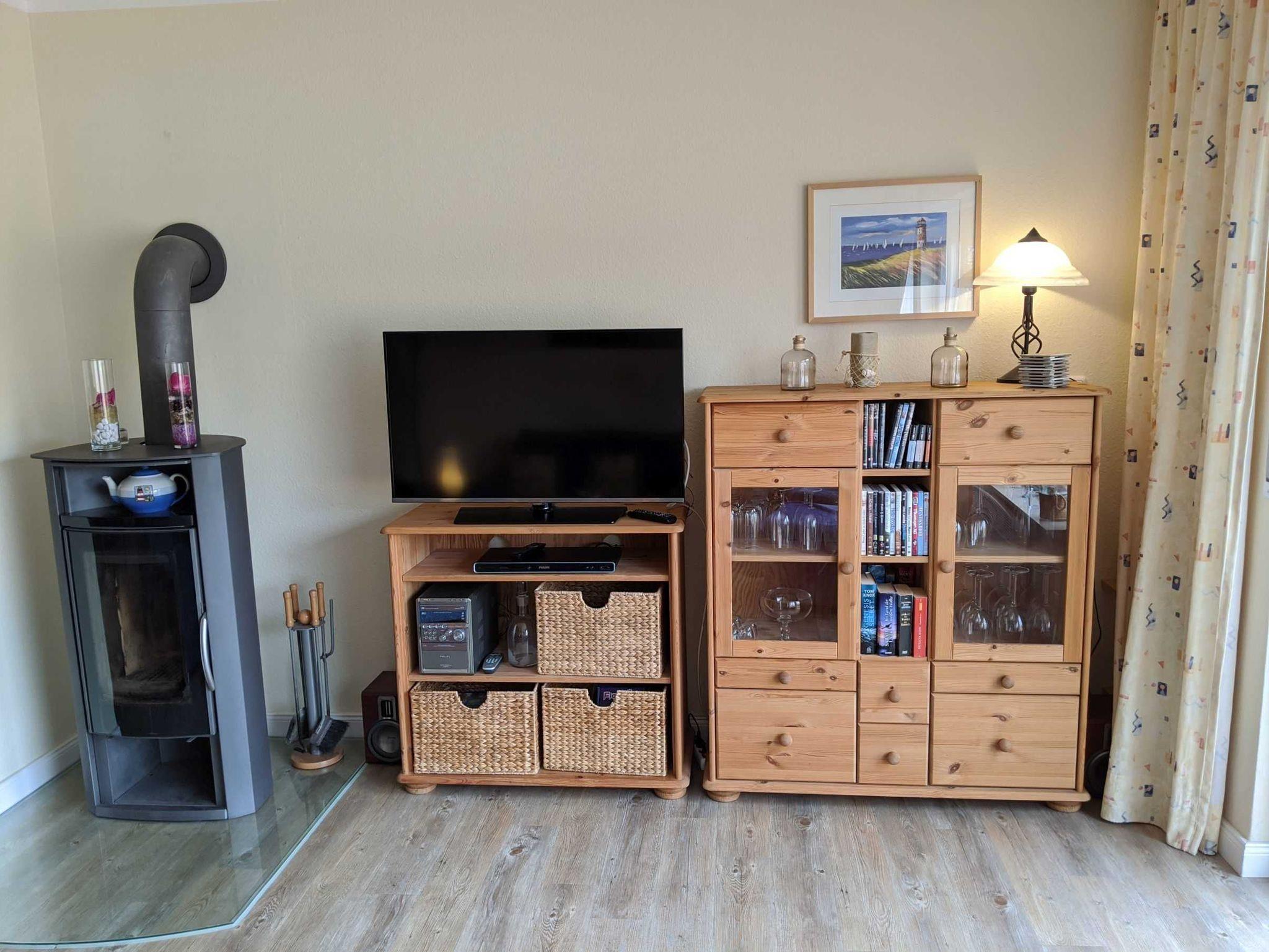 Das Wohnzimmer ist mit einer Couchgarnitur, einem Kaminofen, SAT-TV und HD+, DVD-Spieler, Stereoanlage und WLAN ausgestattet. Direkt angrenzend findet sich dort eine gemütliche Essecke. Eine separate, neue Einbauküche ist komplett ausgestattet mit Ceran-Kochfeld, Backofen, Kühlschrank, Geschirrspüler, Mikrowelle, Kaffeemaschine, Wasserkocher, Toaster, Waschmaschine und Senseo-Kaffeepad-Maschine. Ebenso finden Sie hier alles an Geschirr und Pütt un Pann.