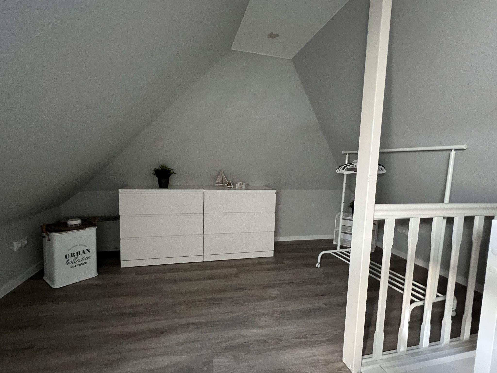 Die Ferienwohnung hat zwei Schlafzimmer, ein Schlafzimmer mit Doppelbett im ausgebauten Dachboden (Treppe ins DG steil und schmal) und 1 Schlafzimmer mit zwei getrennt stehenden Betten. Kombi. Wohn-/Esszimmer mit Küchenzeile. Die Küche ist komplett eingerichtet mit Backofen, Microwelle und 4 Platten- Cerankochfeld.