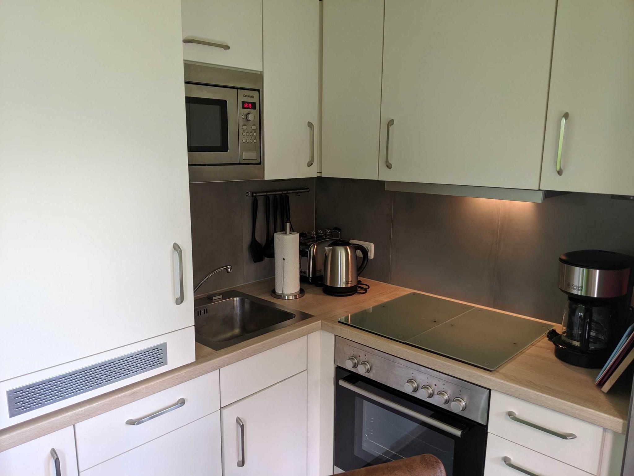 • Integrierte Küche mit E-Herd mit 4-Platten-Cerankochfeld, Backofen, Kühlschrank, Mikrowelle, Spülmaschine