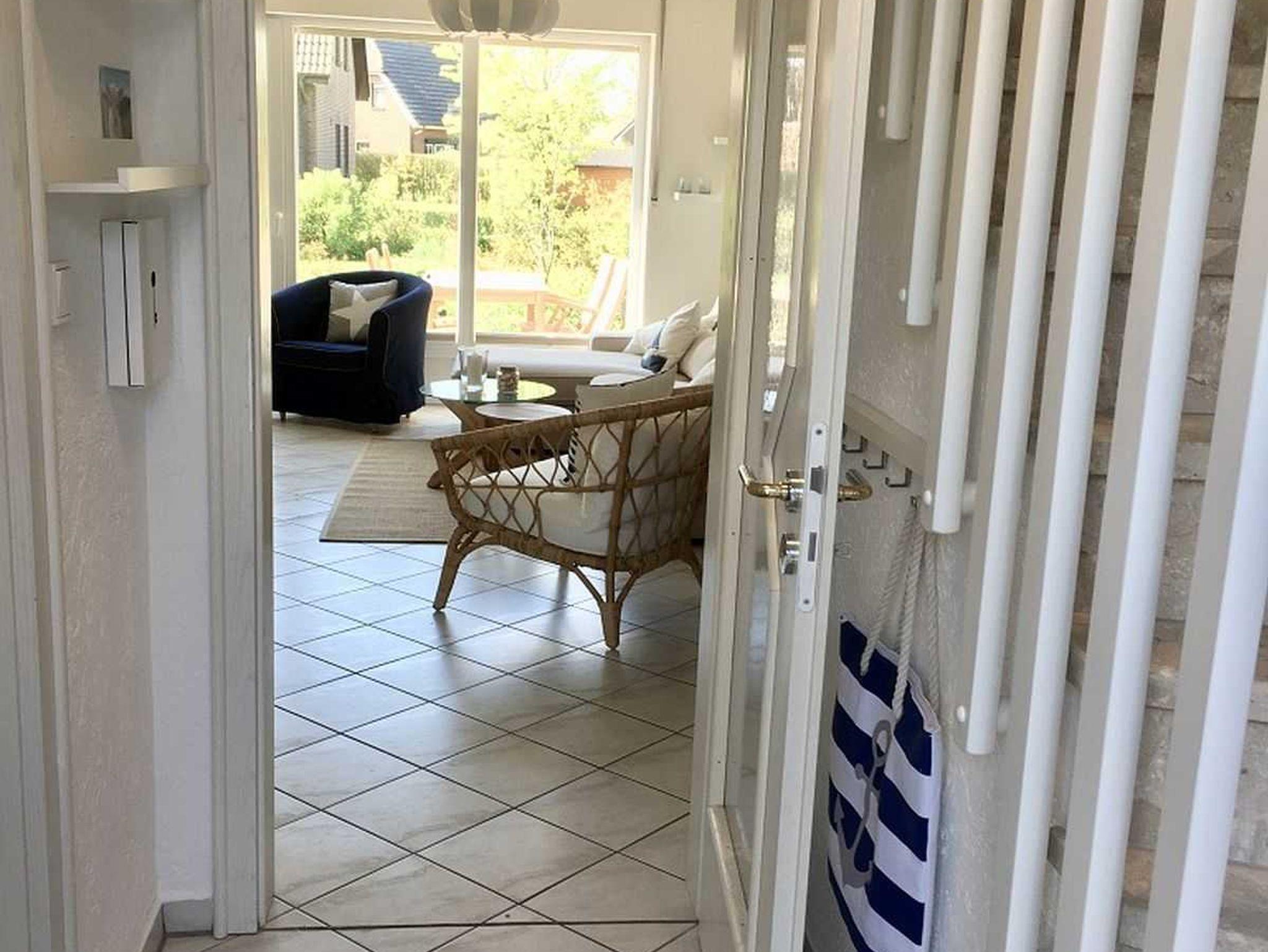 Im Erdgeschoss des Hauses befindet sich ein heller und freundlicher Wohn- und Eßbereich. Die Küchenausstattung lässt keine Wünsche offen. Dort können Sie sowohl einen kleinen Snack für den Tagesausflug als auch ein 4-Gänge-Menü zubereiten. Vom Wohnraum aus gelangen Sie auf die Terrasse, auf der Sie den ganzen Tag die Sonne im eigenenen Strandkorb genießen können. Ein Badezimmer mit Dusche, WC und Waschmaschine liegt ebenfalls im Erdgeschoss. Über eine Treppe gelangen Sie in das Obergeschoss mit zwei Schlafzimmern. Das erste Schlafzimmer ist mit einem Doppelbett und einer kleinen Arbeitsecke ausgestattet. Im zweiten Schlafzimmer befinden sich zwei Einzelbetten. Es besteht dort die Möglichkeit eine weitere Schlafgelegenheit für ein Kind zu schaffen. Zudem steht Ihnen ein Reisebett zur Verfügung. Auf dieser Etage finden Sie eine weitere Dusche mit WC.