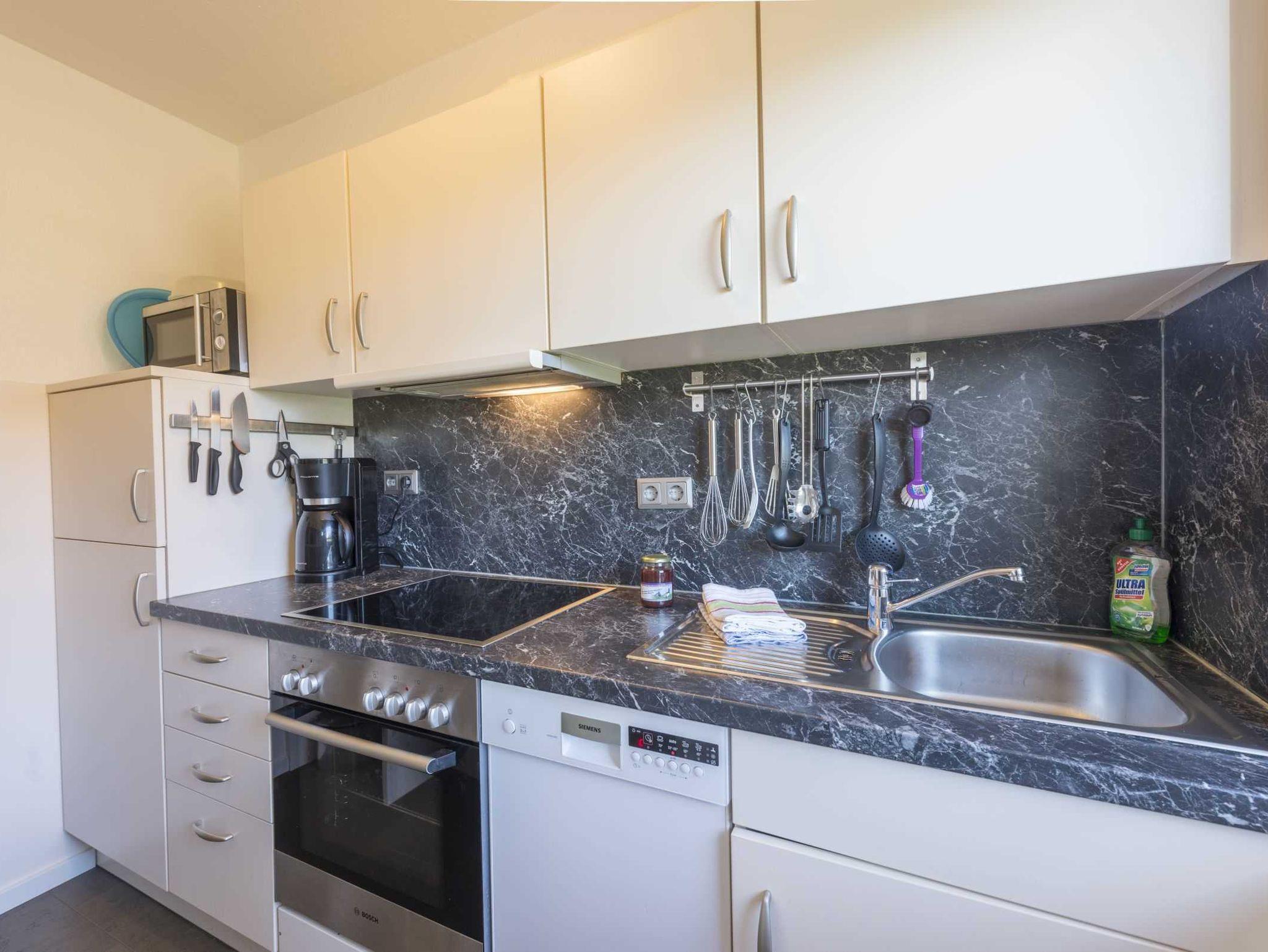 • kleine Küche (ohne Tür zum Flur) mit Mikrowelle, E-Herd (4 Platten), Backofen und Geschirrspülmaschine
