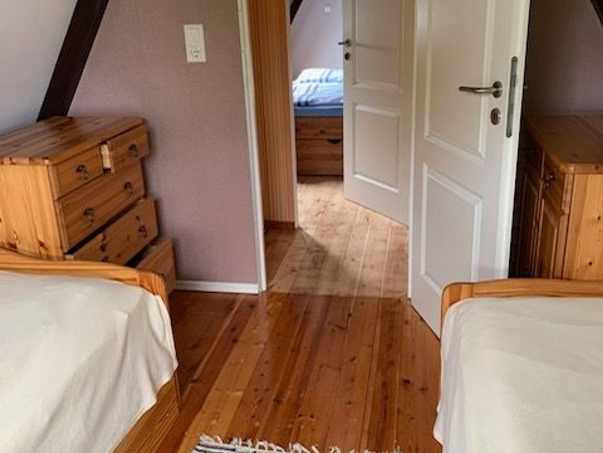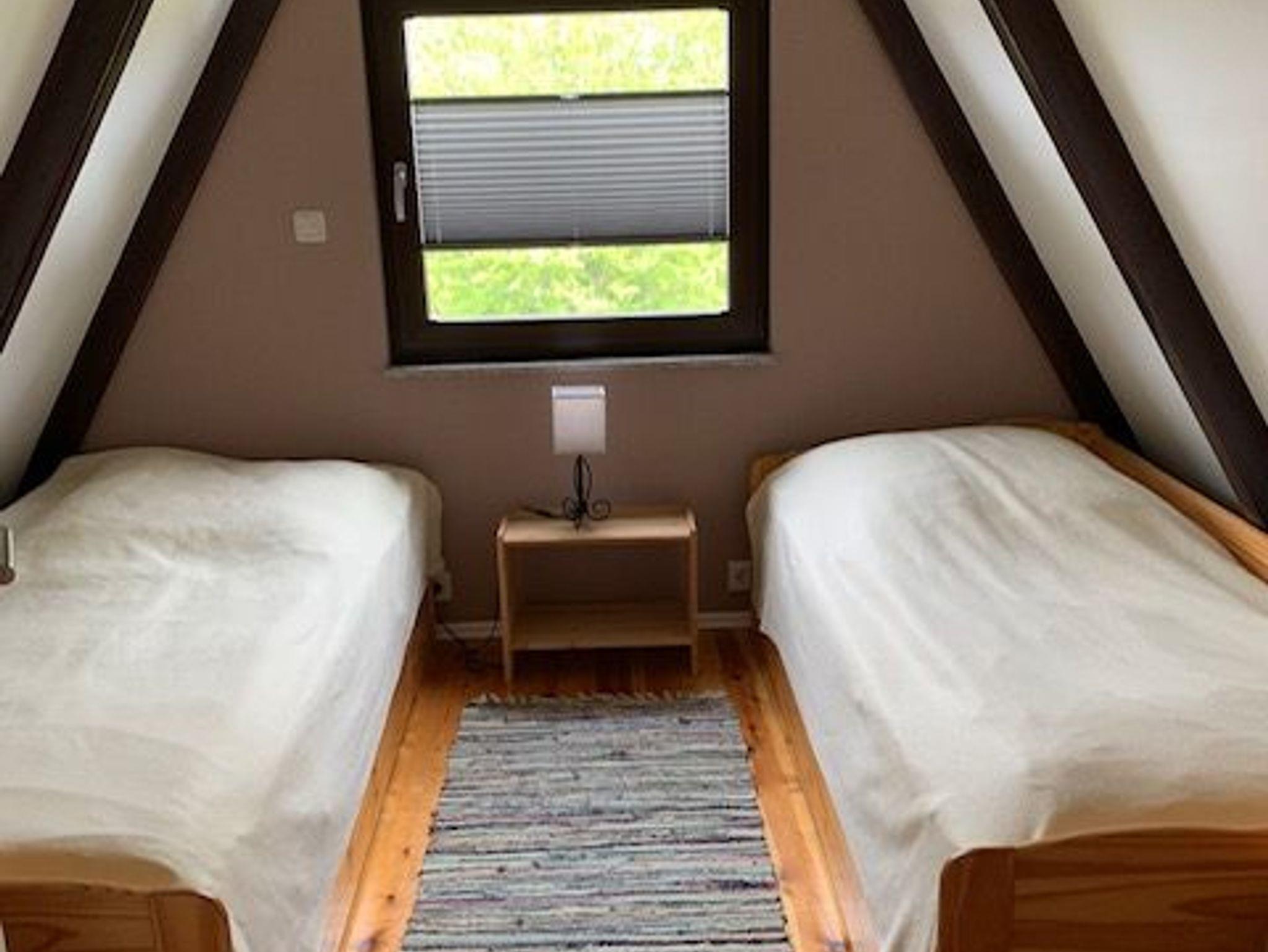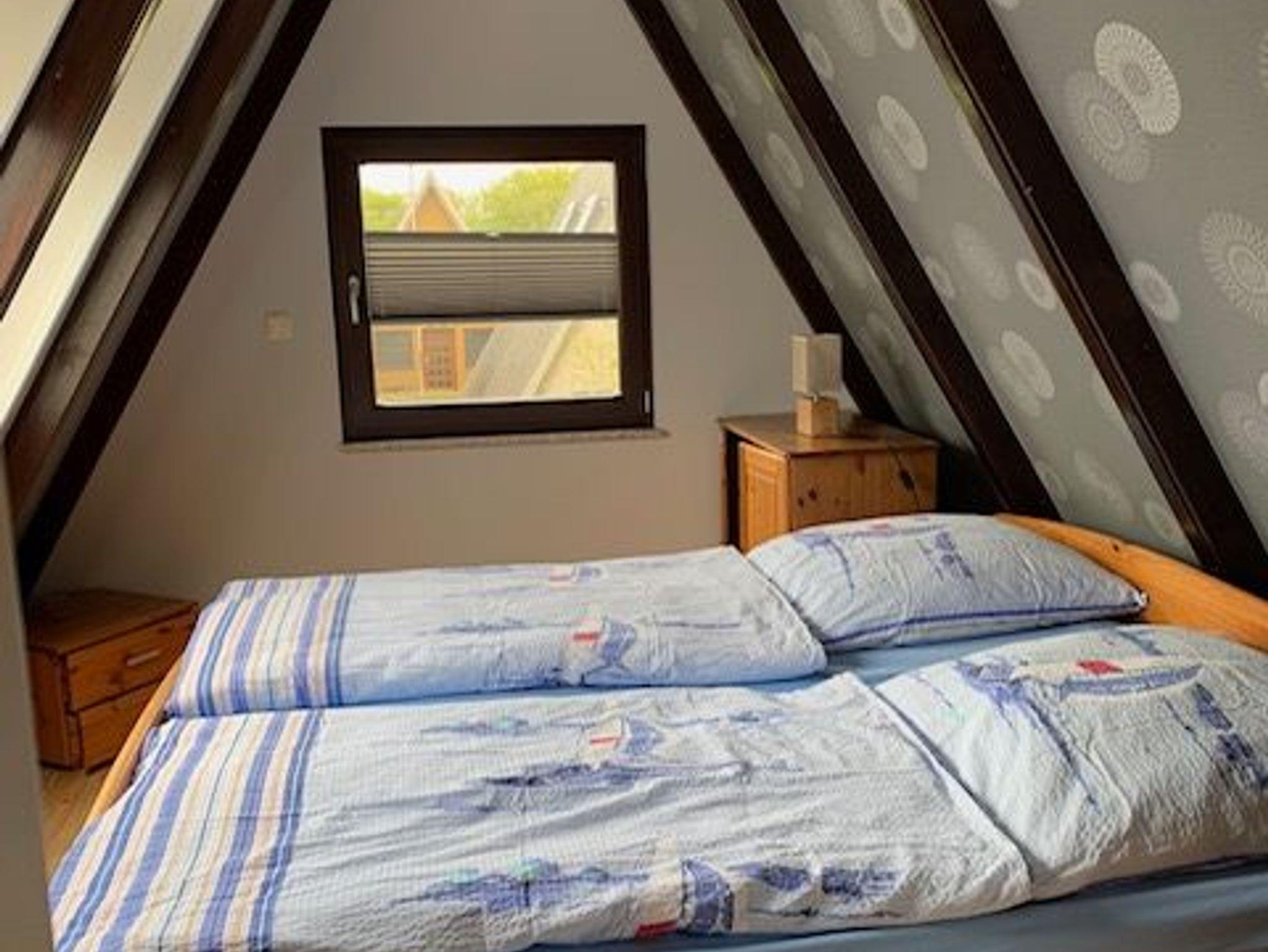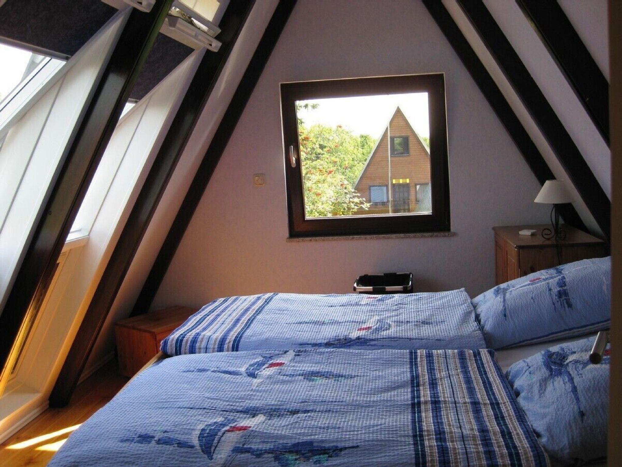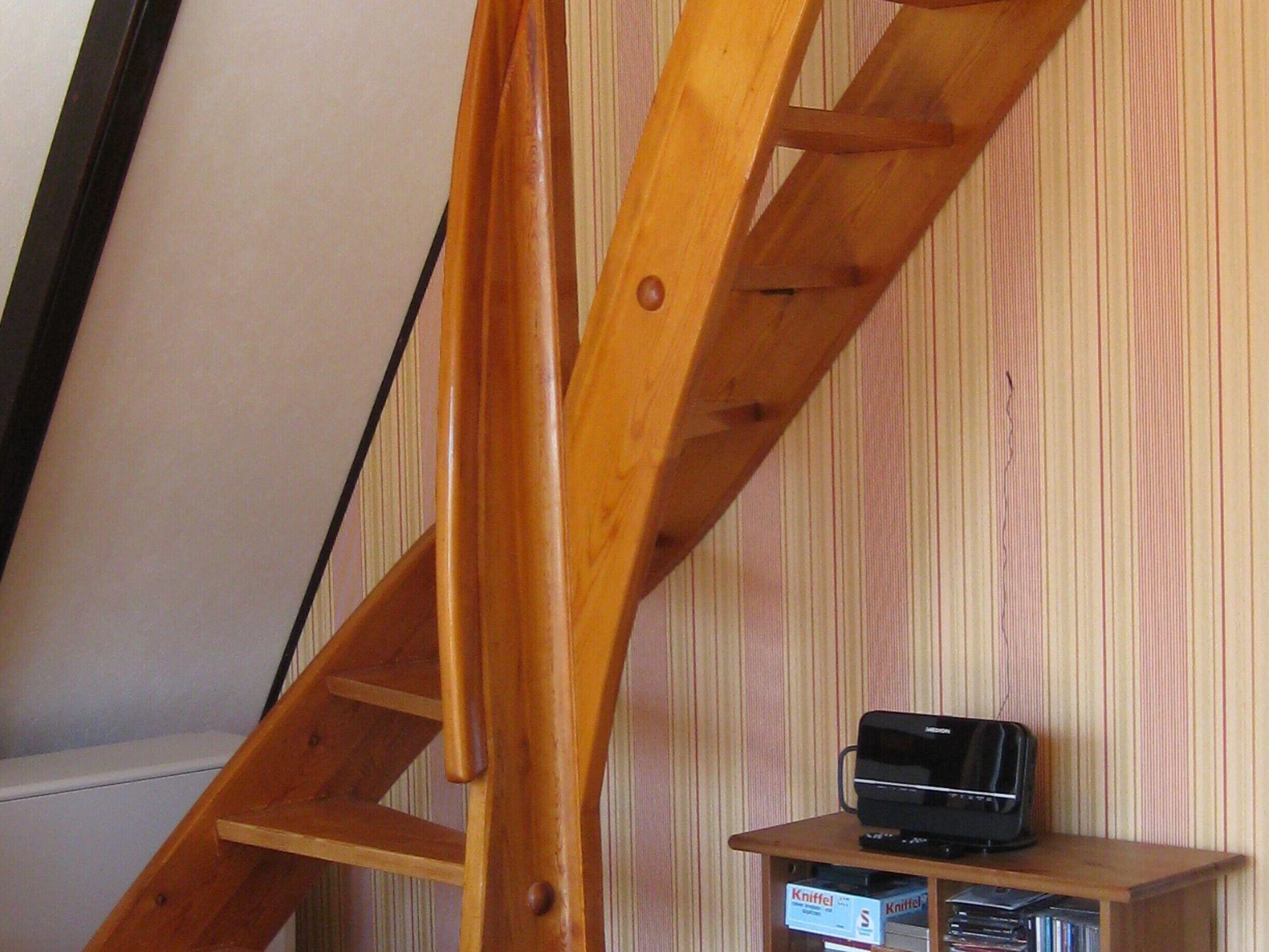 Über eine steile Treppe erreichen Sie die beiden Schlafzimmer im Obergeschoß.