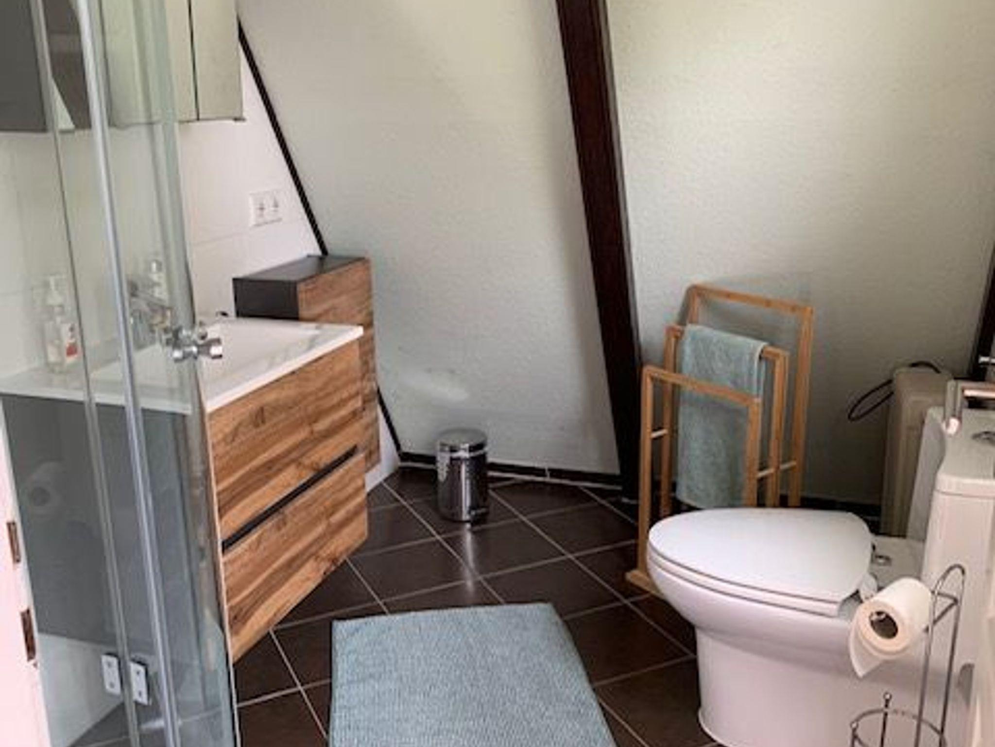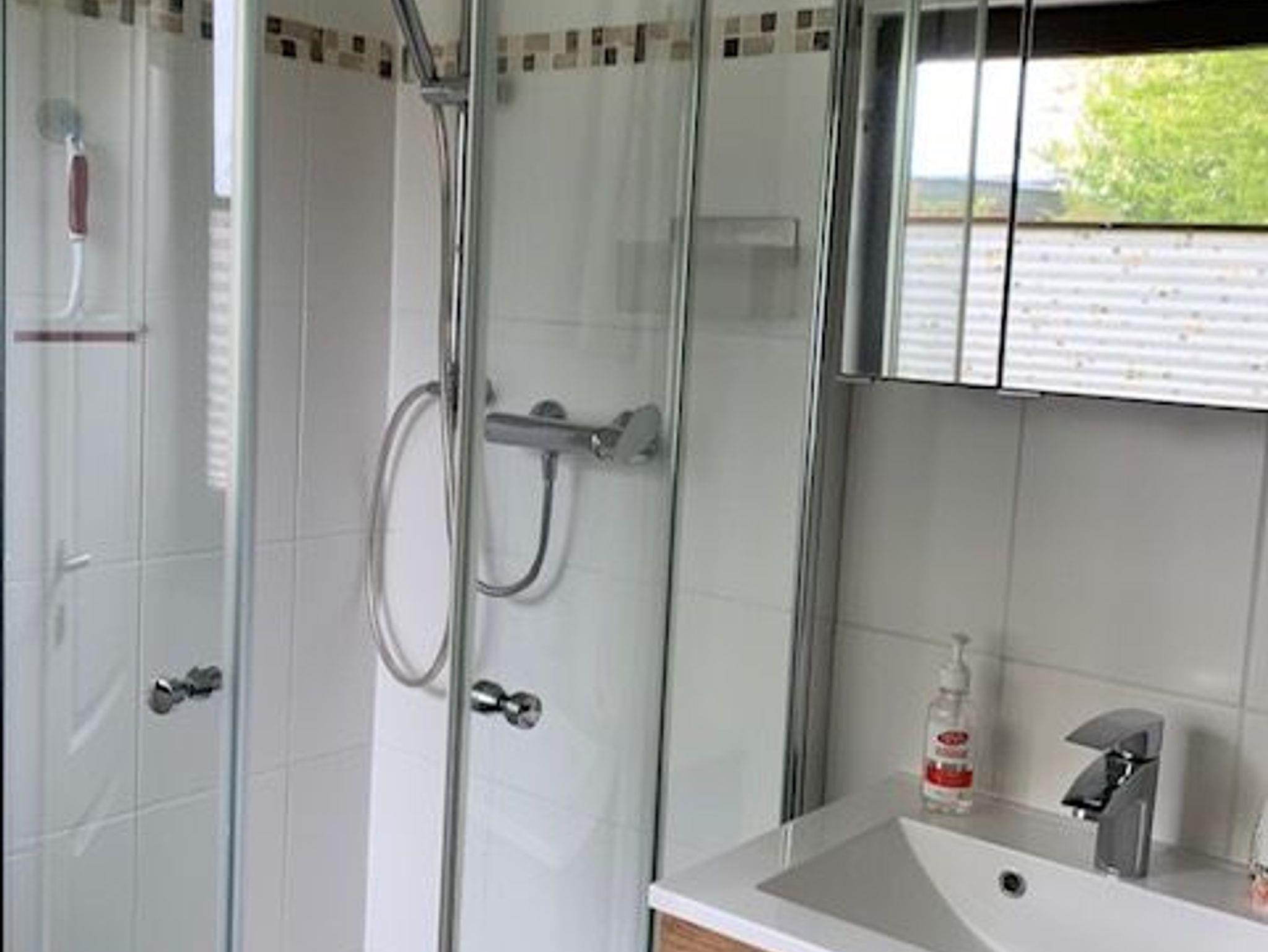 Das Bad verfügt über Dusche mit Regenduschkopf, Waschbecken, WC.