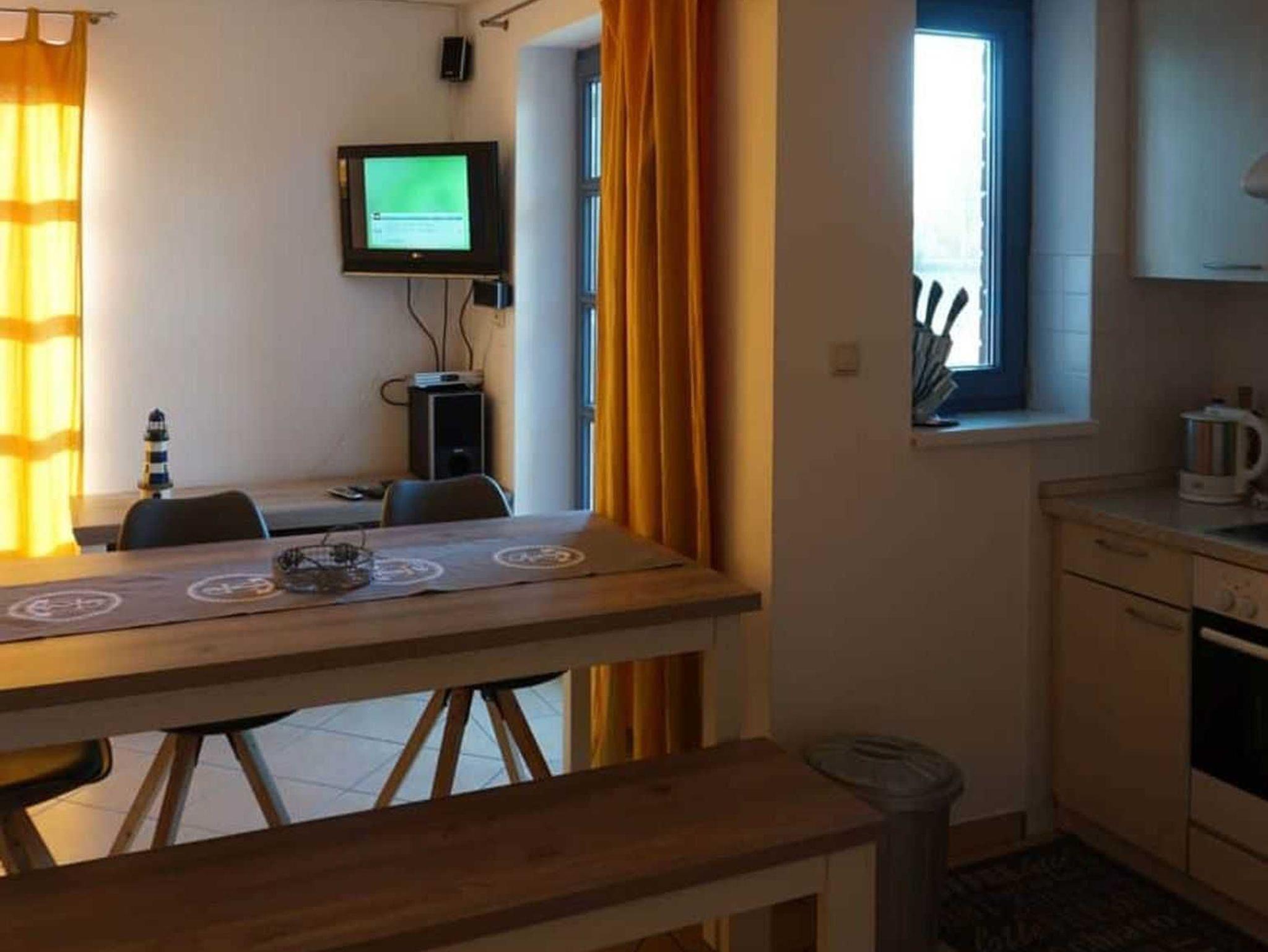 Eine komplett eingerichtete Einbauküche mit Elektroherd, Backofen, Geschirrspülmaschine, Mikrowelle, Kühlschrank mit Gefrierfach, Kaffeemaschine, Toaster und Wasserkocher lassen es an nichts fehlen.