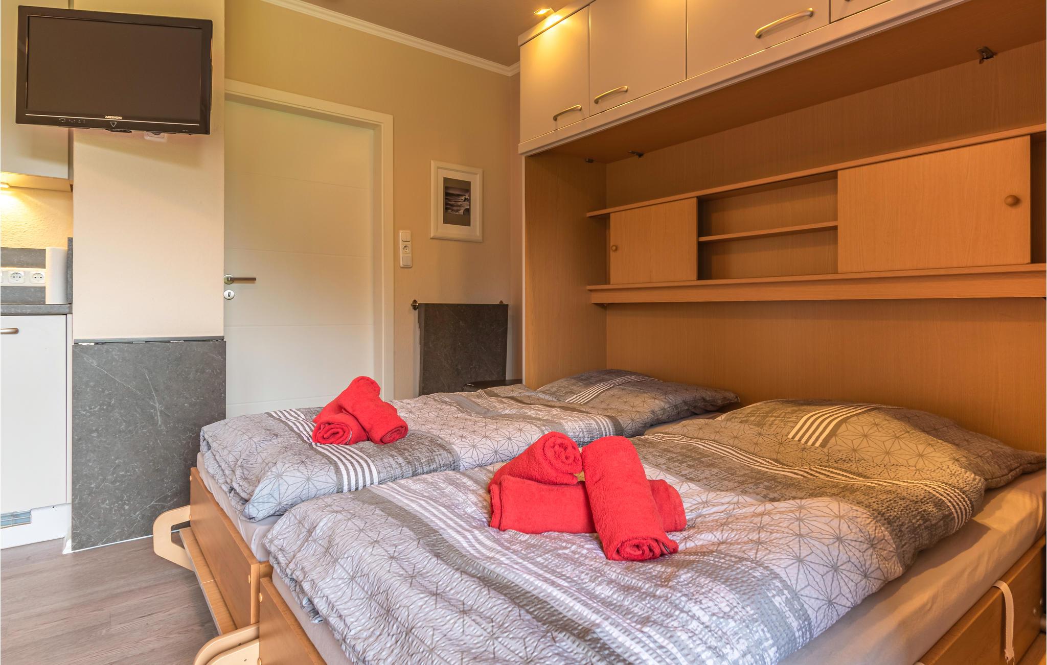 Die Wohnung verfügt über eine gemütliche Wohnküche mit einem Schrankbett. Dort versteckt sich ein vollwertiges Doppelbett für 2 Personen. Ein Flachbildfernseher für gemütlich Fernsehabende ist vorhanden. Die gut ausgestattete Küche hat eine Spülmaschine, Ceran-Kochfeld mit Einbauherd, Kühl-Gefrierkombination, Backofen, Kaffeemaschine und Toaster. Die Essgruppe für 2 Personen lädt zum gemütlichen Essen mit einem wunderschönen romantischen Ausblick auf den Deich ein. Die Terrasse ist ideal, um das schöne Wetter zu genießen. Das kleine aber feine Badezimmer hat eine Dusche, WC und Waschbecken. Es gibt auch eineneinen Haartrockner.