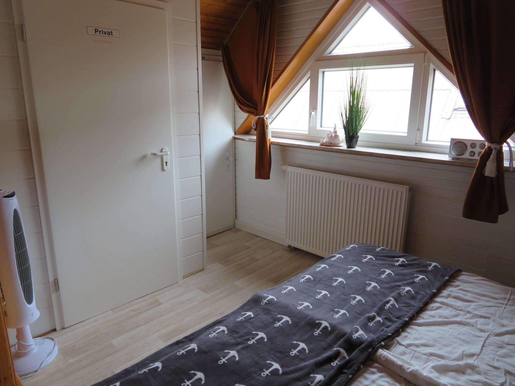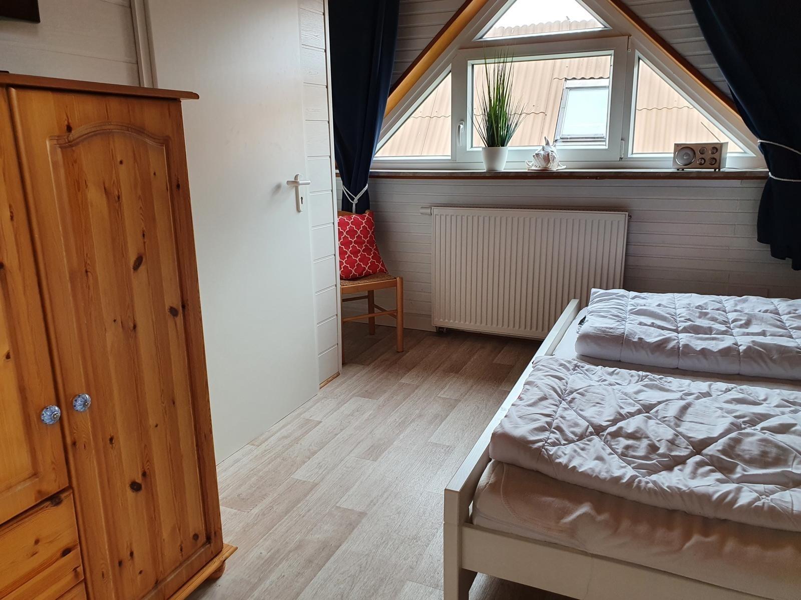 Das Schlafzimmer im OG mit seinem großen Dreieckfenstern Richtung Deich/Meer verfügt über ein Doppelbett mit Nachttisch und Leselampe, weinen weiteren SAT-TV Fernseher, Radio und Kleiderschrank.