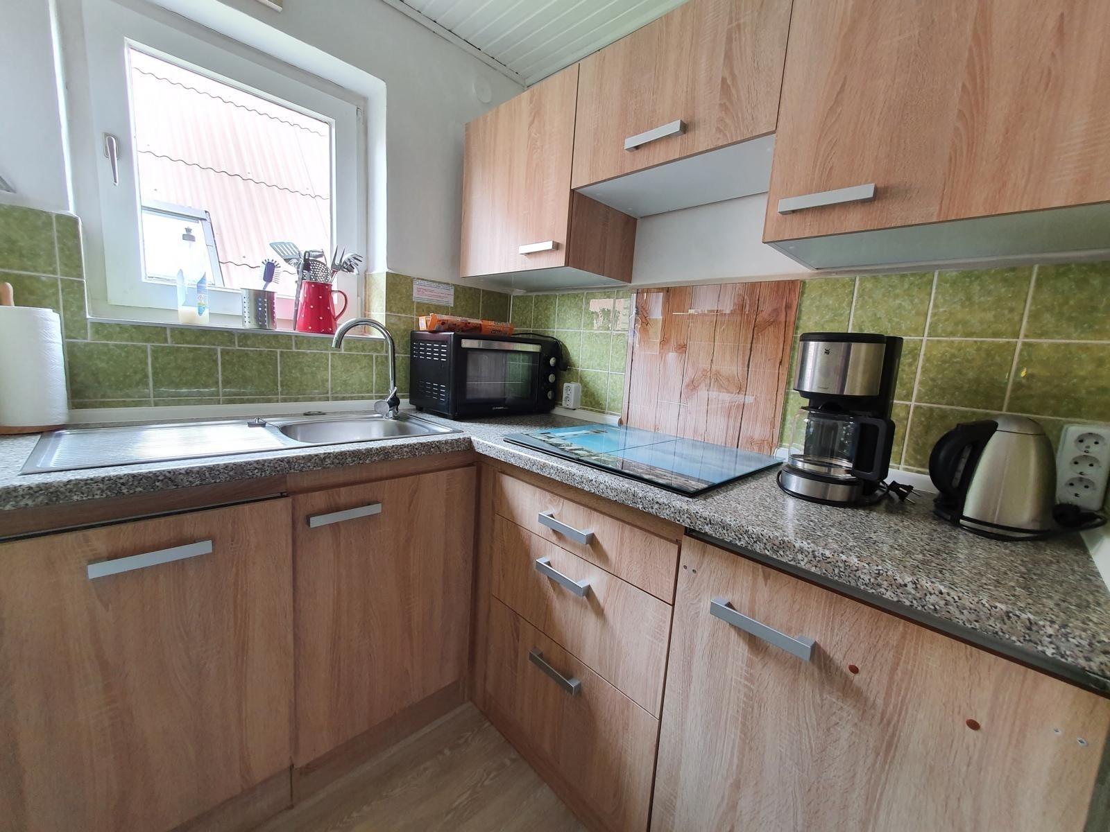 In der Küche macht das Kochen Spaß: Geschirrspüler, Kühlschrank mit kleinem 4**** Eisfach, 4fach Ceranfeld sowie Toaster, Wasserkocher und Kaffeemaschine sind vorhanden. Wir haben einen Backofen bis 230 Grad, dafür aber keine Mikrowelle.