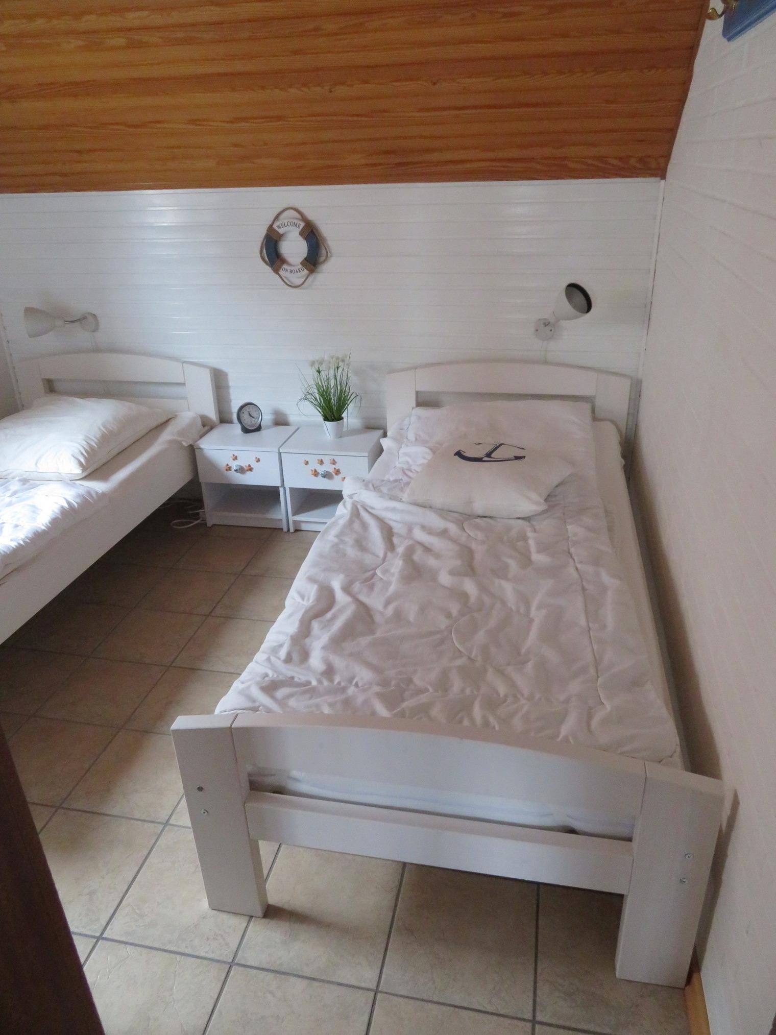 Das Schlafzimmer im EG hat ein Fenster zur Deich-/Meerseite. Dort befinden sich 2 Einzelbetten mit Matratzen 90x200 cm (Testsieger) mit Nachttisch und Leselampe und Kleiderschrank mit integriertem Wertsachentresor zur kostenfreien Benutzung. Bitte bringen Sie Laken, Kopfkissenbezüge und Matratzenbezüge, sowie Handtücher mit oder leihen sich diese bei Ankunft beim Wäsche-Service des Tourismus-Service, Tel. 04854 219010.
