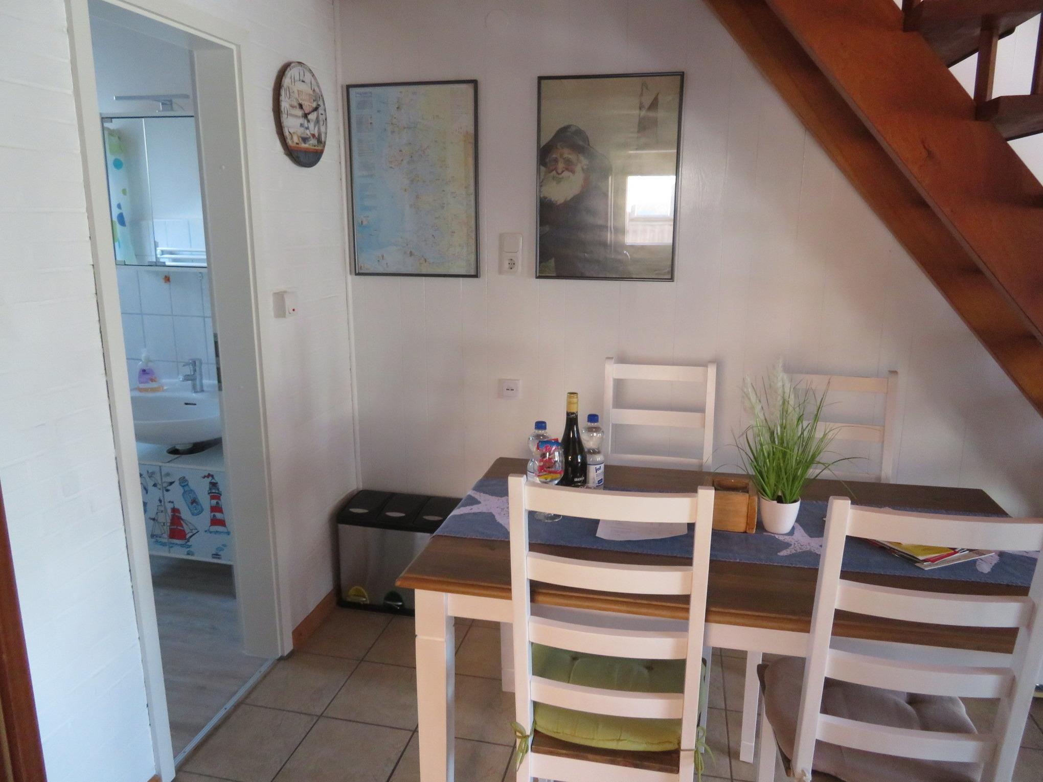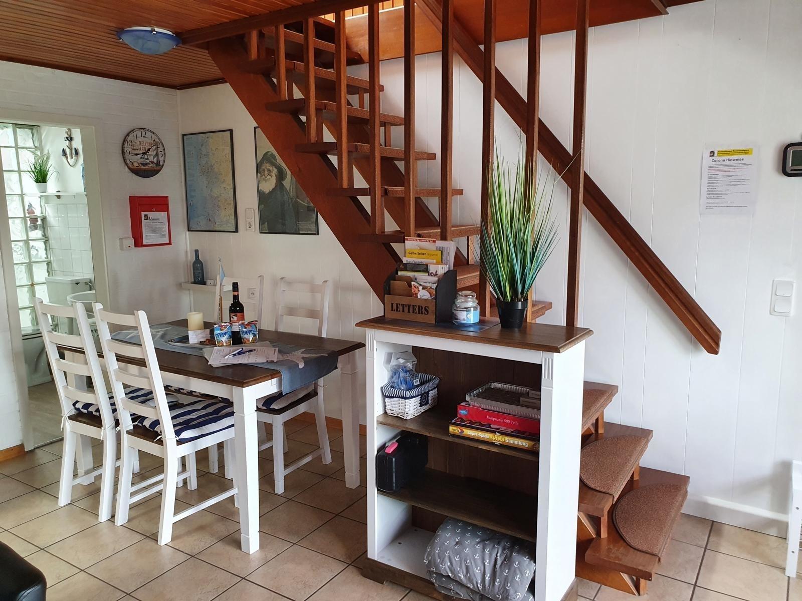 In unserem kombinierten Wohn-/Essbereich mit Couch, Essgruppe und Tisch sowie mit einem 124 cm großen Flatscreen mit SmartTV (Internet) und großer sortierter Programm- und Sendervielfalt in Deutsch und weiteren Sprachen, kostenfreies und unbegrenztes Highspeed- Glasfaser WLAN (500 Mbit/s), USB-Wandladesteckdose, Hi-Fi-Kompaktanlage, Internet- und DAB+-Radio sowie Spielesammlung für die ganze Familie sowie Büchern in kleiner Bibliothek können auch Schlechtwettertage super überbrückt werden. Eine Wetterstation mit satellitengesteuerter Viertages-Wettervorhersage ist ideal für die Ausflugsplanung. Garderobe und Schuhablage befinden sich im Eingangsbereich. Große Fenster lassen Sie auf den Garten blicken.