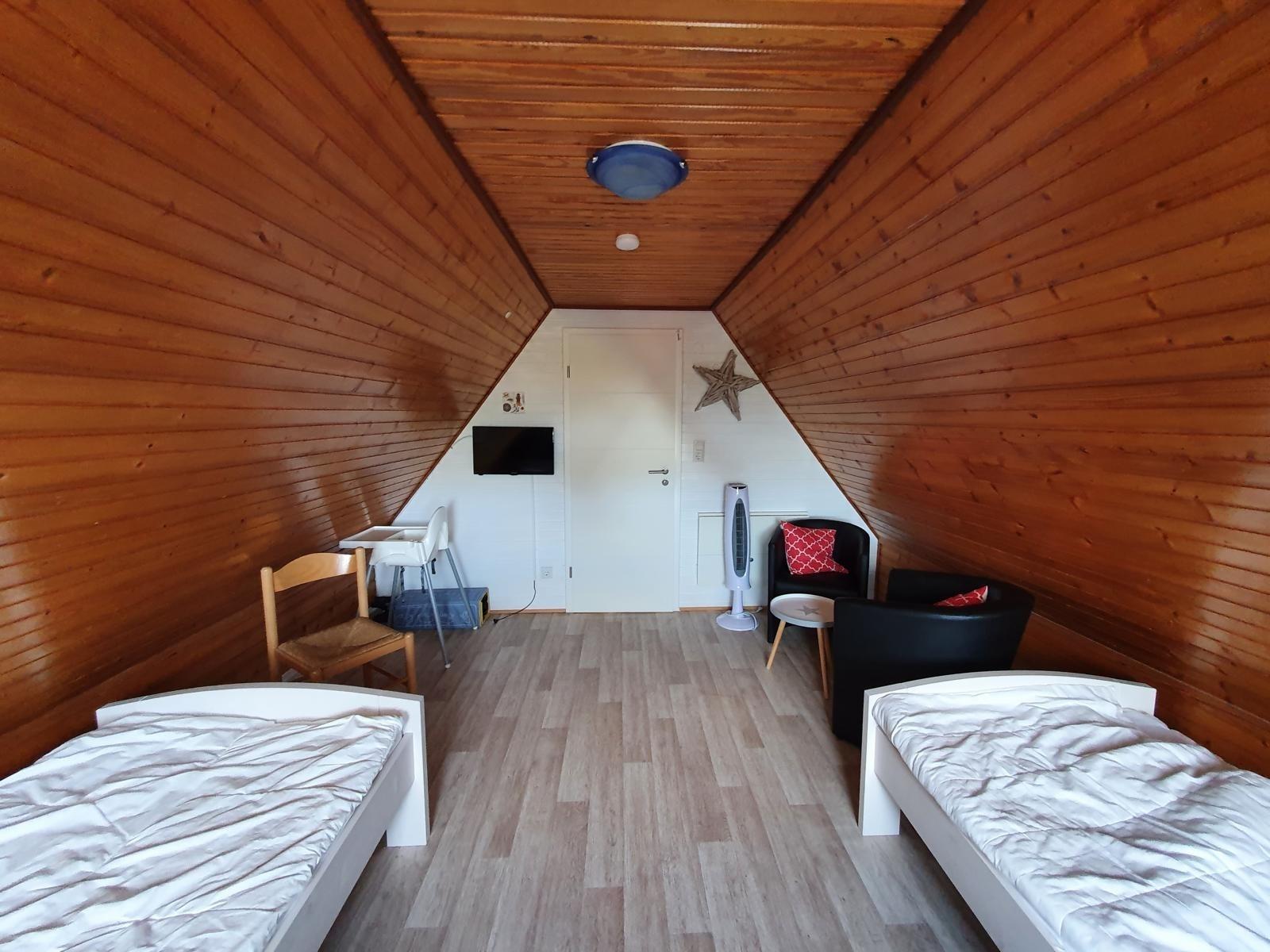 Das Schlafzimmer im OG mit seinem großen Deckfenster Richtung Deich/Meer verfügt über ein Doppelbett mit Nachttisch und Leselampe, SAT-TV, Fernseher und Sitzgelegenheiten mit Tisch. Ein separater Ankleidebereich mit Kleiderschrank befindet sich vor dem Schlafzimmer. Auch ein Lesebereich mit Büchern, Sitzgelegenheiten und Leselampe ist im OG zu finden.