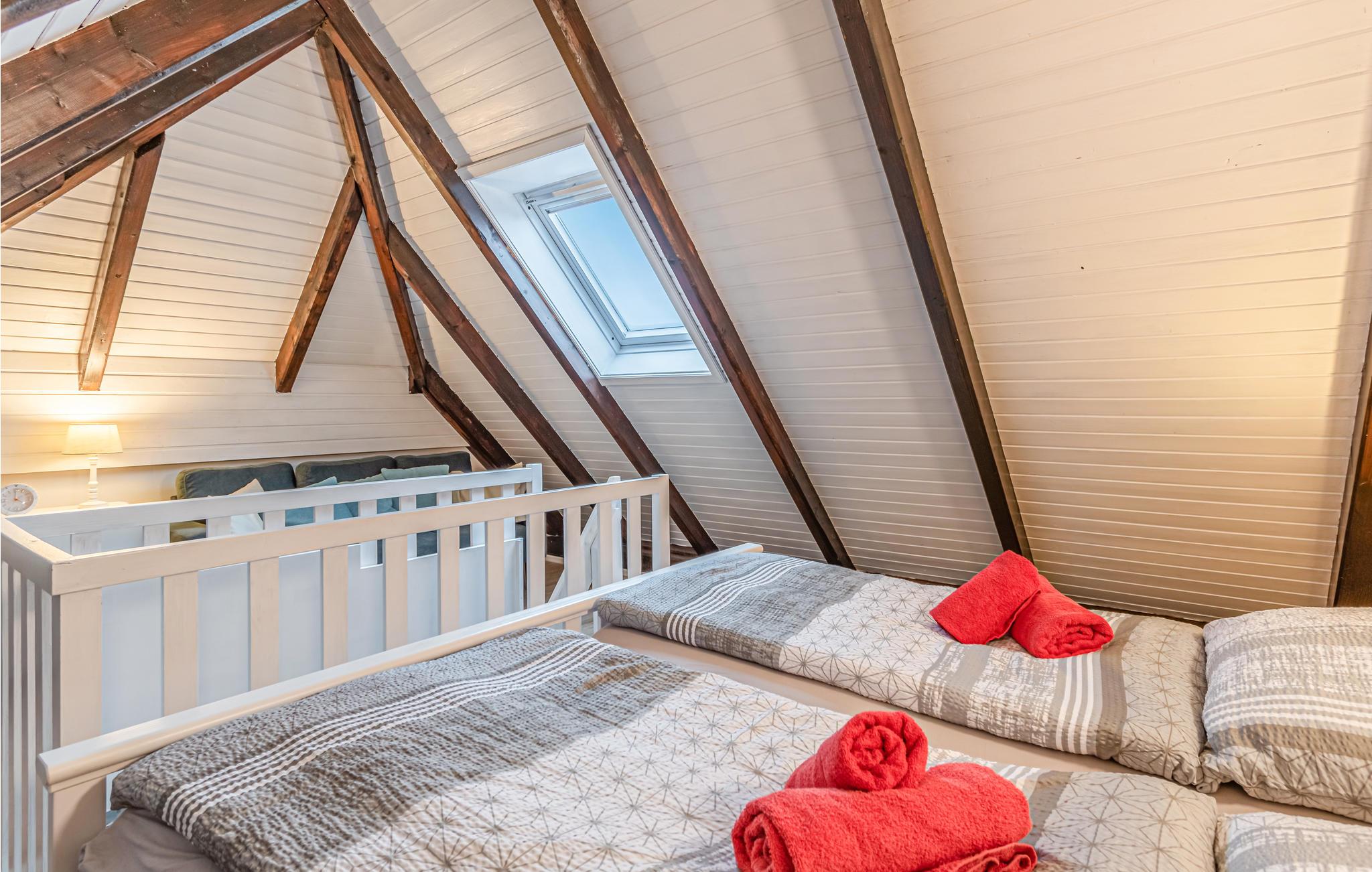 Der Balkon ist überdacht, so dass man ihn auch bei schlechtem Wetter nutzen kann. Das Schlafzimmer unten hat ein Einzelbett, welches auf zwei Betten durchs Ausziehen erweitert werden kann. Im Zimmer befindet sich eine Leseecke mit einem gemütlichen Sessel. Das obere Schlafzimmer hat ein Doppelbett, auch hier gibt es eine Leseecke mit einem bequemen Sofa. Beide Schlafzimmer verfügen über Verdunklungsrollos.