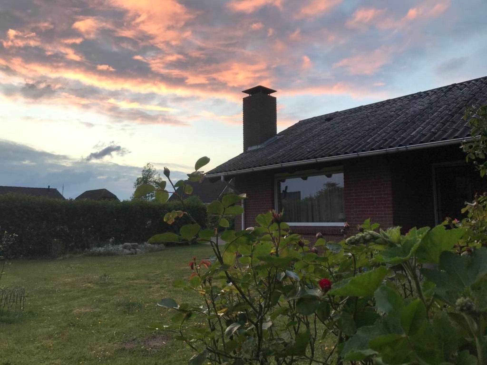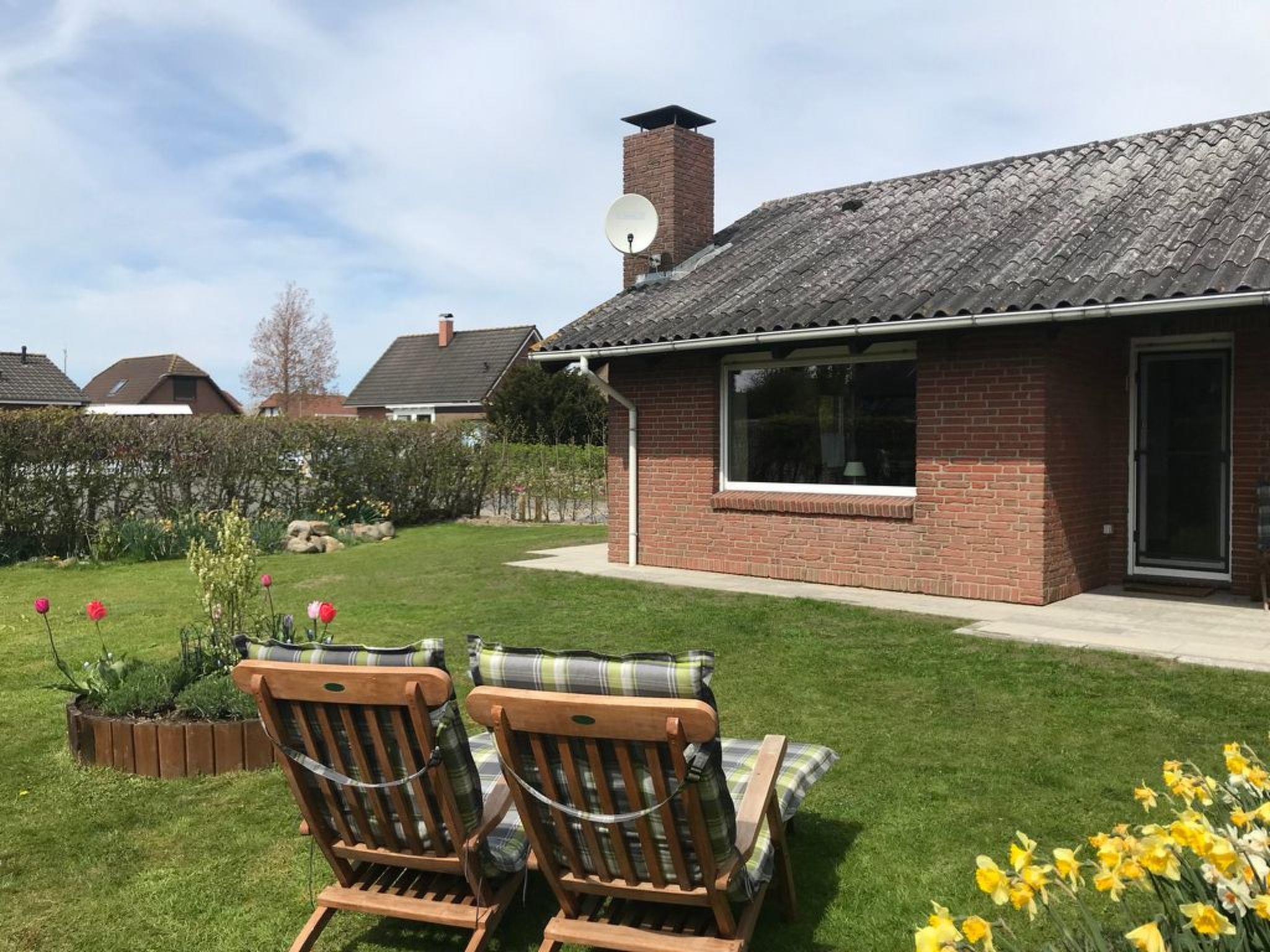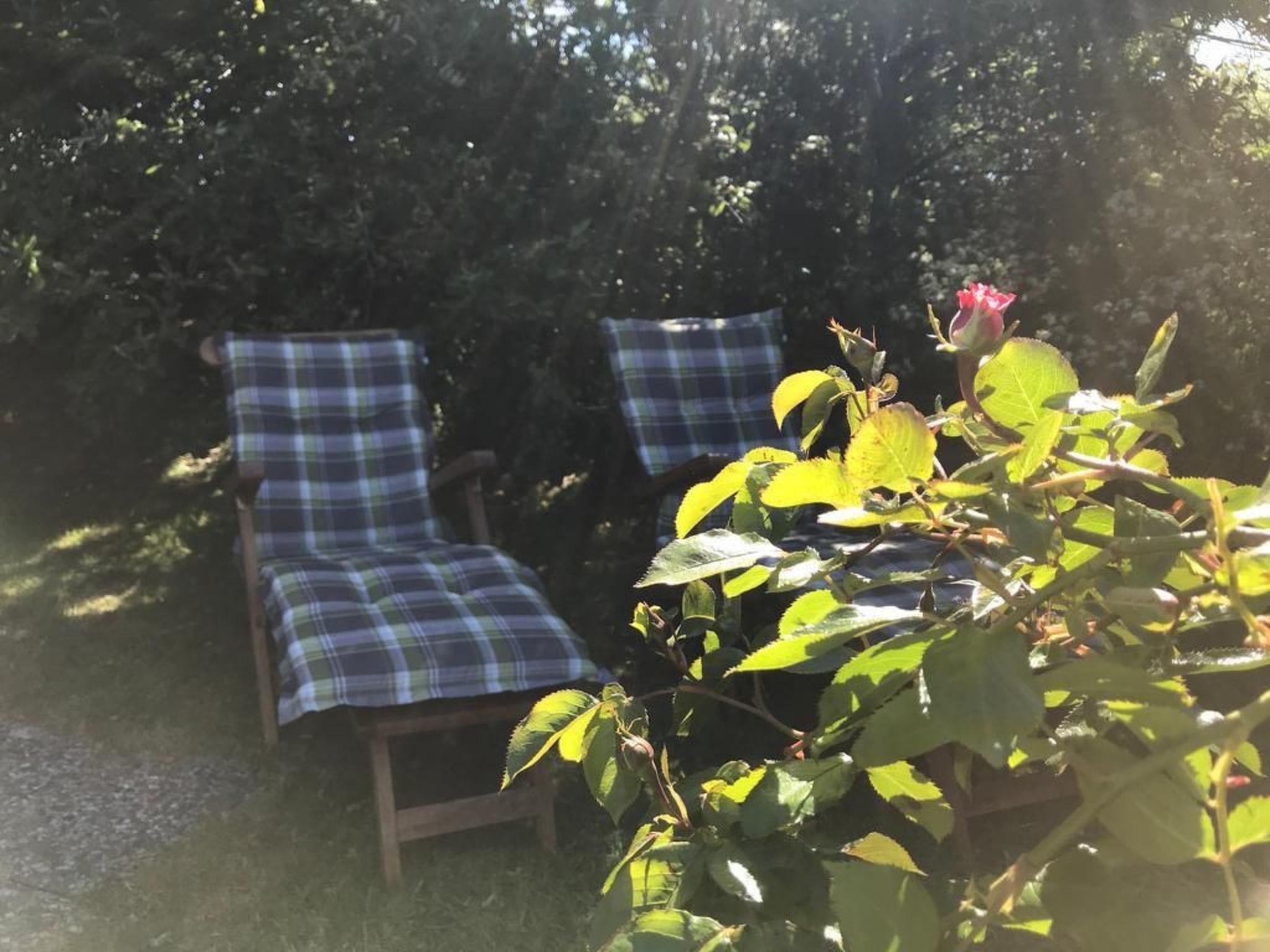 Der Außenbereich lädt mit seiner südausgerichteten Terrasse, einem neu hinzugekommenen Strandkorb (ab 2023) und diversen Gartenmöbeln zum Verweilen im Freien ein. Das Grundstück am Ende einer ruhigen Sackgasse umfasst auch ein Gartenhaus für Fahrräder – ideal für Gäste, die Entspannung in der Natur suchen.