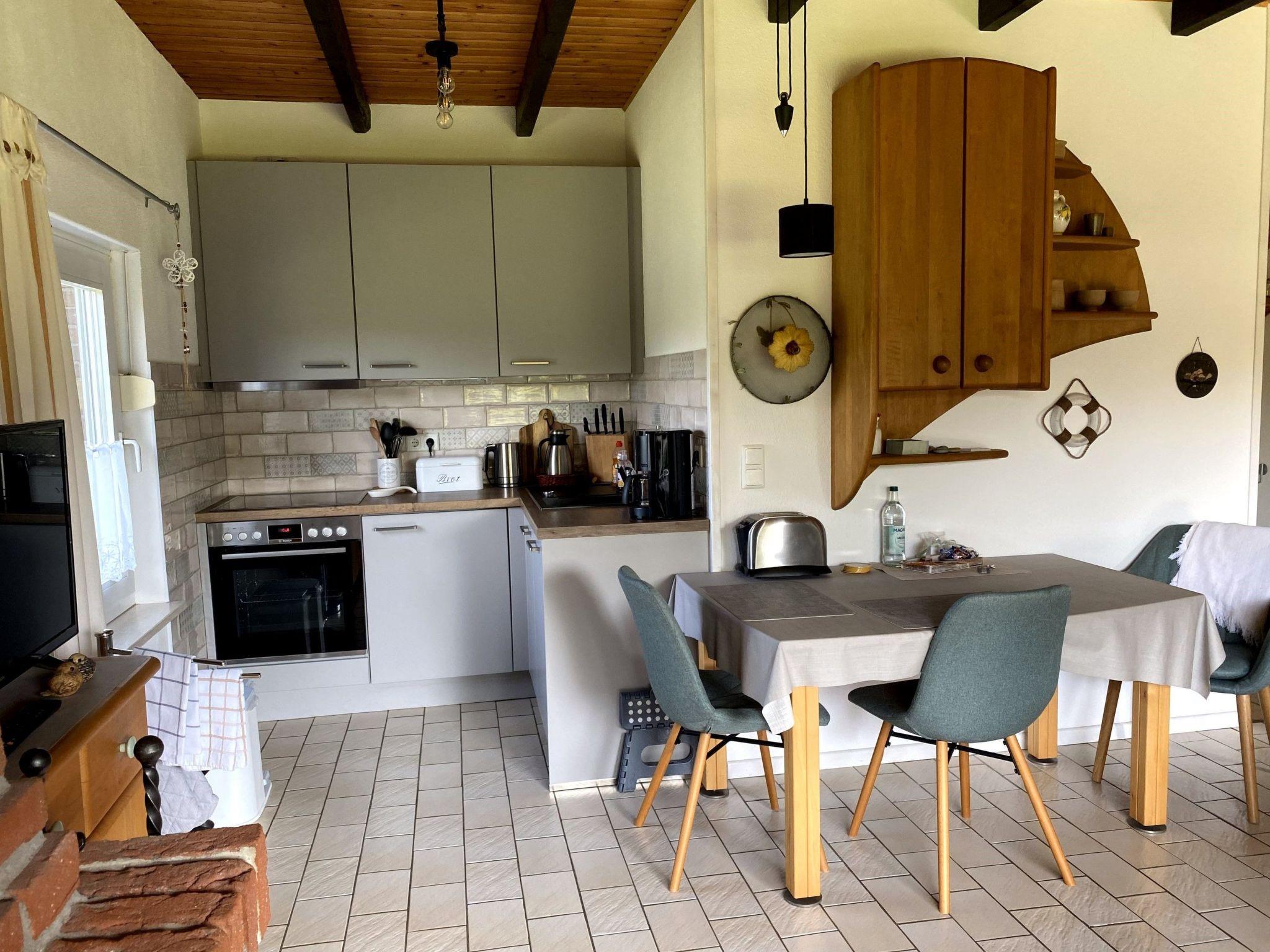Im Inneren des ebenerdigen, 50 m² großen Bungalows wartet eine komfortable Ausstattung auf Sie. Das Herzstück bildet die neu gestaltete offene Küche (2020) mit Essbereich, die nahtlos in eine gemütliche Stube mit Kamin übergeht – ideal für entspannte Abende. Zwei liebevoll renovierte Schlafzimmer, eins mit Doppelbett (2022) und das andere mit einem Einzelbett, sowie ein modernes Badezimmer (2021) mit ebenerdiger Dusche komplettieren die Wohlfühlatmosphäre.