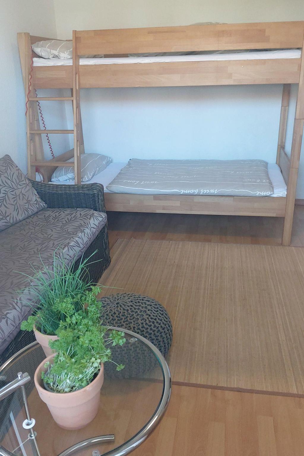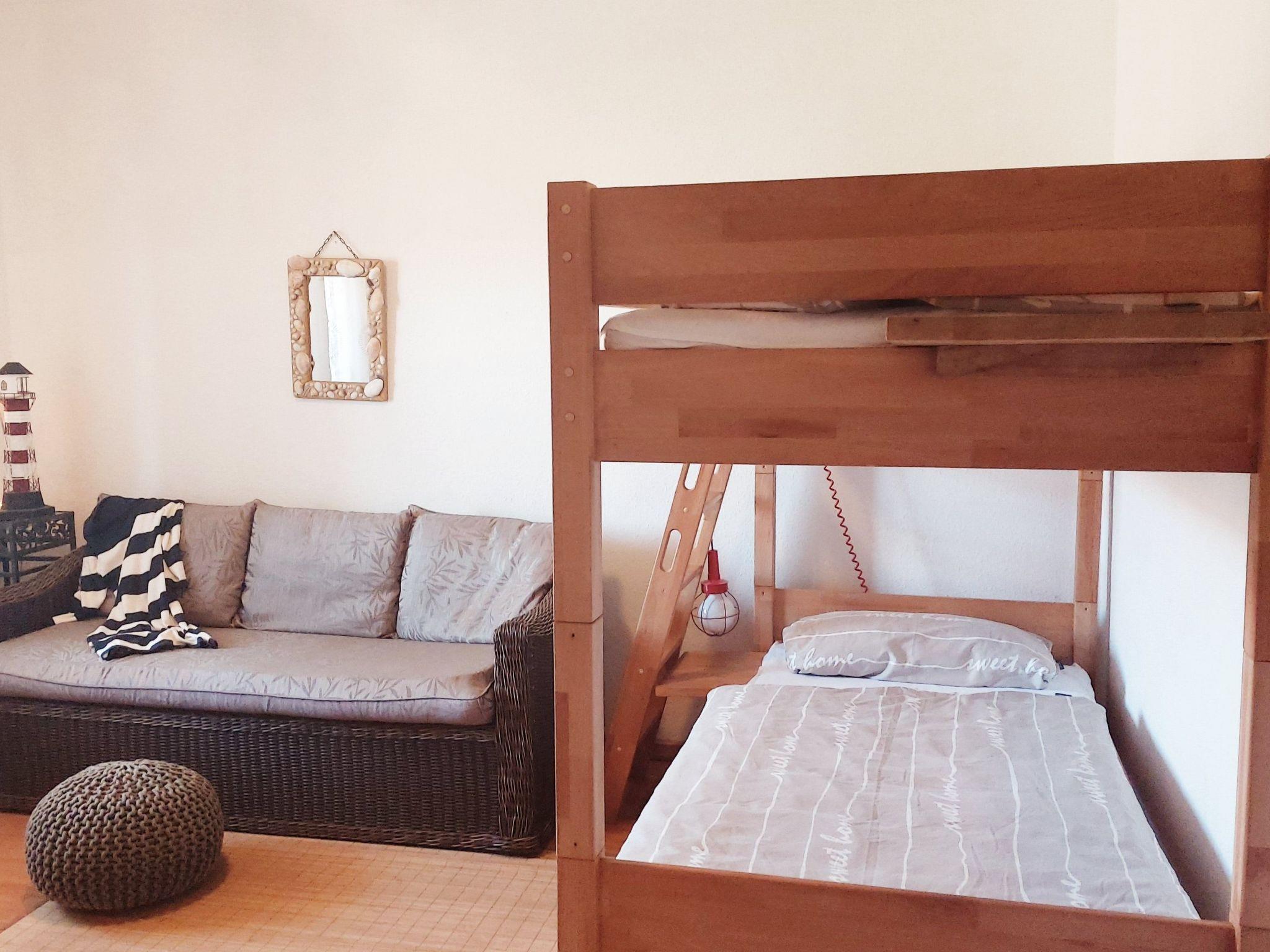 - Das Schlafzimmer 2 bietet angenehmen Schlaf im Naturholz-Etagenbett und viel Stauraum im Schrank und der Vitrine, dazu Platz zum Spielen und eine kleine Lese-Ecke, falls Sie sich zurück- ziehen möchten. Auch hier finden Sie für die nächtliche Verdunkelung eine Außenjalousie.