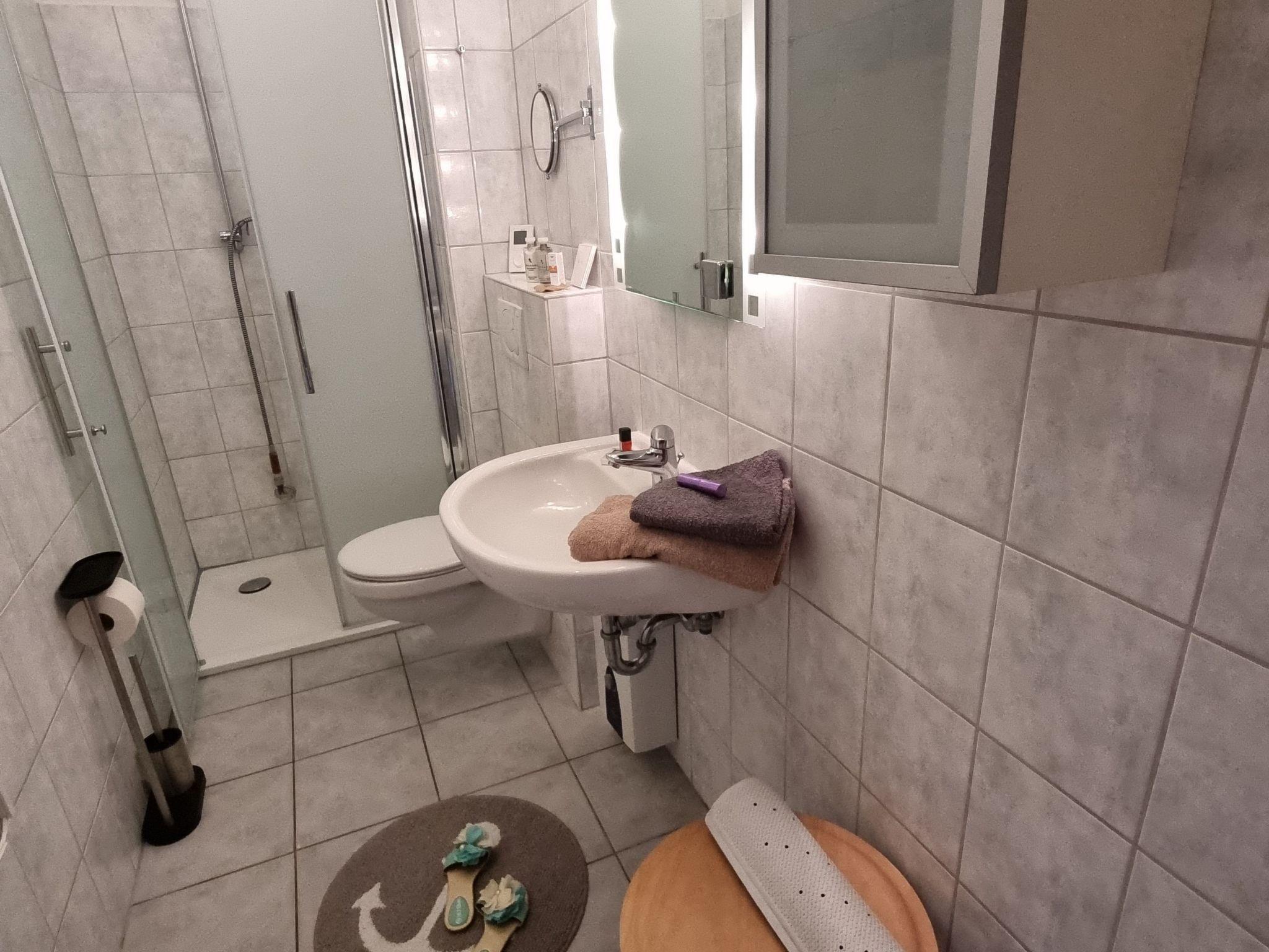 - Das Badezimmer mit fast bodenebener Dusche ist gut ausgestattet und bietet ausreichend Stauraum. Hier steht Ihnen hier eine Waschmaschine für die kleine Wäsche zur Verfügung.