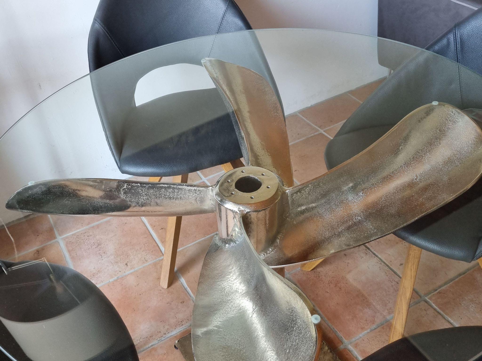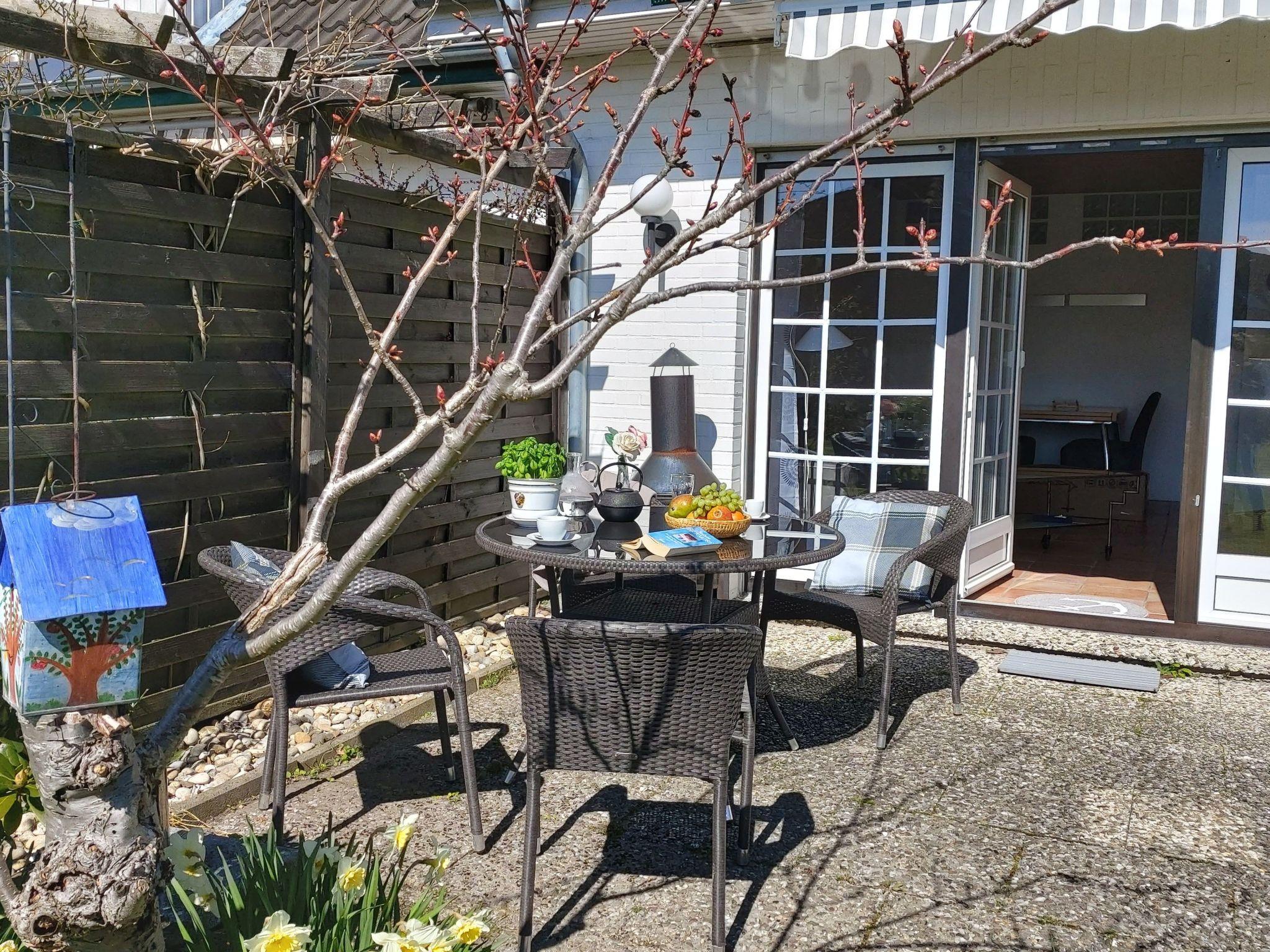 - 4 Stühlen und rundem Tisch, die gut im kleinen Gartenhäuschen untergebracht werden können.