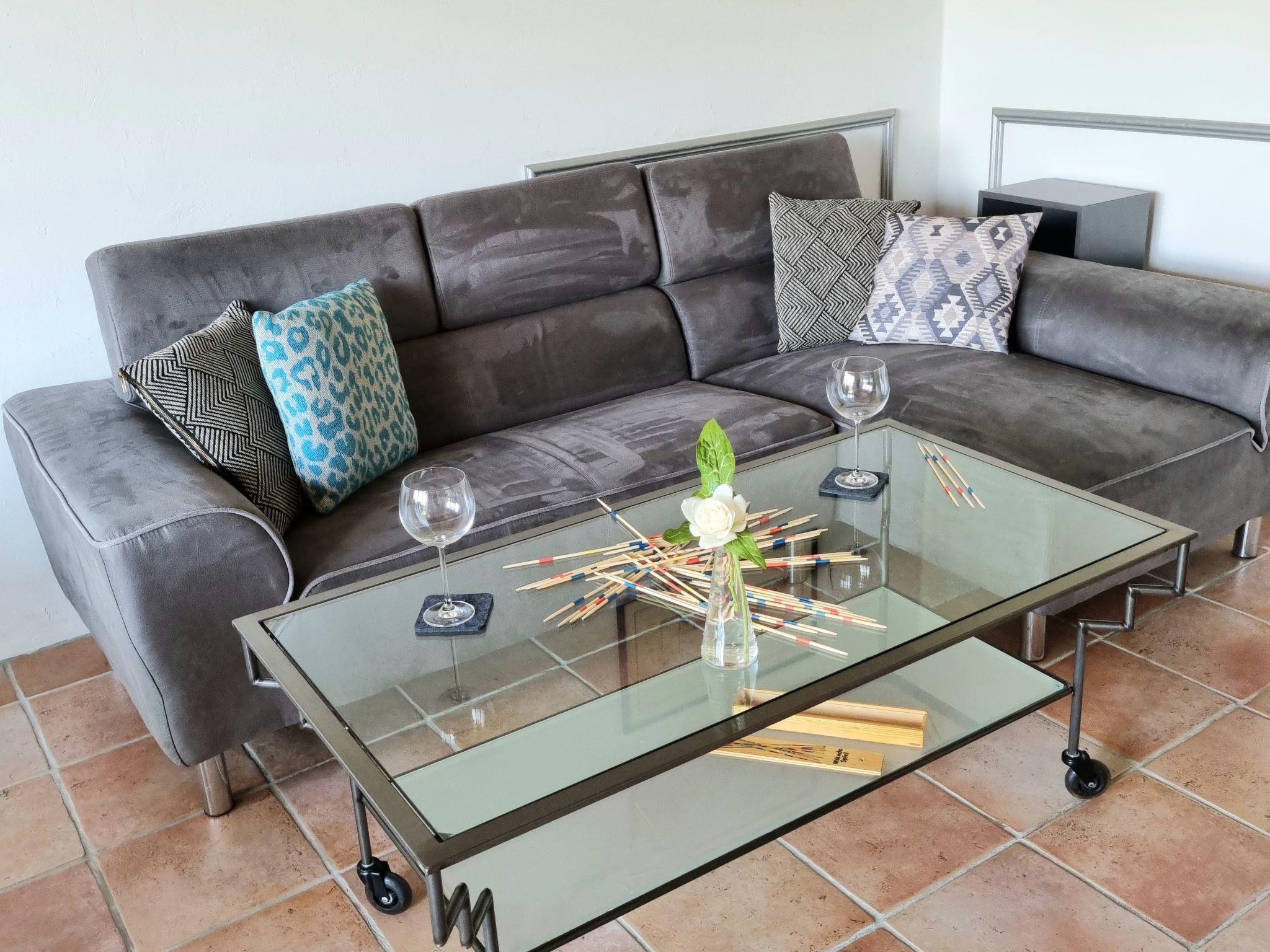 - Wohnzimmer mit komfortablem Ecksofa mit verstellbaren Kopfpolstern zum entspannten Fernsehen, DVD schauen, Musik hören, klönen oder lesen...