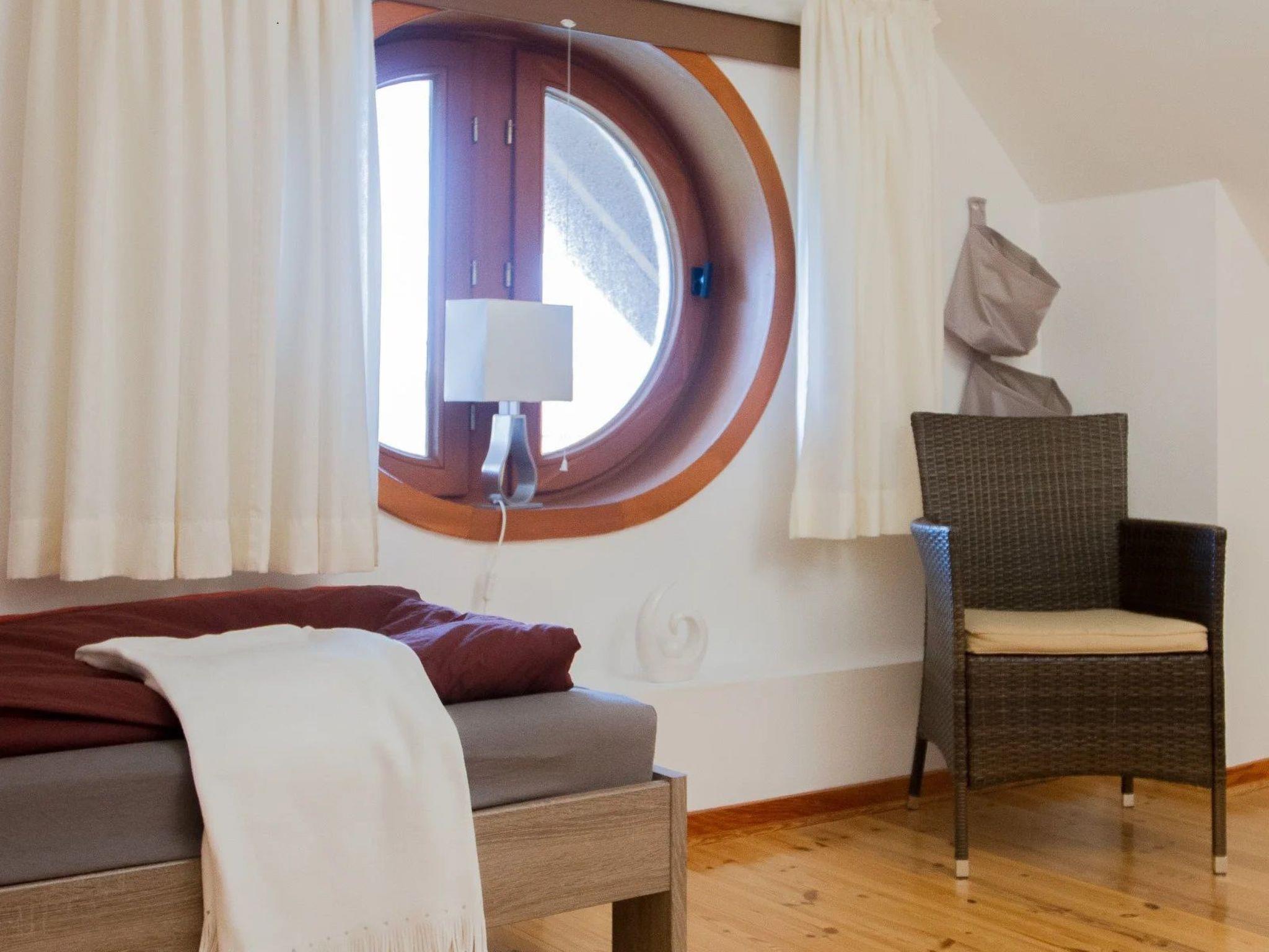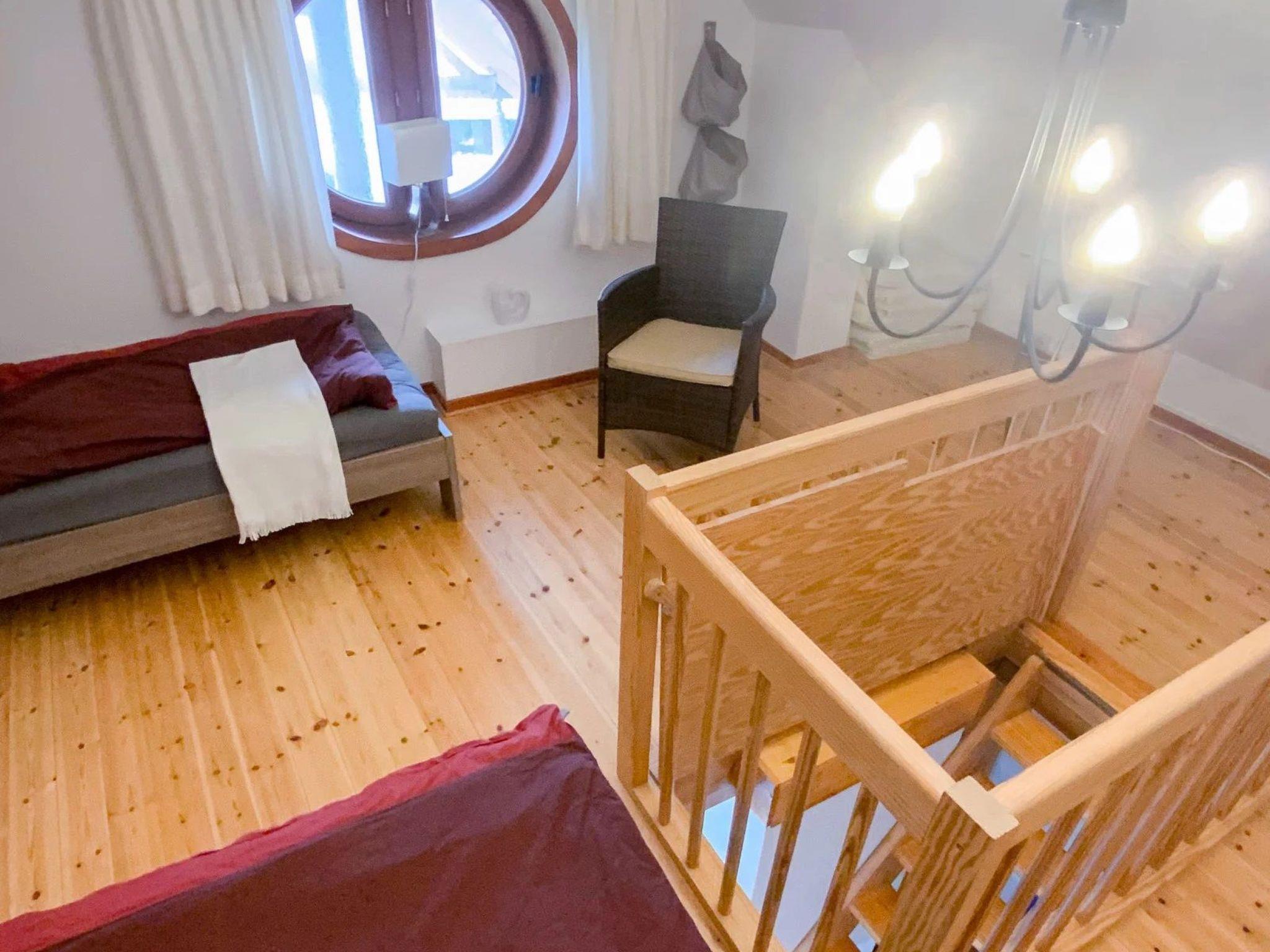 Die Ferienwohnung »Moin Moin« ist ein zweistöckiges Apartment im Ober- und Dachgeschoss eines attraktiven Designer-Hauses, das mit maritimen Stilelementen spielt. Die gerundeten Fenster, die sich weit über die Hausecken erstrecken, ermöglichen einen herrlichen Panoramablick.