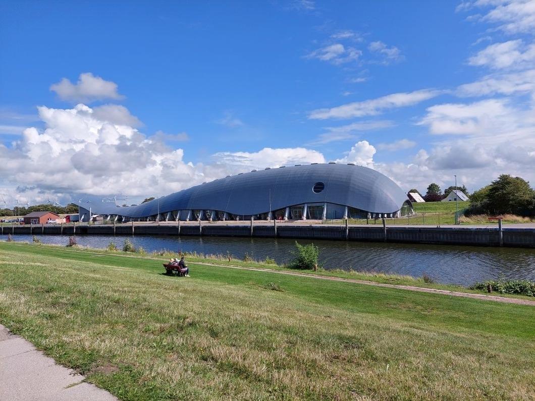 Die Spielscheune "Wal Willy" ist direkt gegenüber auf der anderen Hafenseite gelegen.