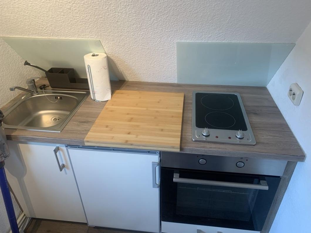 Die kleine Küche verfügt über ein 2-Platten Ceranfeld, Backofen & Kühlschrank.