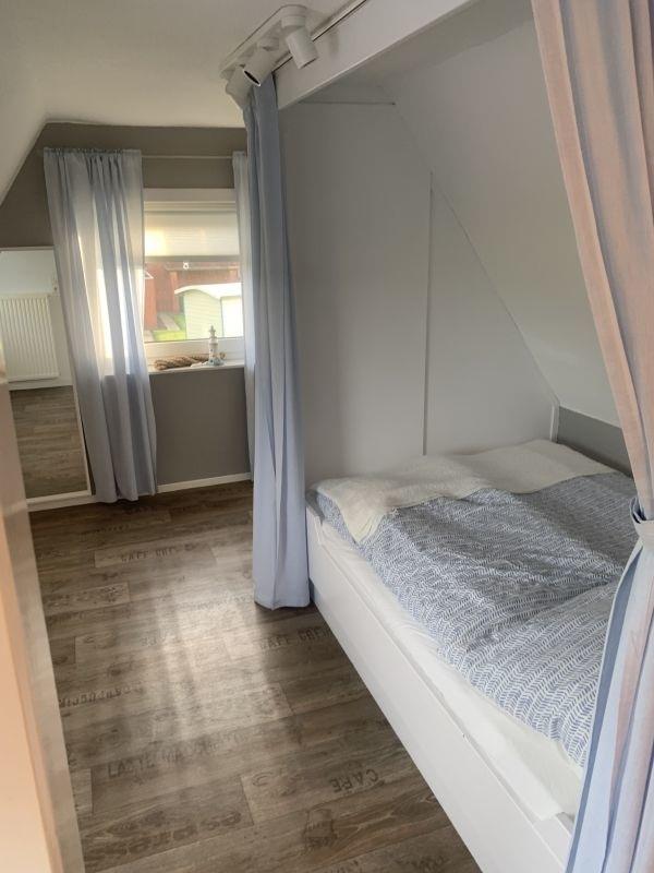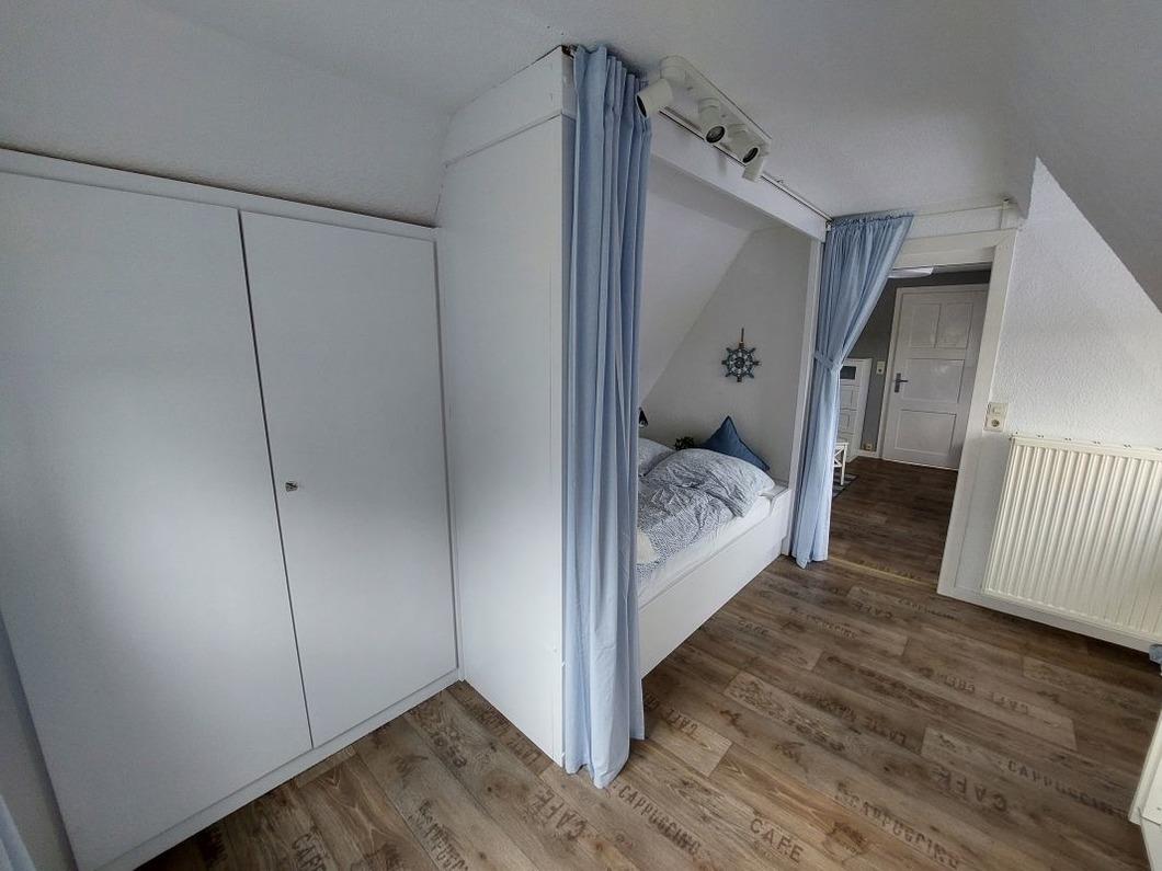 Das Schlafzimmer hat ein Kojen-Bett (140 cm breit x 200 cm lang),