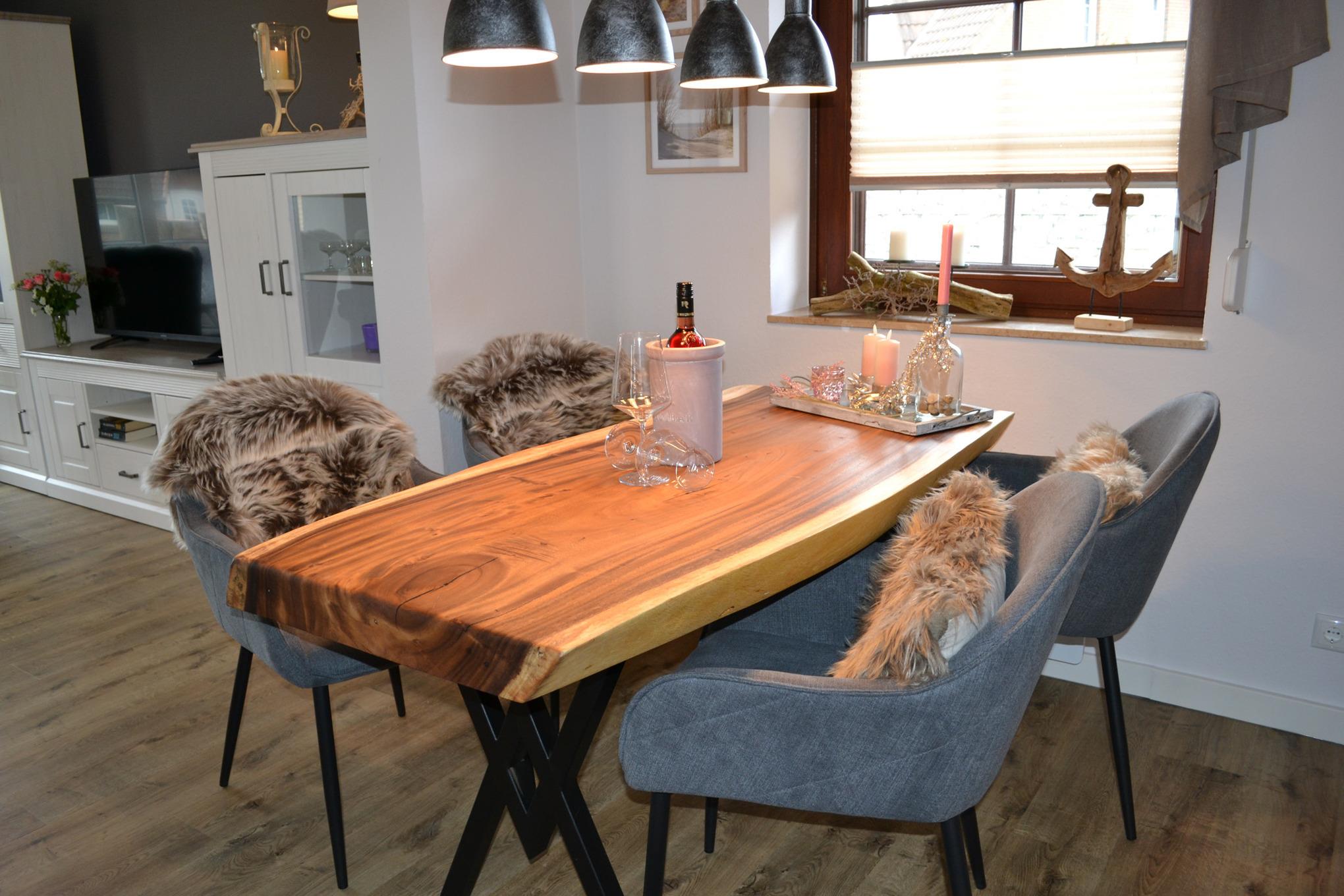 Im Ferienhaus "Nordseeruhe" erwartet Sie ab Juli 2023 ein gemütlicher Wohn- und Essbereich im offenen Stil. Die Küche ist räumlich abgetrennt und erstrahlt in neuem Glanz. Sie ist mit einem großen Kühlschrank, Backofen, Cerankochfeld, Spülmaschine und allen Küchenutensilien ausgestattet. Vom Wohnbereich aus gelangen Sie durch einen Wintergarten direkt auf die Terrasse. Die Terrasse ist überdacht und mit komfortablen Gartenmöbeln sowie einem eigenen Strandkorb ausgestattet, sodass gemütlichen Grillabenden an der frischen Nordseeluft nichts im Wege steht. An kälteren Tagen können Sie vor dem Kamin im Wohnbereich entspannte Stunden verbringen.
