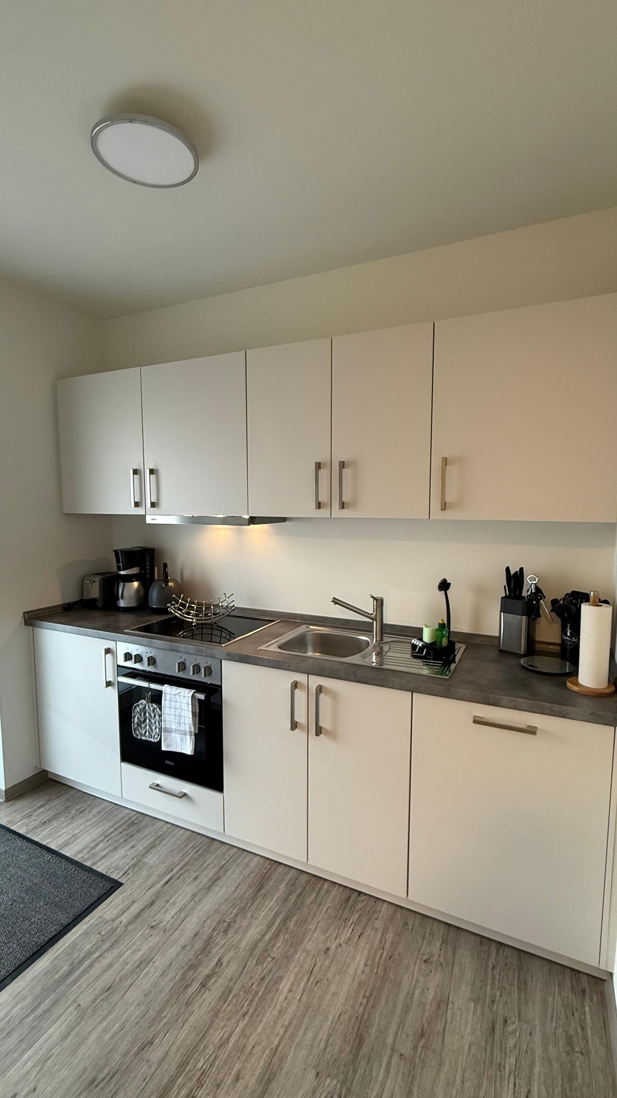 Die gut ausgestattete Küche besitzt unter anderem einen Toaster und eine Kaffeemaschine.