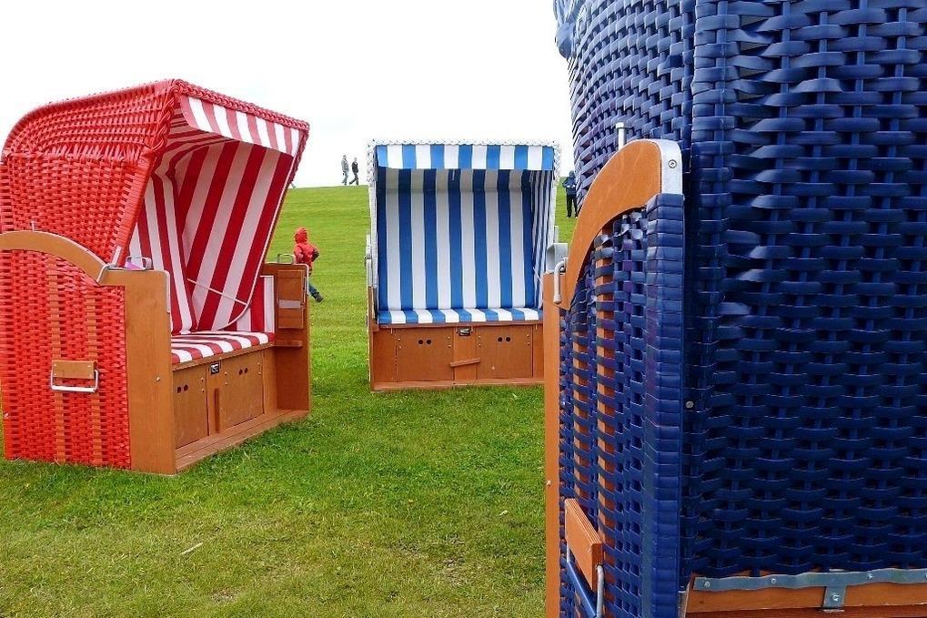 Der Badestrand in Spitze bietet jedem ein sonniges Plätzchen, bewachten Badestrand, viele Strandkörbe auf sanft ansteigendem grünem Deich. Das flache Wasser ist ideal für kleine Kinder zum Spielen, Plantschen.