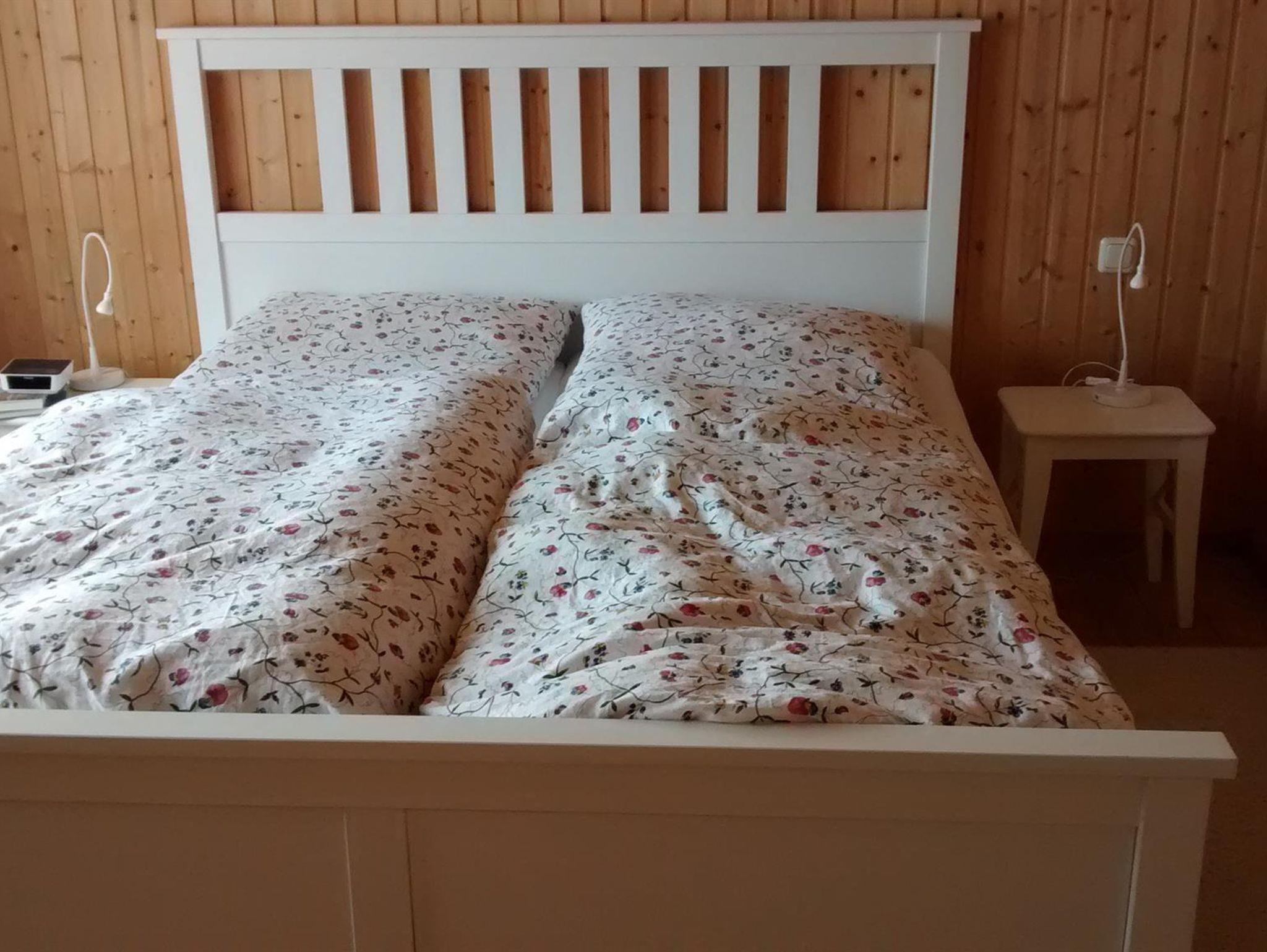 Im Erdgeschoss befinden sich das Wohnzimmer, die Wohnküche mit Sitzecke und das Gäste- WC. Die Küche ist komplett ausgestattet mit Toaster, Kaffeemaschine, Wasserkocher, Mikrowelle und Geschirrspüler. Im Obergeschoss liegen das Schlafzimmer mit Doppelbett, ein Ankleidezimmer, ein Badezimmer mit Badewanne und Fön, sowie die beiden ineinander übergehenden Zimmer mit Einzelbetten.