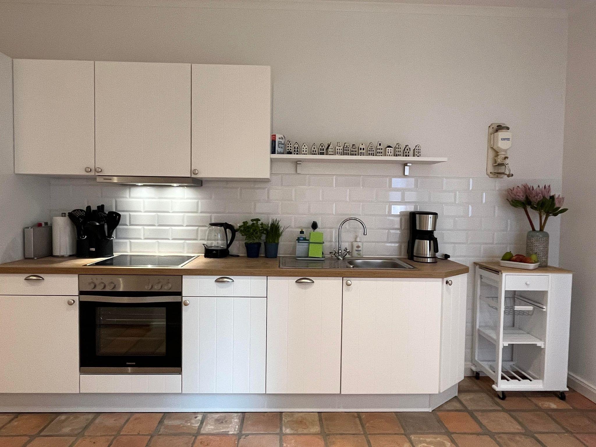 Der Küchenbereich, der sich offen im Loft befindet hat eine Spülmaschine, Kühlschrank mit Eisfach und eine große Ausstattung von allem was das Herz begehrt, wenn man einen längeren Urlaub plant und gerne kocht. Es gibt ein Badezimmer mit ebenerdiger Dusche, WC und Waschbecken.