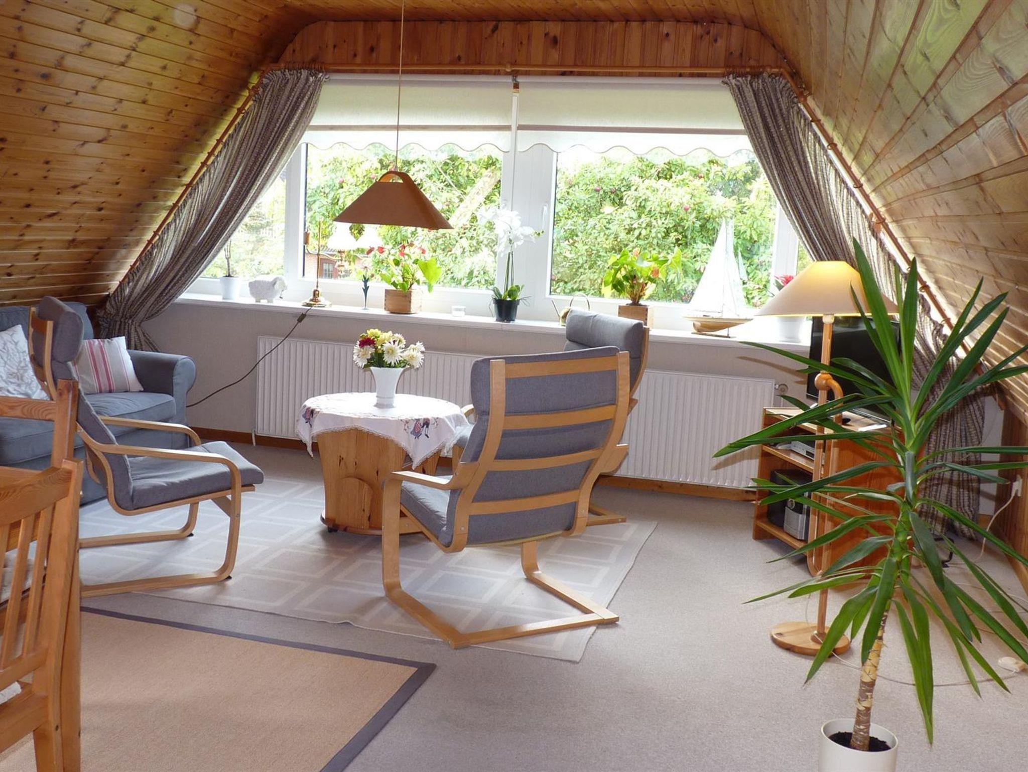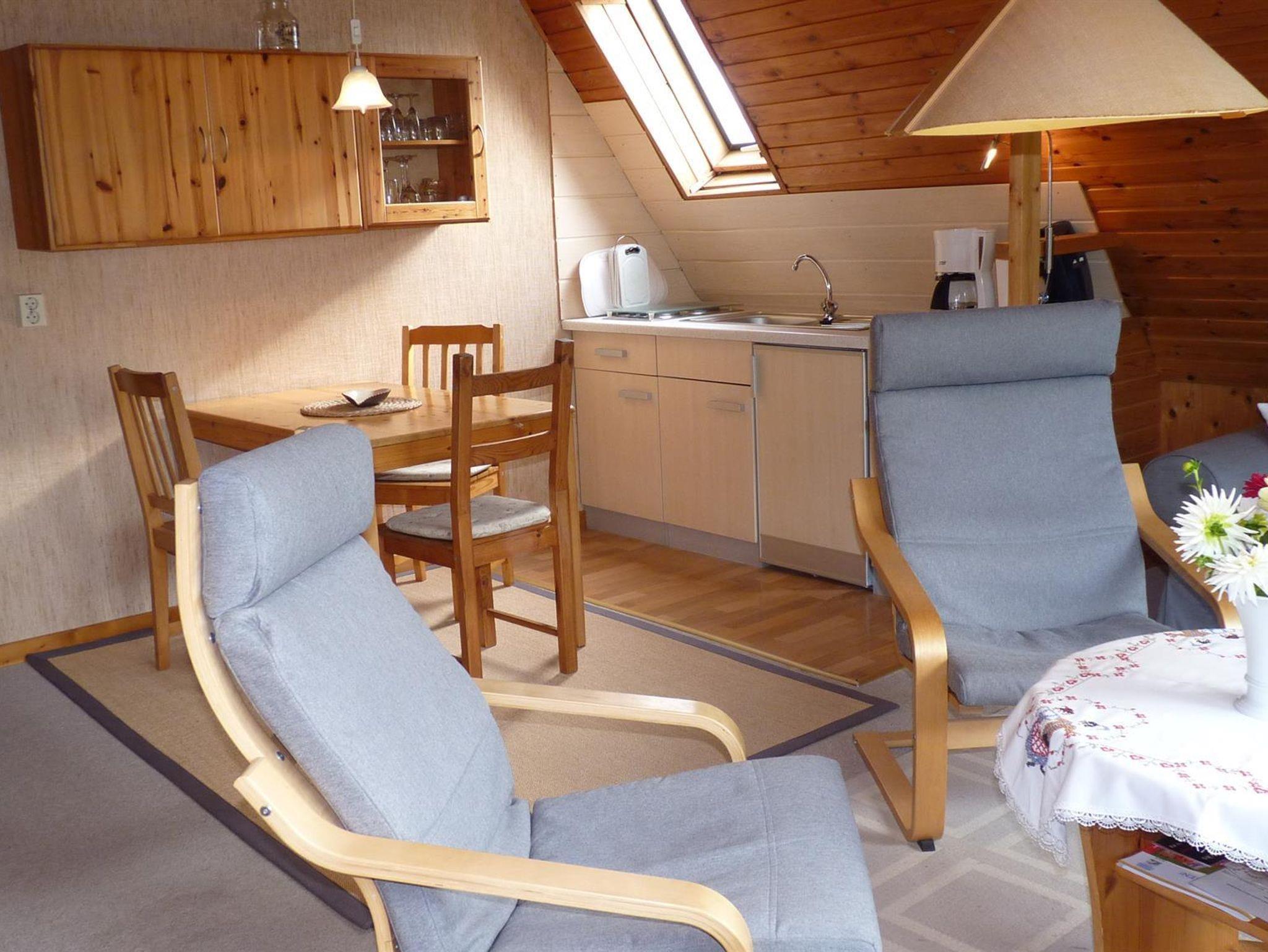 Offene Küche komplett eingerichtet. Kabel-TV, Radio, Wohnzimmer und Schlafzimmer im skandinavischen Stil.