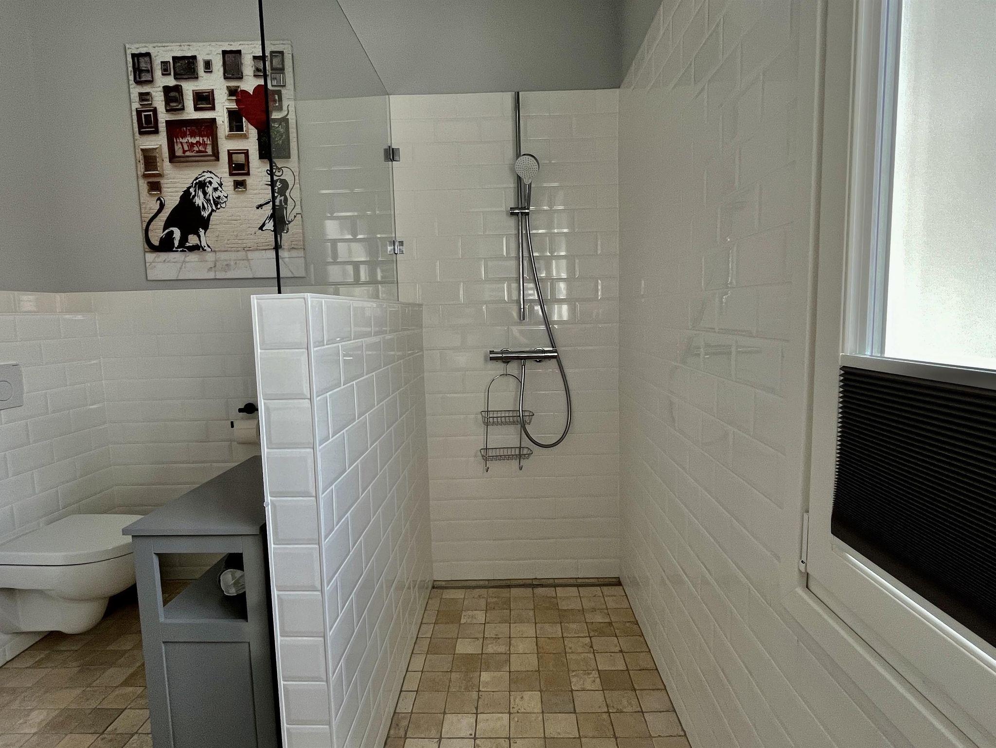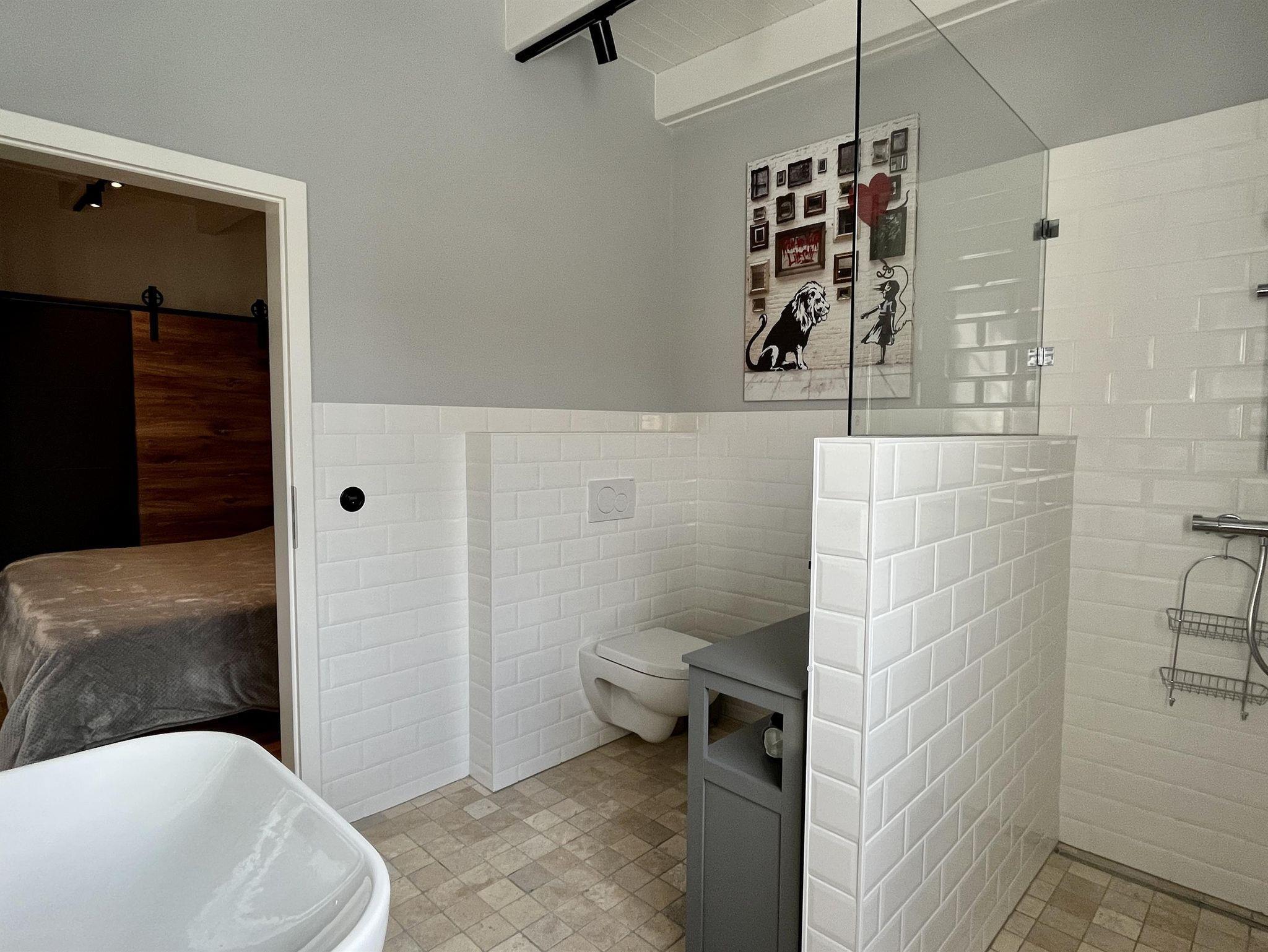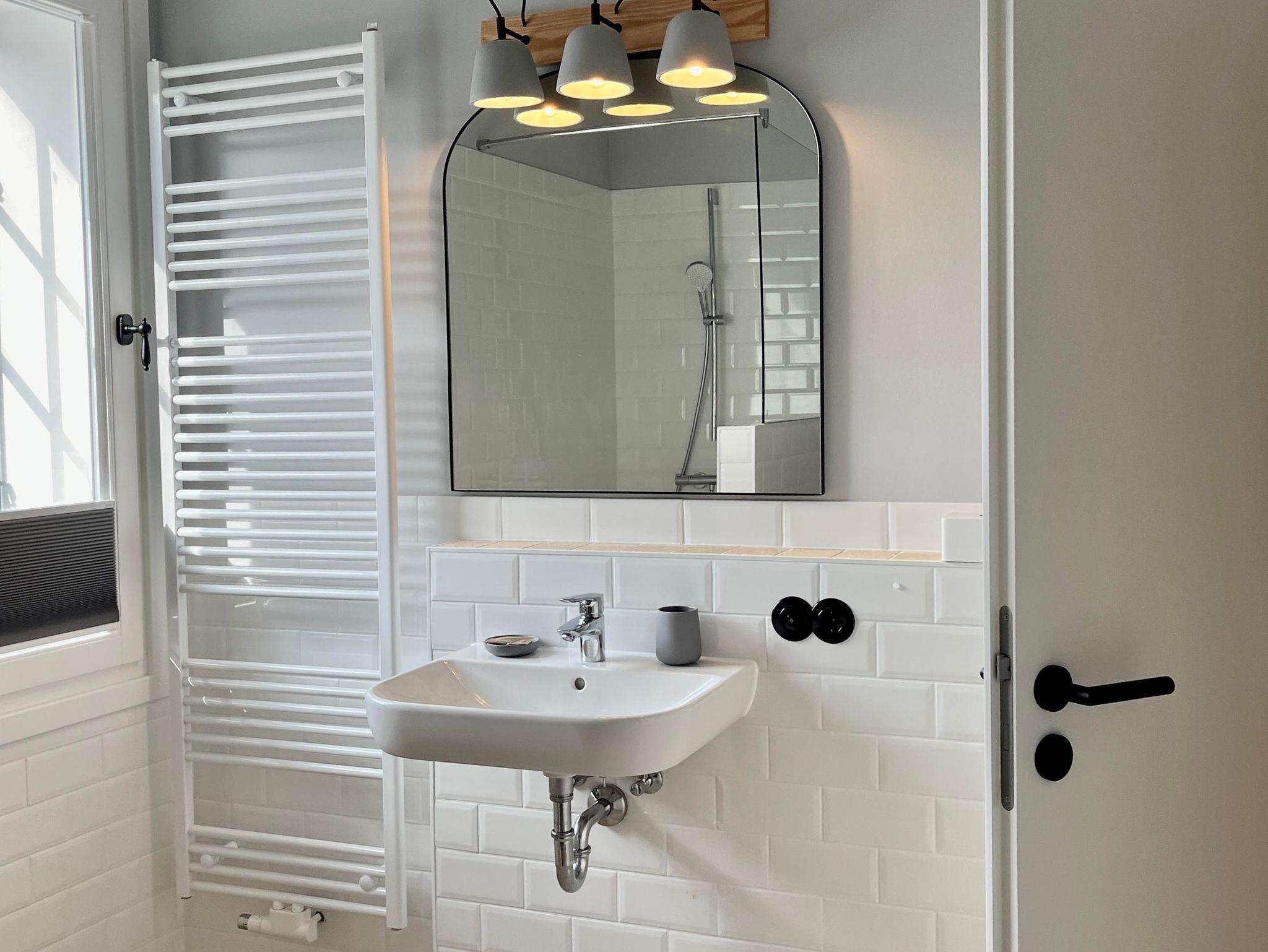 Der Küchenbereich, der sich offen im Loft befindet hat eine Spülmaschine, Kühlschrank mit Eisfach und eine große Ausstattung von allem was das Herz begehrt, wenn man einen längeren Urlaub plant und gerne kocht. Es gibt ein Badezimmer mit Fenster zum Innenhof mit ebenerdiger Dusche, WC, Waschbecken und Handtuchwämer.