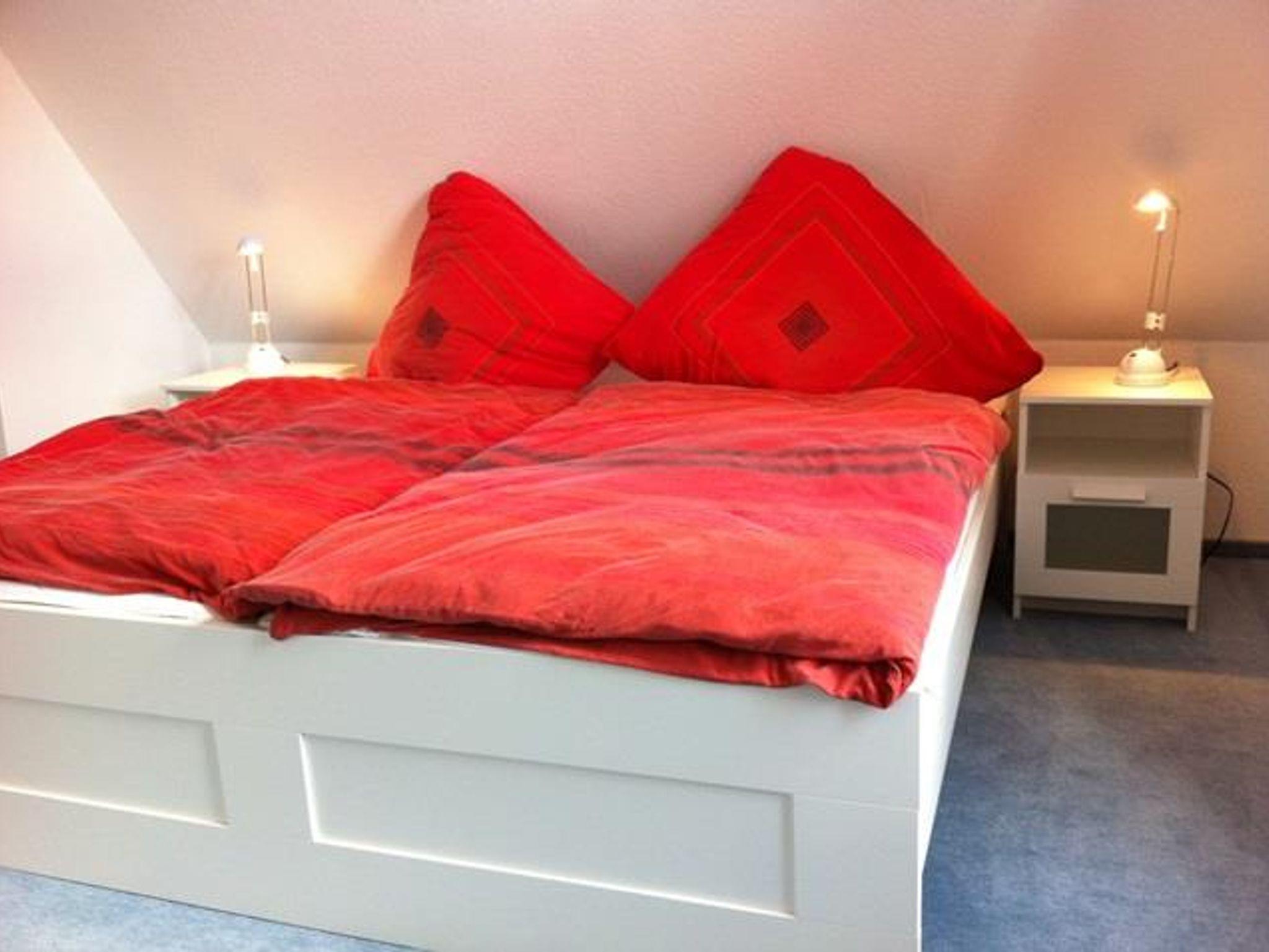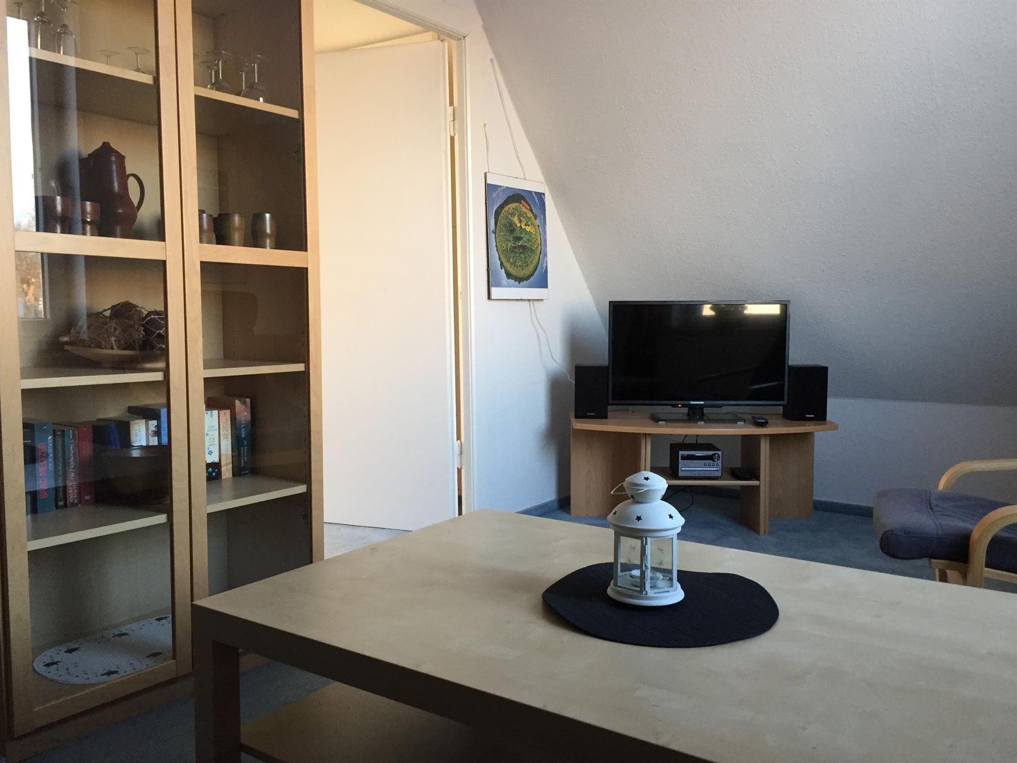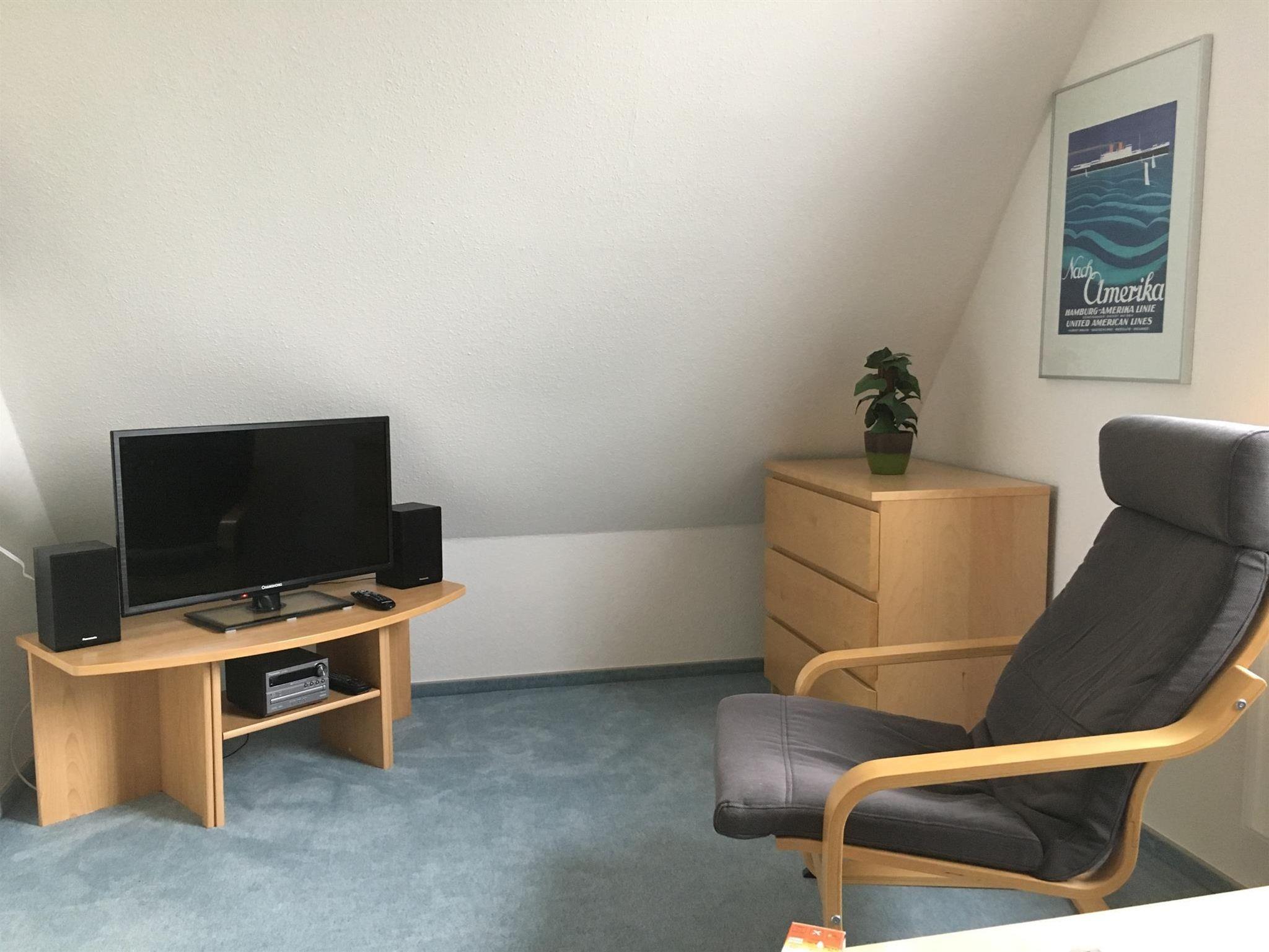 Im ersten Stock befindet sich das Schlafzimmer und ein kleines, gemütliches Wohnzimmer. Beide Räume im Obergeschoss haben eine Dachschräge.