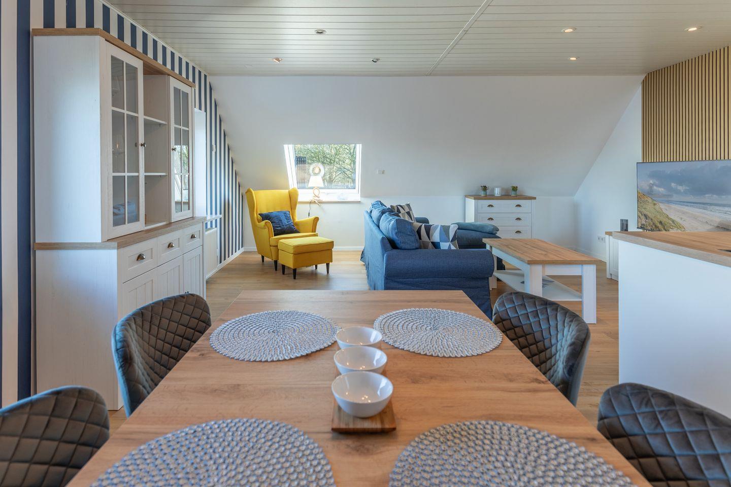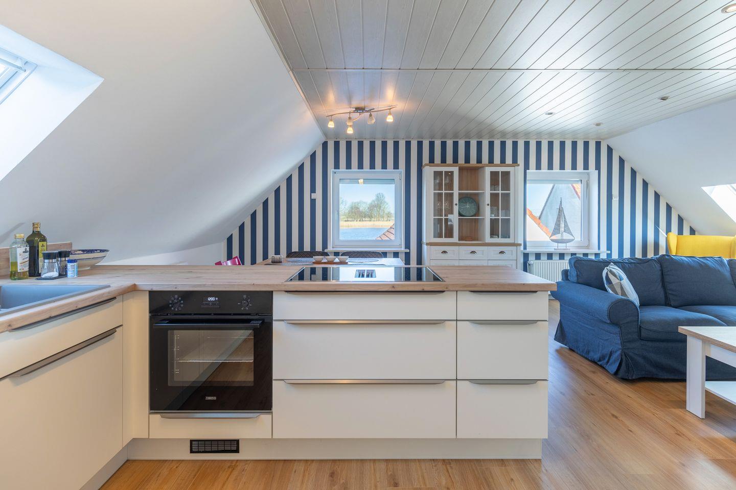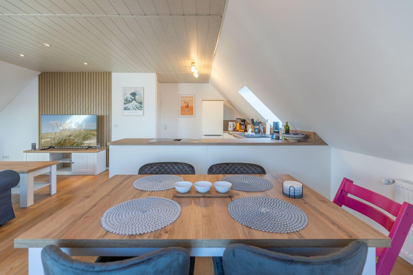 Die moderne, voll ausgestattete Küche lässt keine Wünsche offen: Ein Backofen, ein Kühlschrank, eine Spülmaschine sowie Kaffeemaschine, Wasserkocher und Toaster stehen Ihnen zur Verfügung. Ob ein ausgiebiges Frühstück oder ein romantisches Dinner – hier können Sie nach Herzenslust kochen. Der großzügige Essbereich lädt dazu ein, gemeinsame Mahlzeiten zu genießen und schöne Urlaubsmomente zu teilen.
