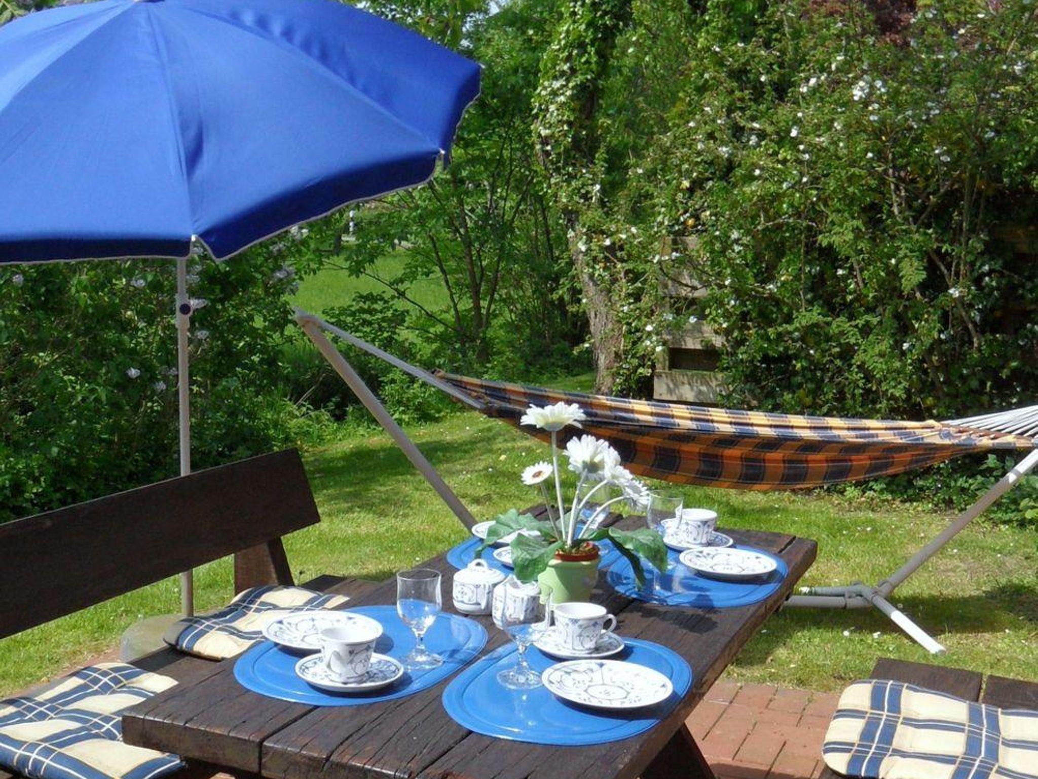 Ein besonderes Highlight ist der großzügige private Garten mit Blick ins Grüne, der mit Sonnenliegen, Gartenmöbeln, Hängematte und einem Kohlegrill ausgestattet ist. Kinder finden hier sowohl einen Sandkasten und eine Schaukel als auch ausreichend Platz zum Spielen und Entdecken. Babybetten und Hochstühle stehen für die jüngsten Gäste auf Anfrage bereit. Die Terrasse lädt zum Entspannen im Freien ein.